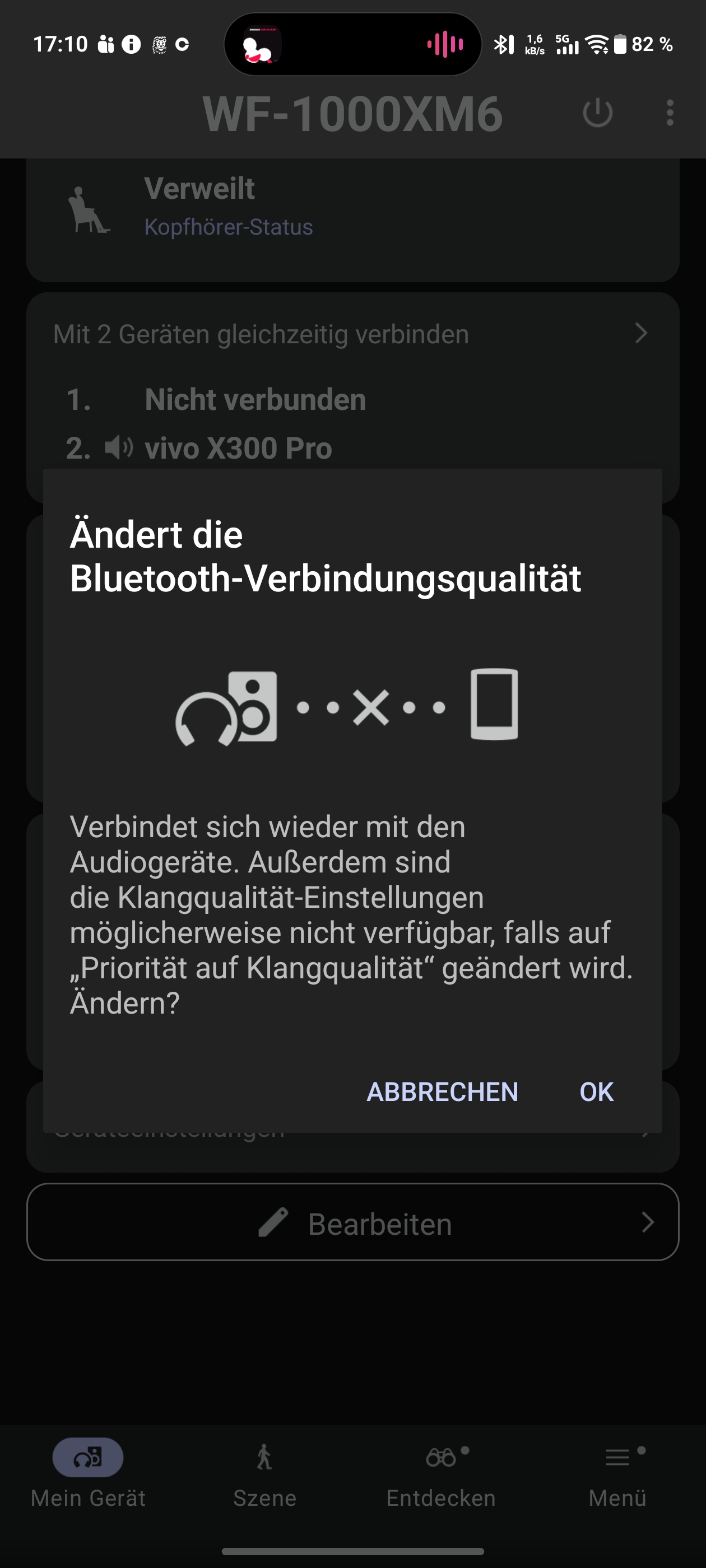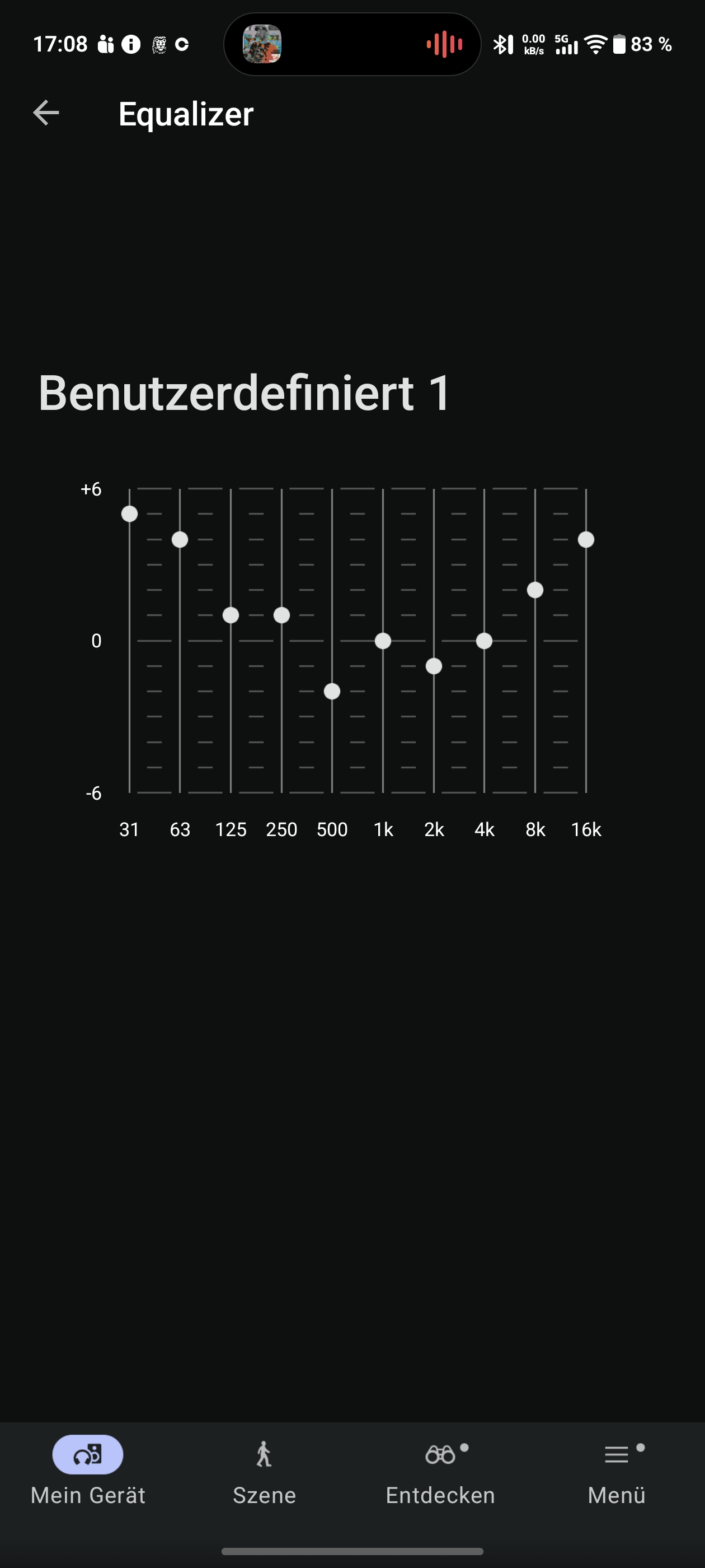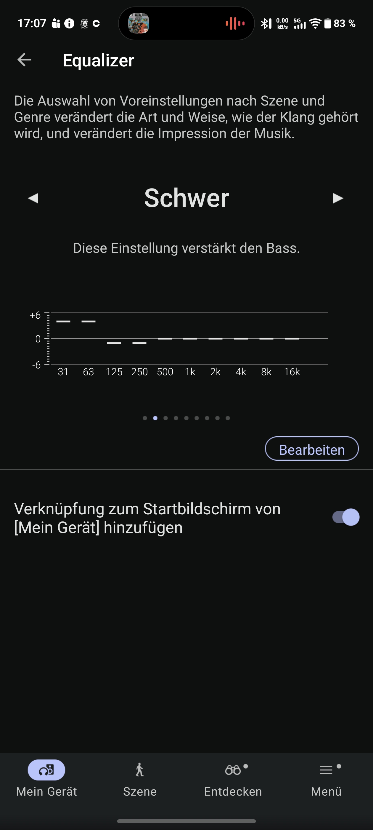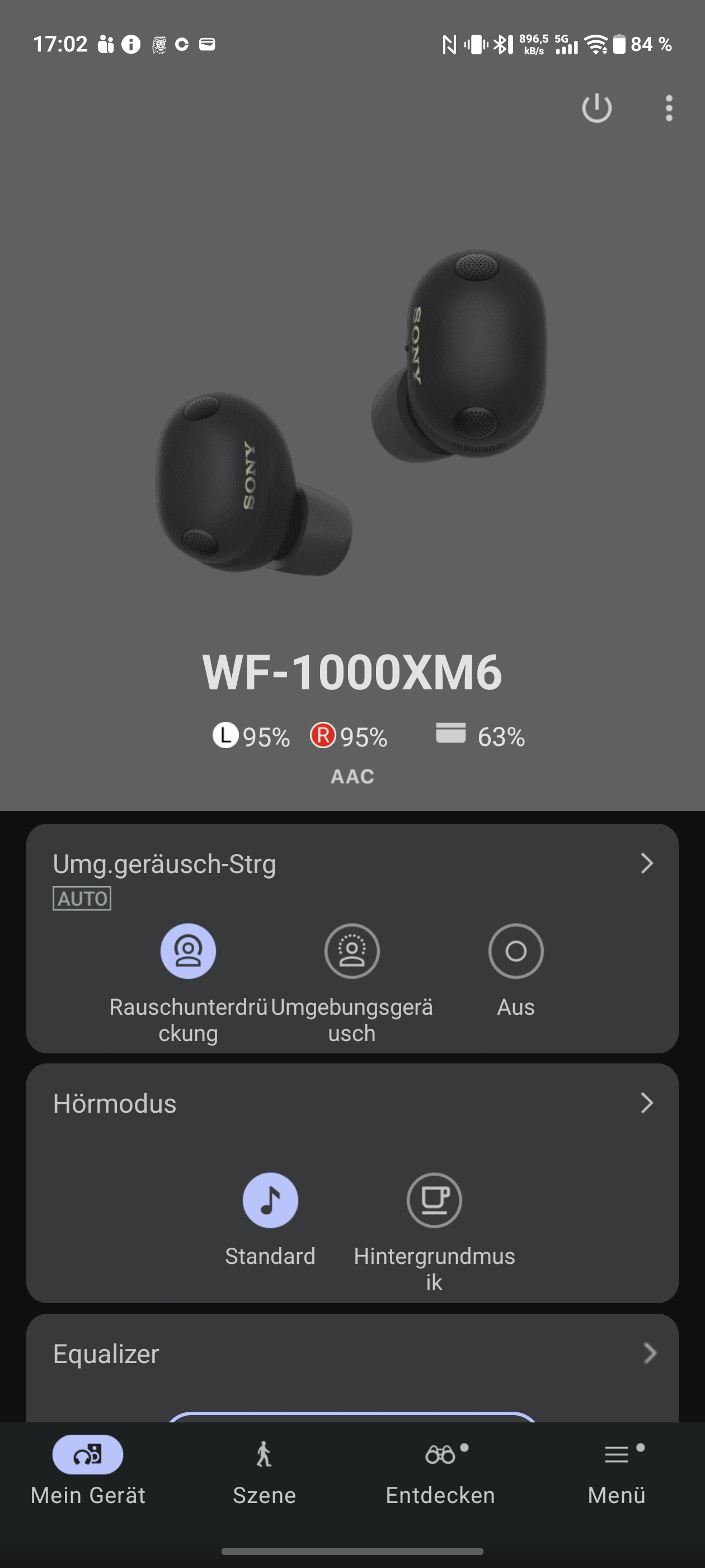 Die Grundabstimmung klingt nach Sony: warm, bassbetont, mit flachen Mitten und ausgewogenen Höhen. Die Instrumententrennung gelingt sehr gut, die Räumlichkeit überzeugt. ANC betont den Bass etwas stärker – das gibt manchen Tracks Wucht, wirkt bei anderen leicht schachtelig. Ohne ANC klingt es neutraler, aber weniger druckvoll. DSEE Extreme und LDAC liefern detaillierte, dynamische Wiedergabe. Verzerrungen bleiben selbst bei hoher Lautstärke minimal. Der 10-Band-EQ korrigiert die zurückgenommenen Mitten bei Bedarf präzise. Im Vergleich zum XM5 klingt der XM6 etwas differenzierter – ein Feinschliff, kein Generationssprung.