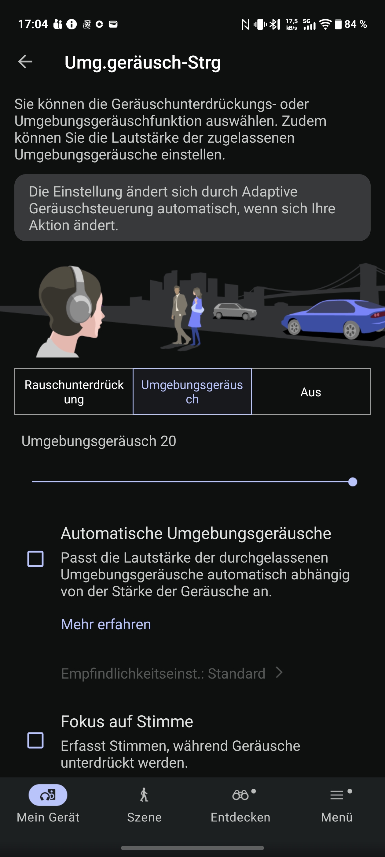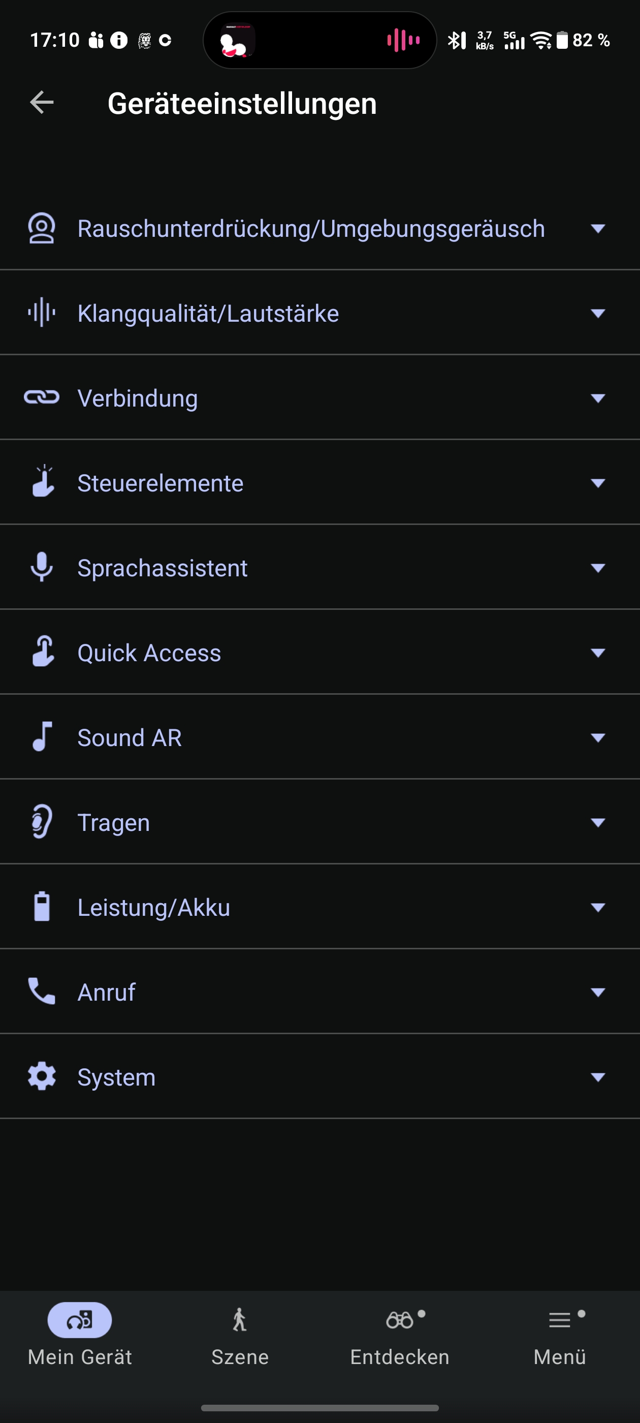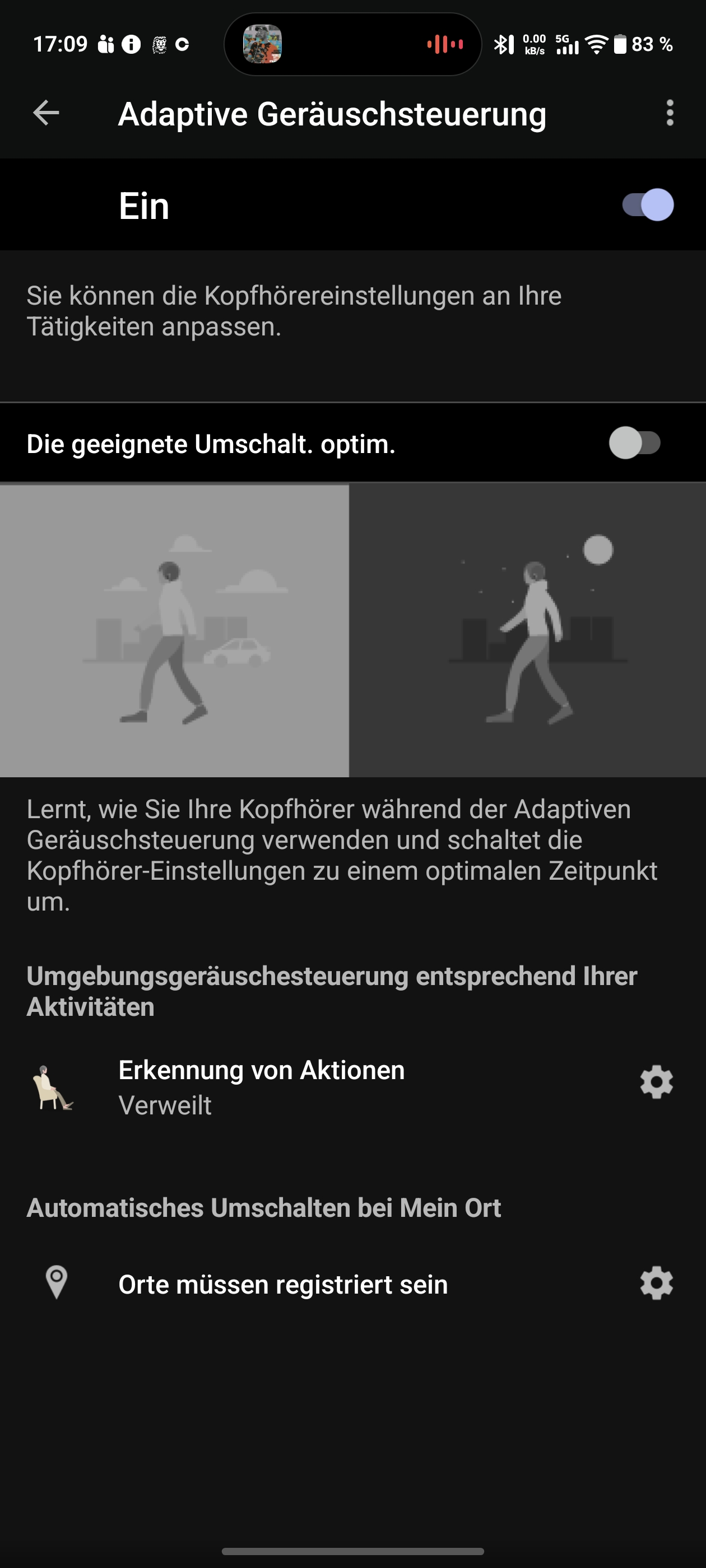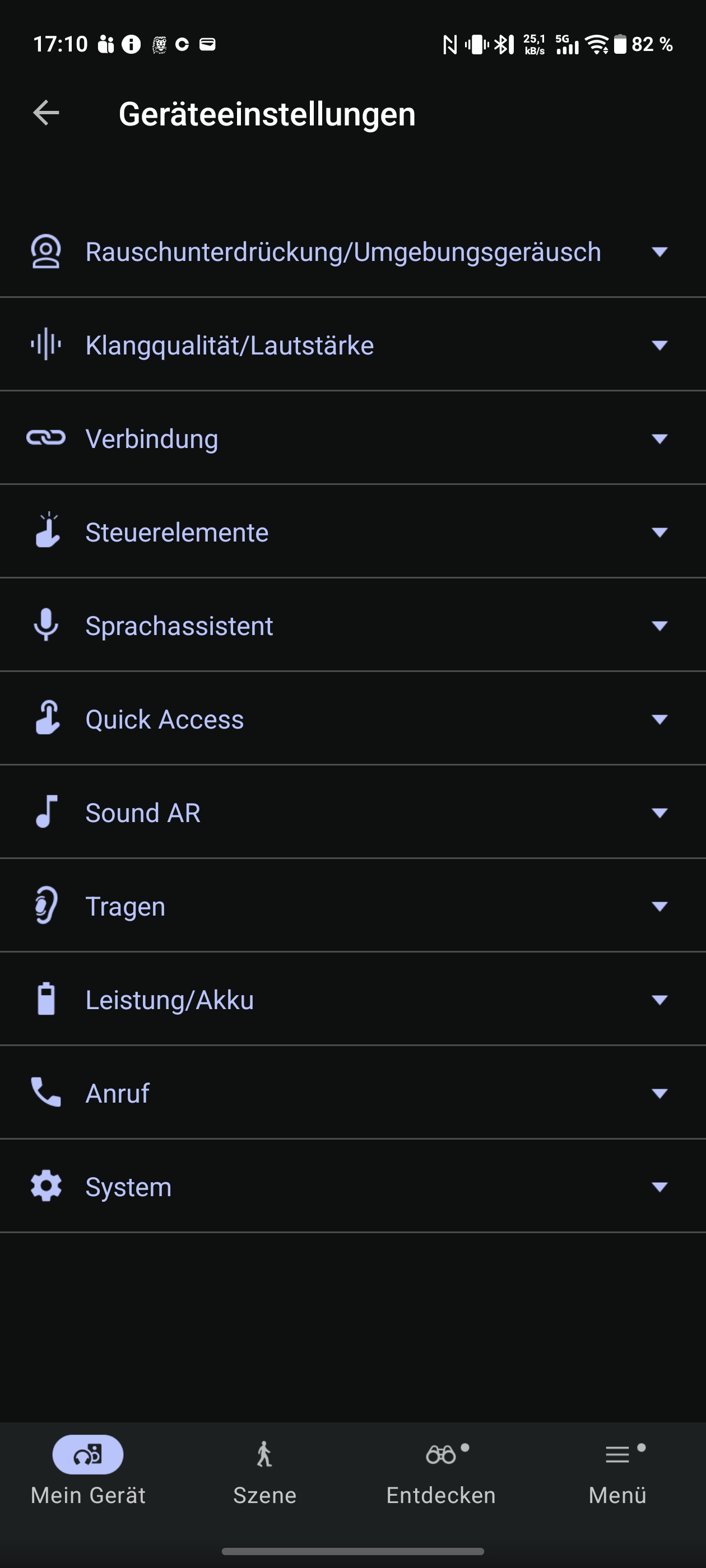 Die Sony Sound Connect App gehört zu den umfangreichsten am Markt. Ein 10-Band-Equalizer erlaubt genaue Klanganpassung – deutlich feiner als der EQ bei JBL oder die Presets bei Samsung. Adaptive Sound Control erkennt automatisch Bewegung sowie Umgebung und passt das ANC entsprechend an. Der Transparenzmodus lässt sich in 20 Stufen regeln und auf Stimmen fokussieren. Speak-to-Chat pausiert die Musik beim Sprechen automatisch. Doch nicht alles an der App gefällt uns. So wirkt die Oberfläche unübersichtlich und es gibt einige Menüs doppelt.