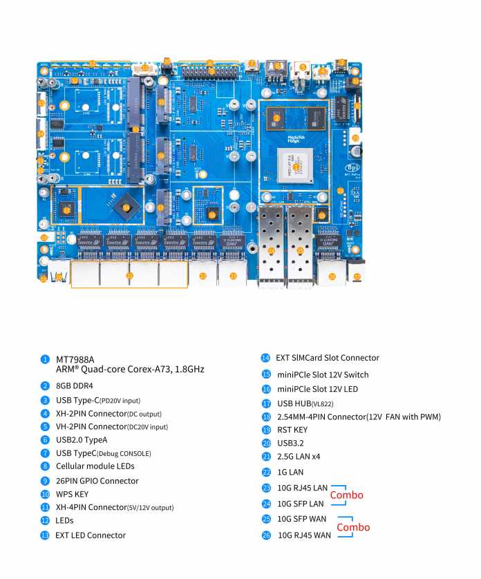Der Mediatek-Prozessor bindet zahlreiche Zusatzchips per PCI Express und USB an. Zwei Schächte in der Bauform Small Form-Factor Pluggable (SFP+) nehmen Lichtwellenleiter- und Ethernet-Module auf und übertragen bis zu 10 Gbit/s. Zwei RJ45-Buchsen sind ebenfalls für bis zu 10 Gbit/s ausgelegt. Es handelt sich um Kombianschlüsse hinter zwei Netzwerk-Controllern; aus einem RJ45-SFP+-Paar ist also je ein Anschluss nutzbar.
