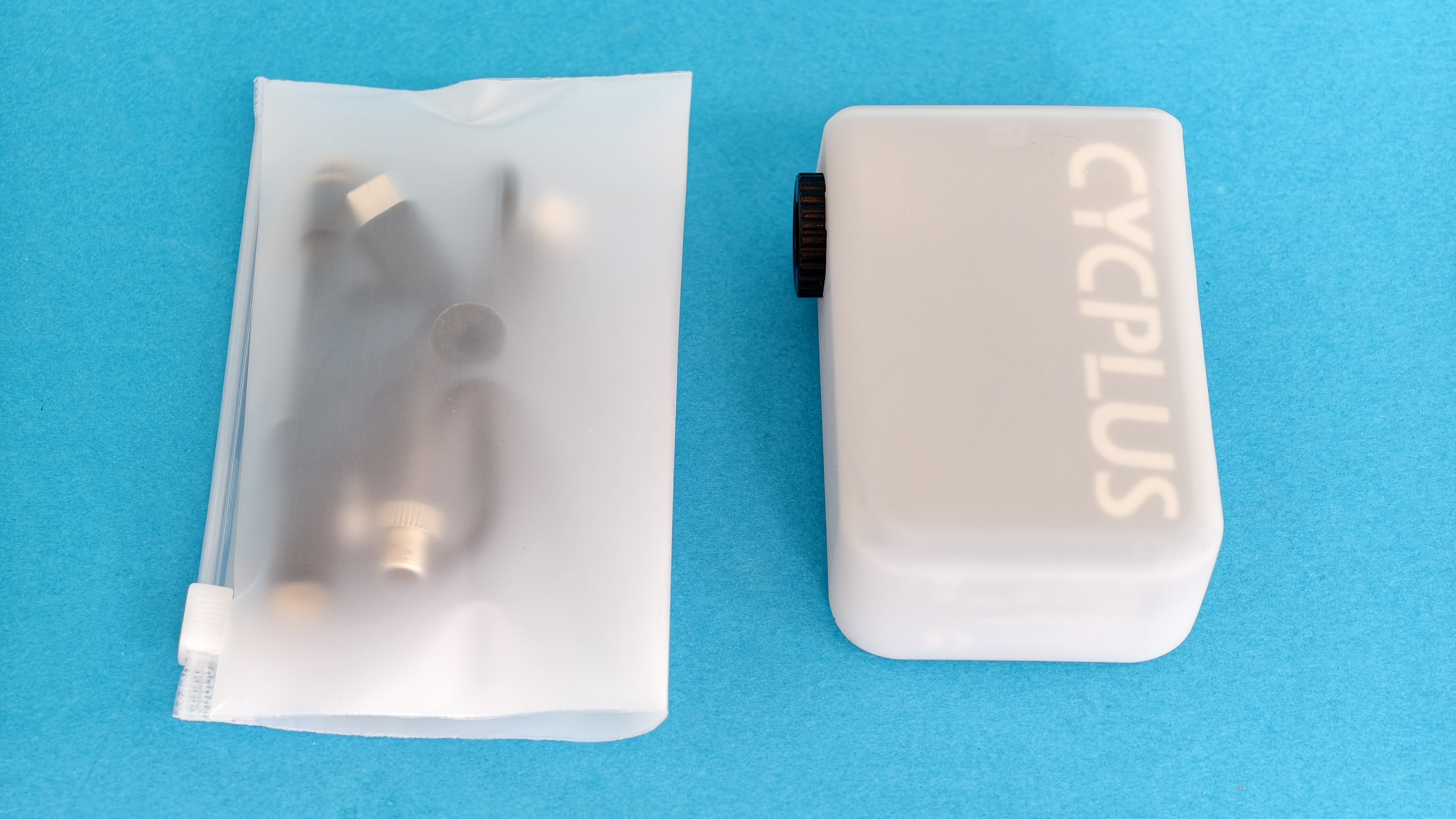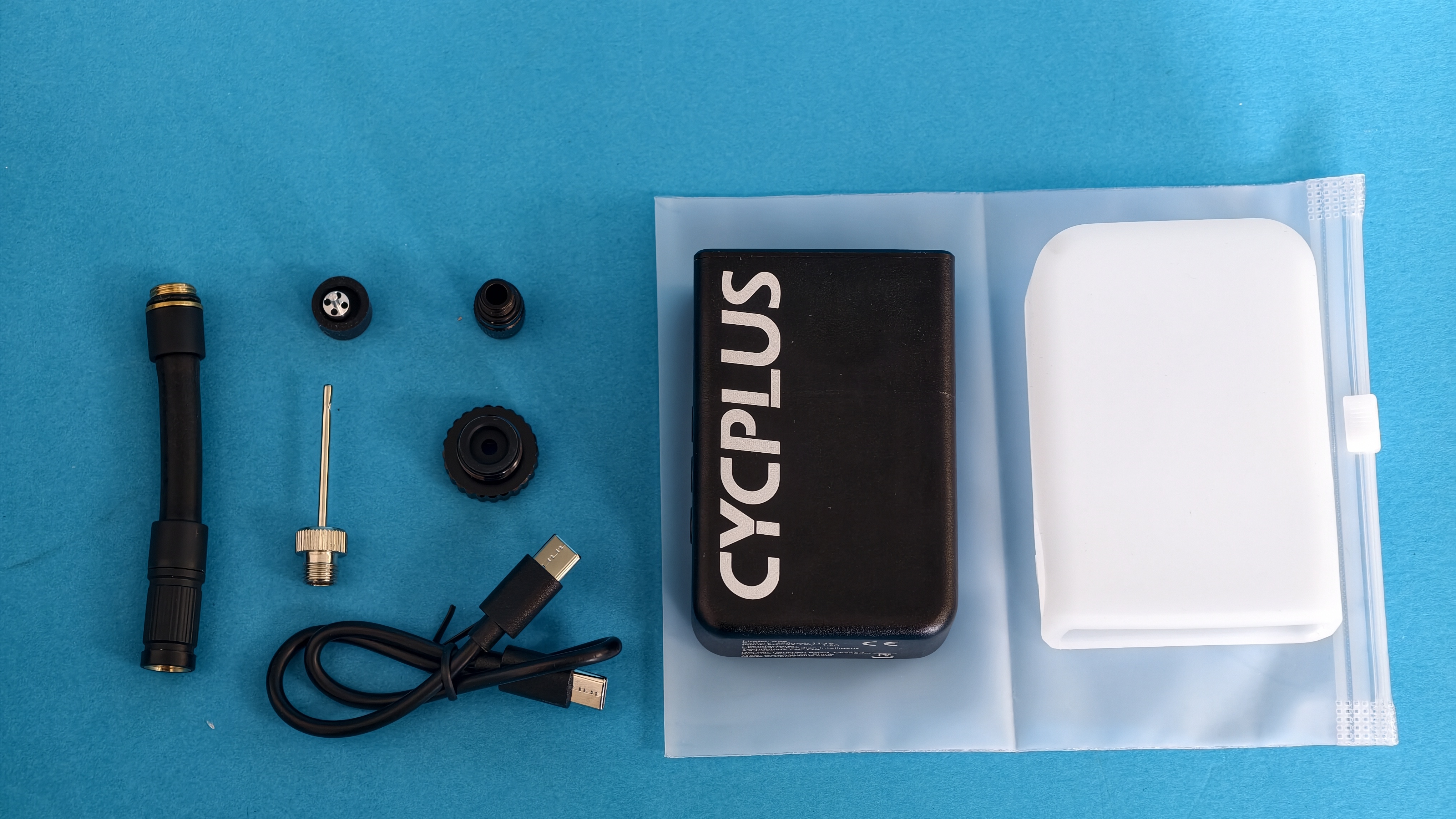 Cycplus packt alles Nötige in die Verpackung. Neben der Pumpe und der Silikonhülle liegen ein wasserdichter Ziplock-Beutel, ein etwa 7 cm langer Verlängerungsschlauch, Adapter für Presta- und Schrader-Ventile, eine Ballnadel, ein Einsatz für Schrader-Ventile am Pumpkopf, Ersatzdichtungen und ein USB-C-Ladekabel bei. Der Ziplock-Beutel hält die kleinen Teile sicher zusammen.