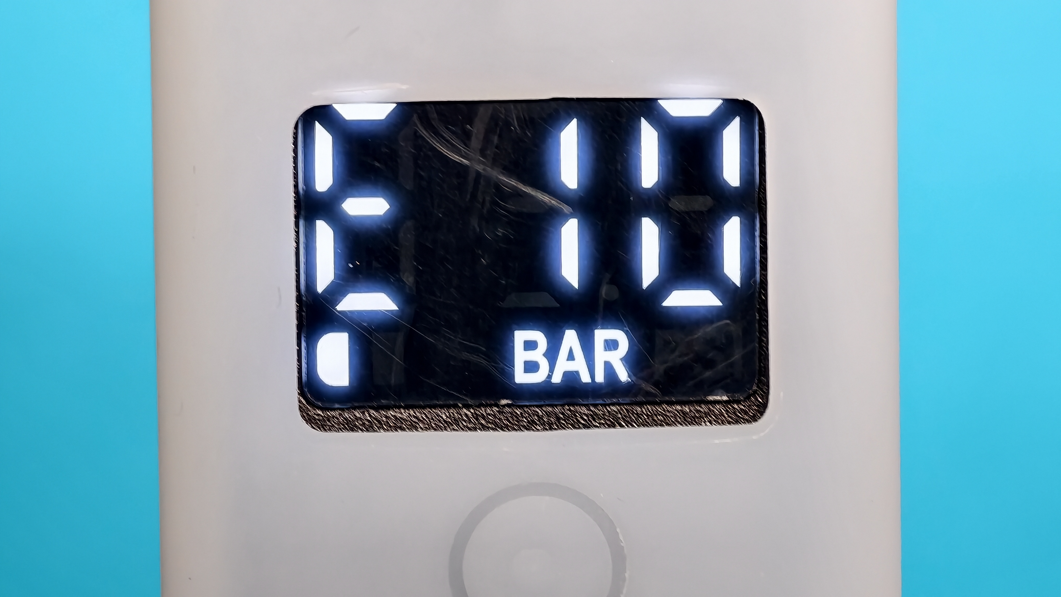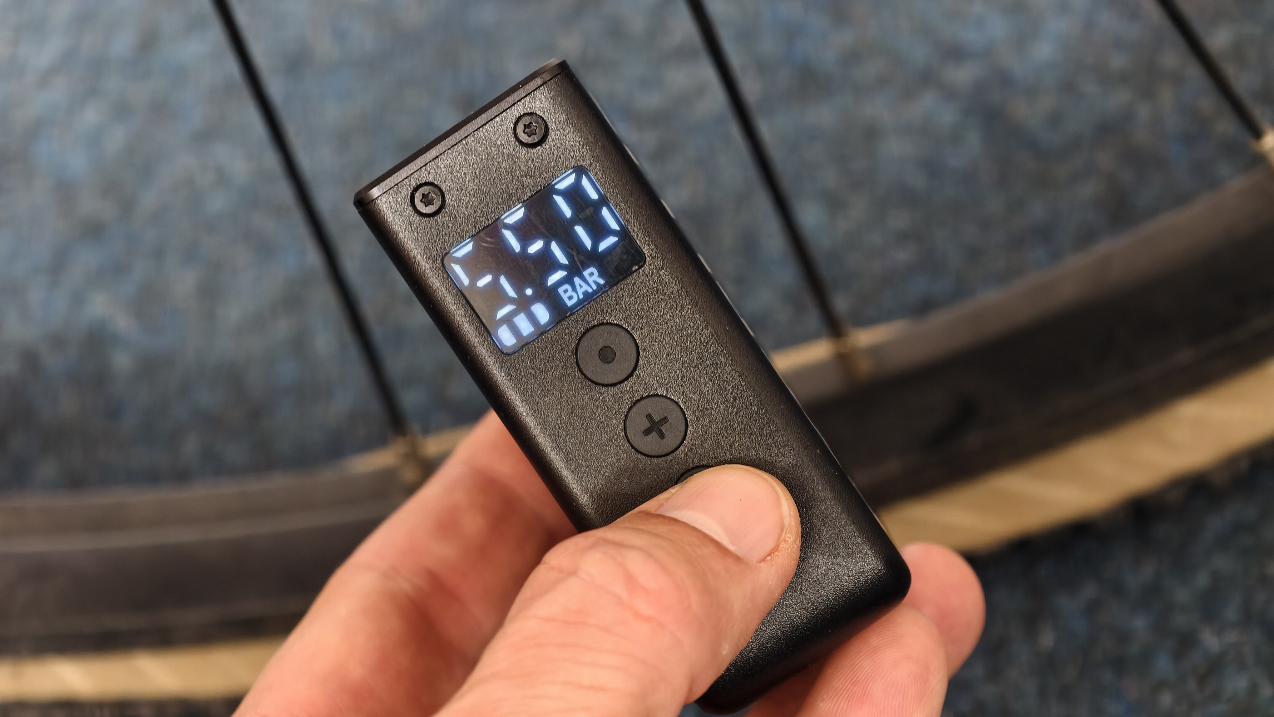 Ein langer Druck auf die Power-Taste schaltet die Pumpe ein. Über Plus und Minus stellt man den Zieldruck ein. Ein kurzer Druck auf Power startet den Pumpvorgang. Sobald der Wunschdruck erreicht ist, stoppt die Pumpe automatisch. Auch mit Handschuhen funktioniert die Bedienung problemlos. Im Vergleich zu displayfreien Modellen wie der Laotie Z1 Mini oder der Tiny Pump Cube ist die präzise Druckkontrolle ein klarer Vorteil – man pumpt nicht nach Gefühl, sondern auf den Punkt.