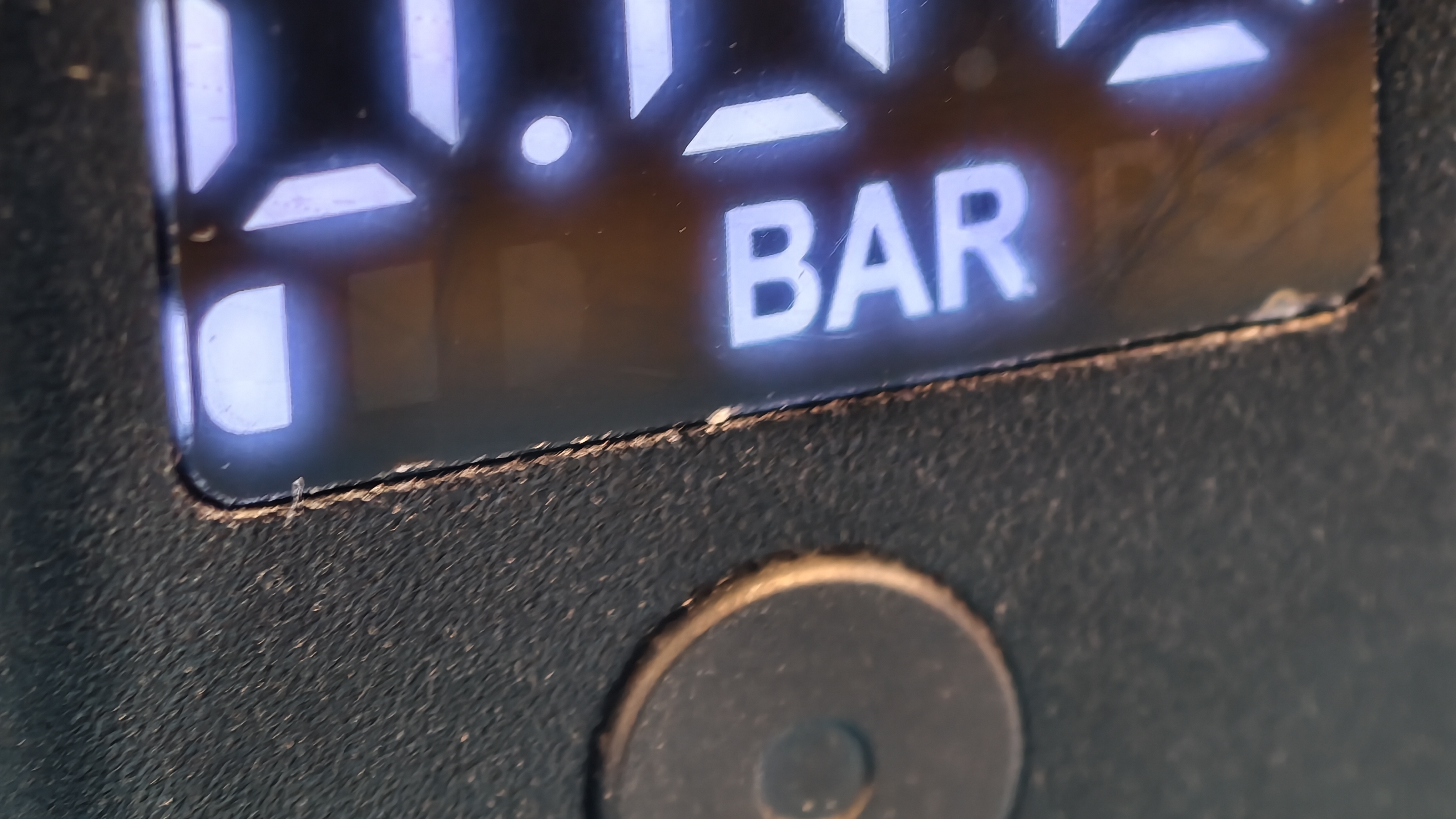 Das etwa 2 × 1,5 cm große Display leuchtet selbstständig. Es lässt sich bei Nacht und bei direkter Sonneneinstrahlung gut ablesen. Angezeigt werden der aktuelle Reifendruck in Echtzeit, der eingestellte Zieldruck, der Akkustand und die gewählte Druckeinheit. Zwischen PSI und Bar kann umgeschaltet werden. Die Druckmessung arbeitet laut Hersteller mit einer Genauigkeit von ±0,07 bar und zeigt Werte auf 0,05 bar genau an.