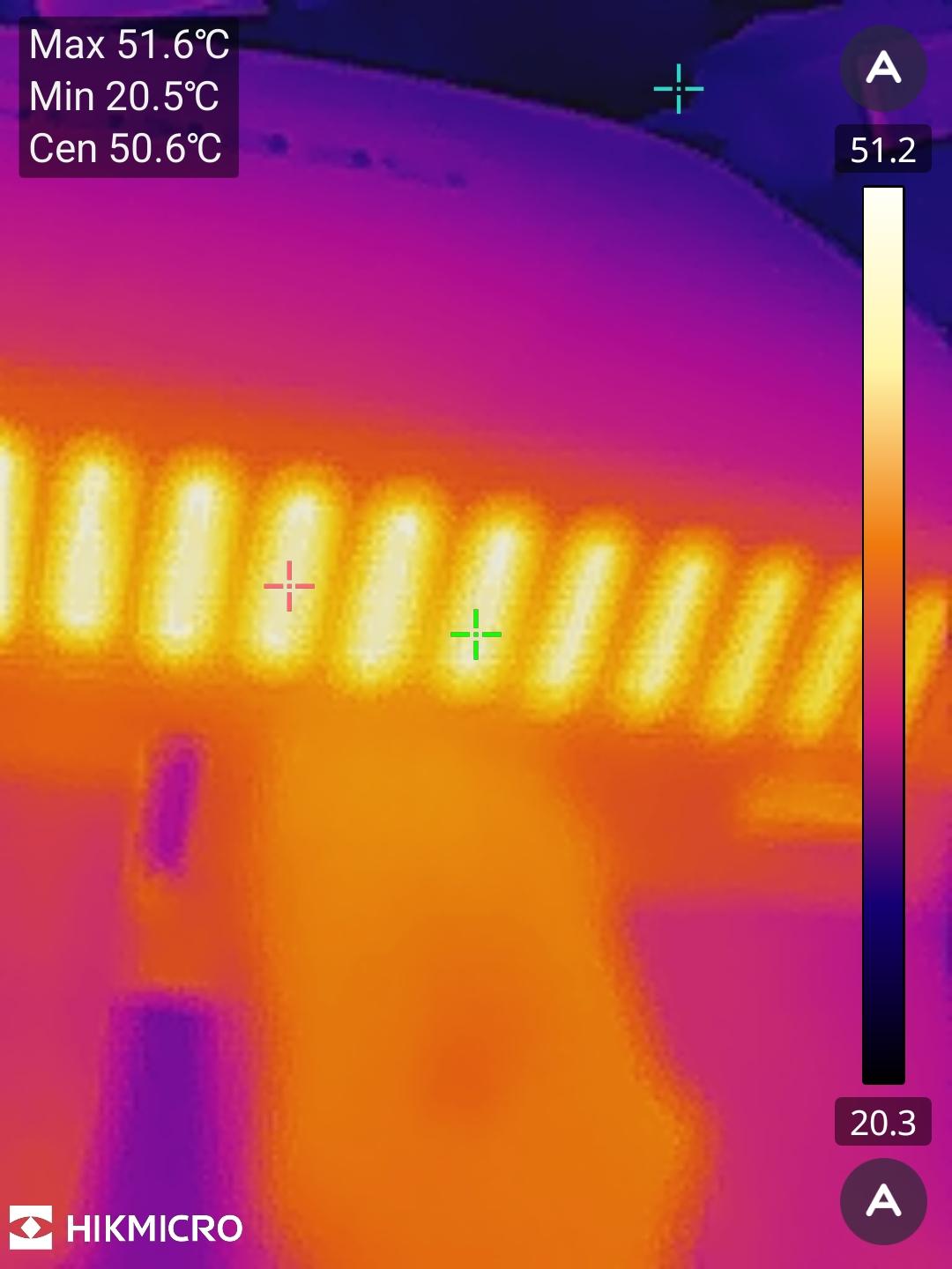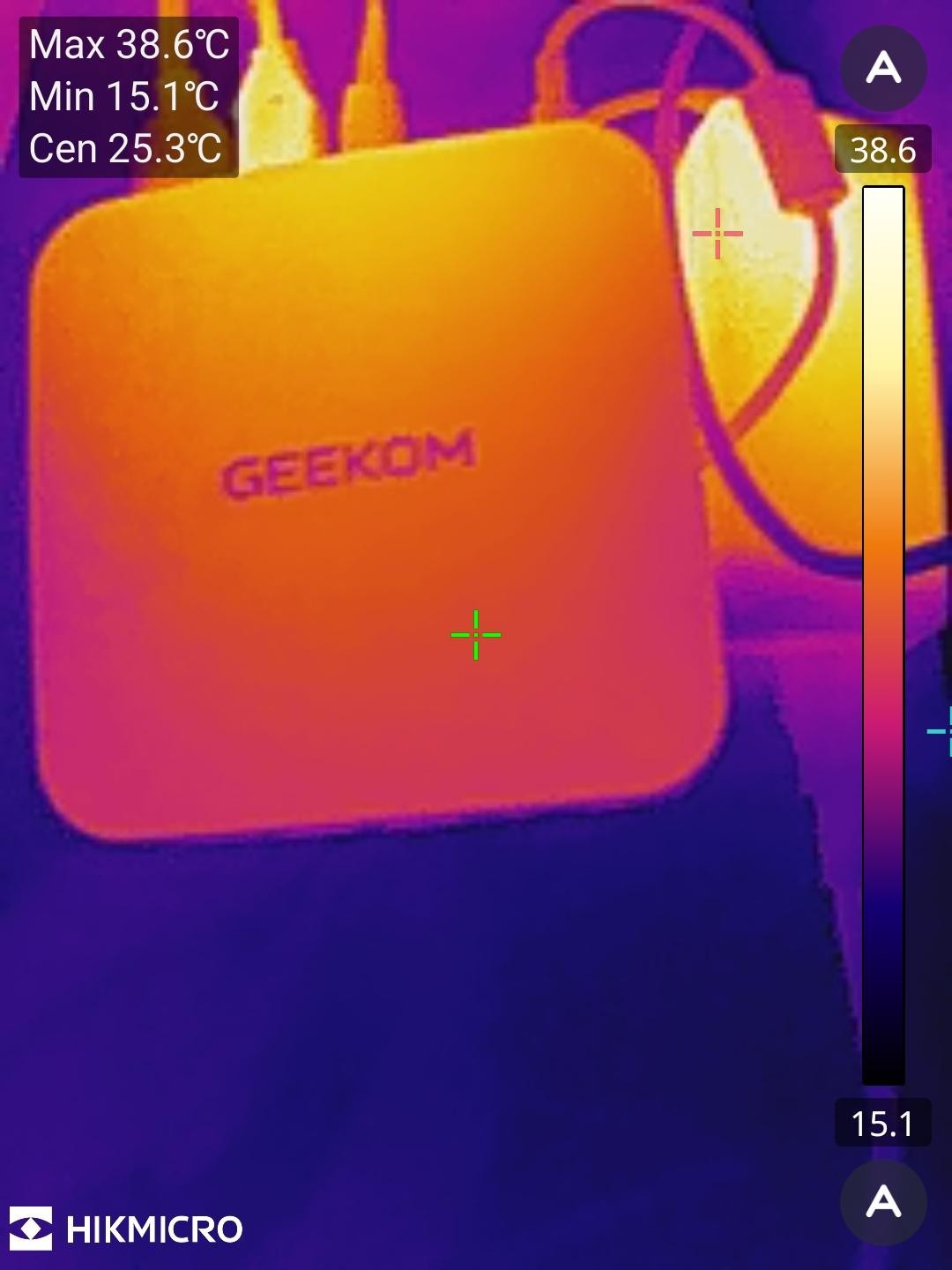 Auch wenn der Mini-PC nur wenig Leistung verbraucht, ist das System erstaunlich leise. Gerade bei diesem kompakten Gehäuse hatten wir schon deutliche thermische Probleme in der Vergangenheit. So messen wir mit dem Smartphone unter Volllast am Gehäuse 23,5 dB(A) und in einem Meter Entfernung 18 dB(A). Dabei bleiben die Temperaturen von CPU und iGPU auch dauerhaft um die 60 Grad (CPU: max. 61,1 Grad; GPU: max. 59 Grad) – ein hervorragendes Ergebnis.
