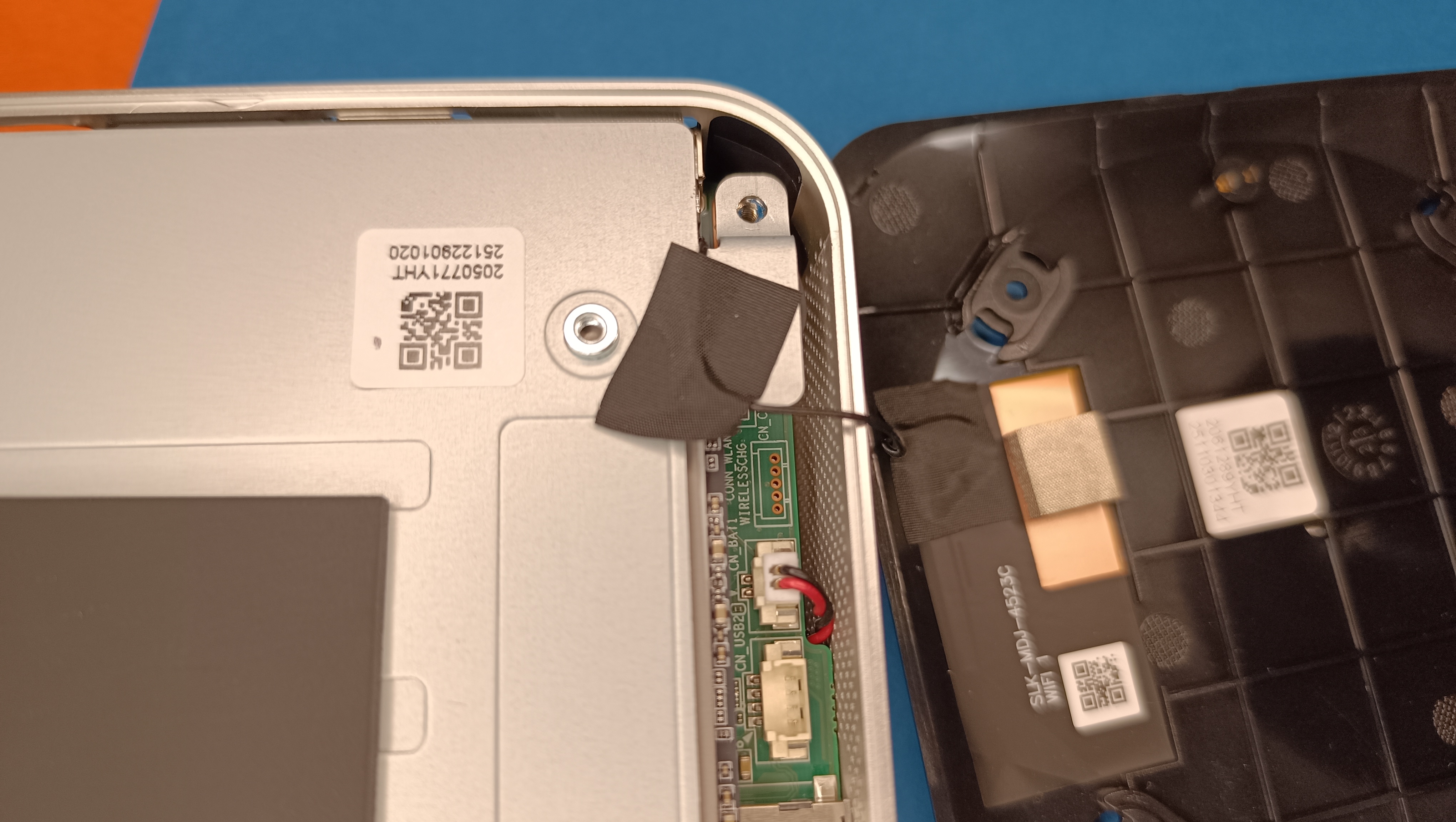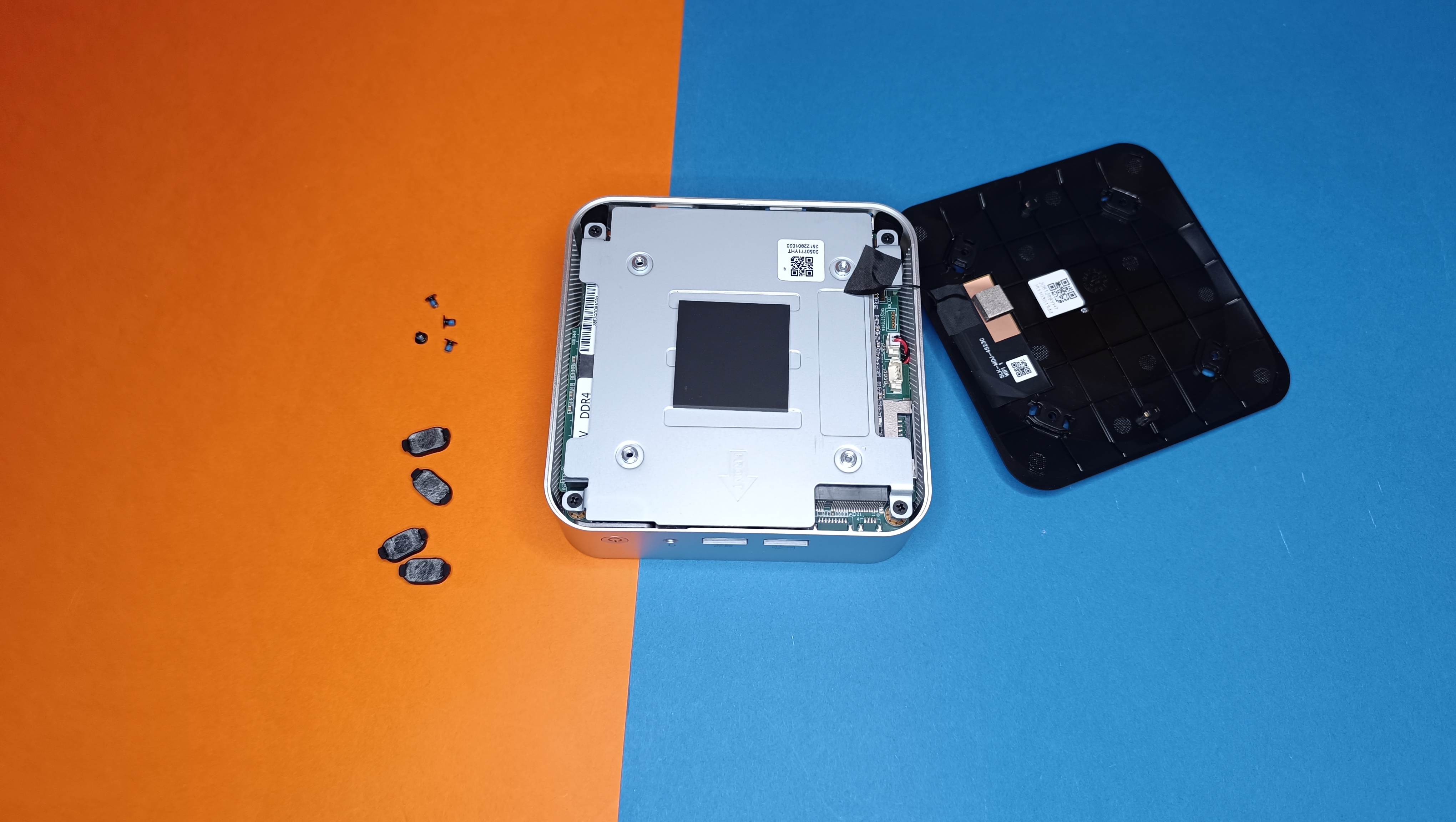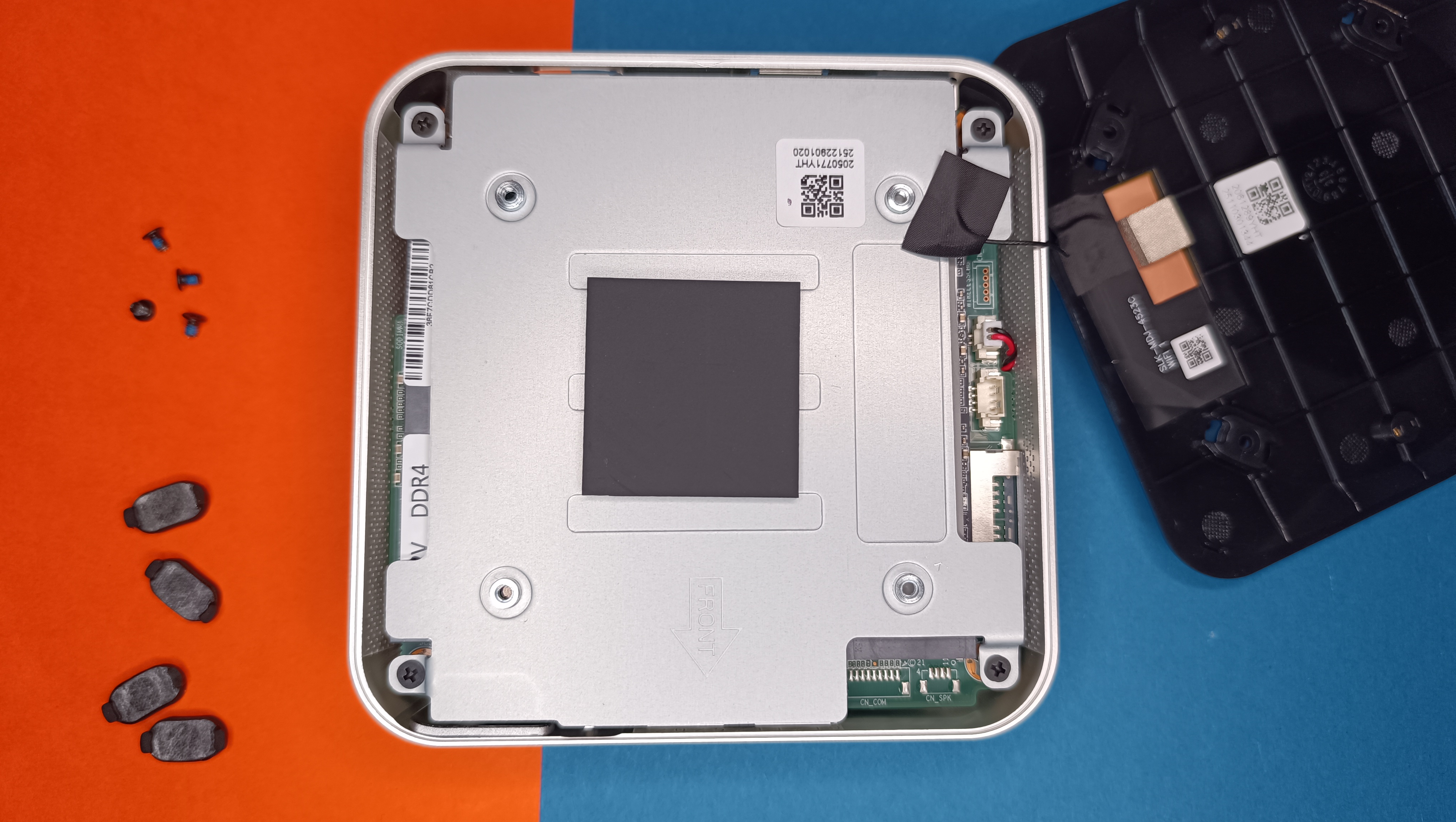 Zum Öffnen des Gehäuses müssen wir die vier verklebten Gummifüße auf der Unterseite entfernen und die darunterliegenden Schrauben lösen. Anschließend nehmen wir vorsichtig die Bodenplatte ab, an der die Antennenkabel für Bluetooth und Wifi befestigt sind. Jetzt sehen wir wieder die übliche Zwischenplatte aus Metall, welche wir ebenfalls mit vier Schrauben lösen und zudem den Klebestreifen für die Antennen entfernen, um diese nicht versehentlich abzureißen.
