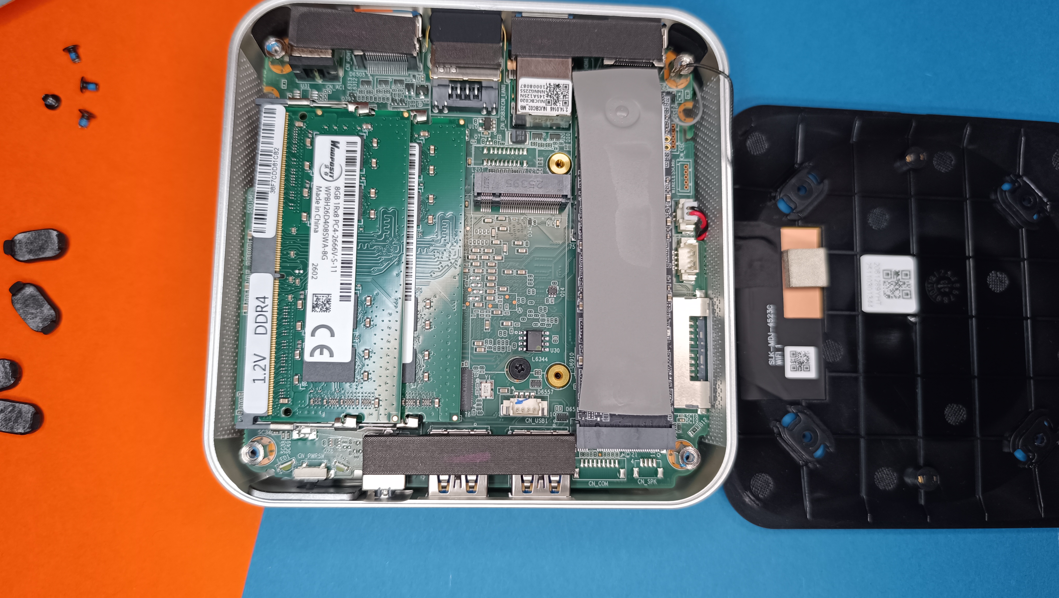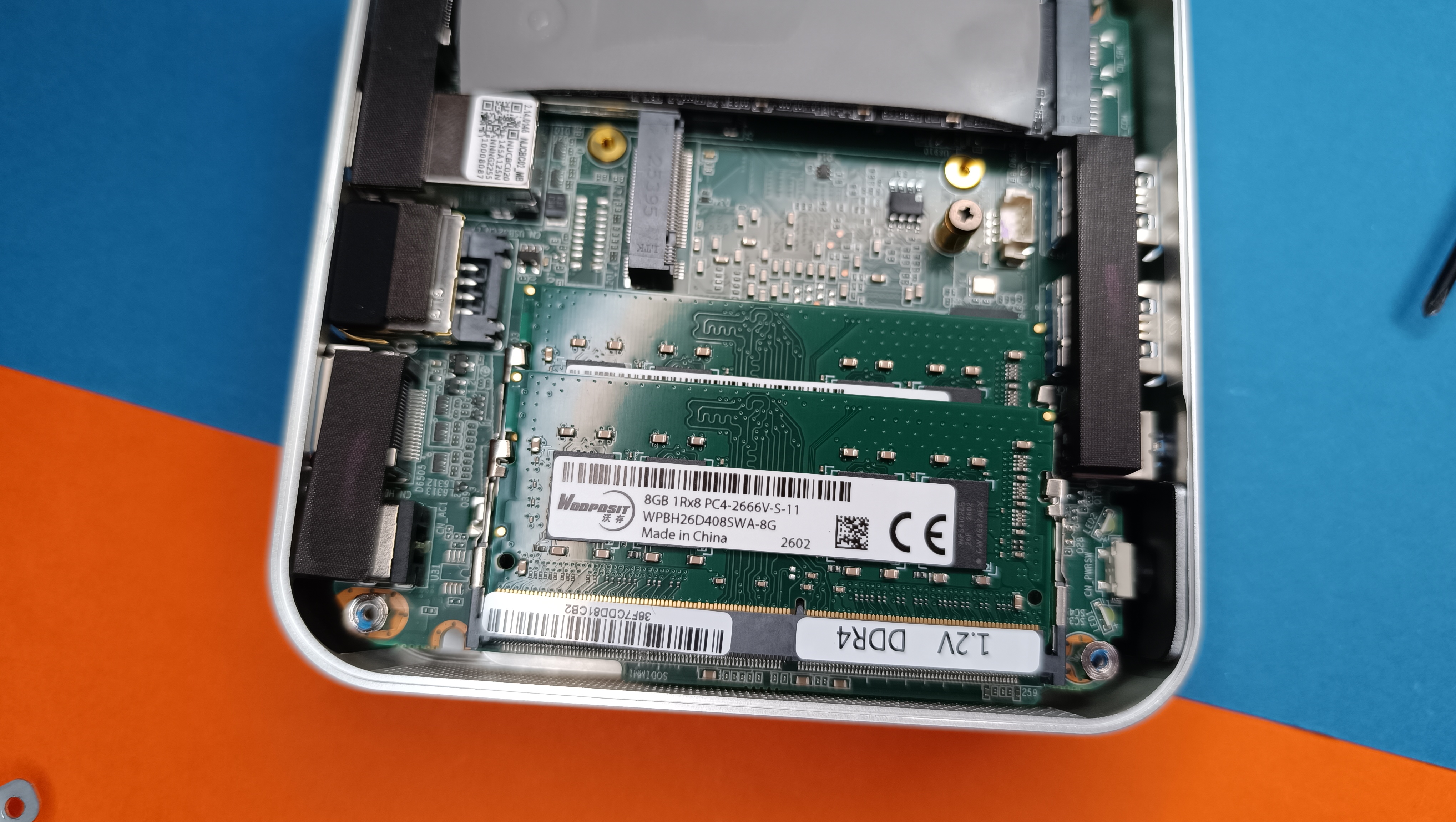 Bei RAM setzt der Geekom A5 Pro wegen der älteren CPU-Architektur noch auf den DDR4-Standard. So gibt es zwei austauschbare SO-DIMM-Module von Wooposit mit 2667 MT/s und einer Gesamtkapazität von 16 GB. Diese lassen sich nach Herstellerangaben in Summe auf bis zu 64 GB aufrüsten.