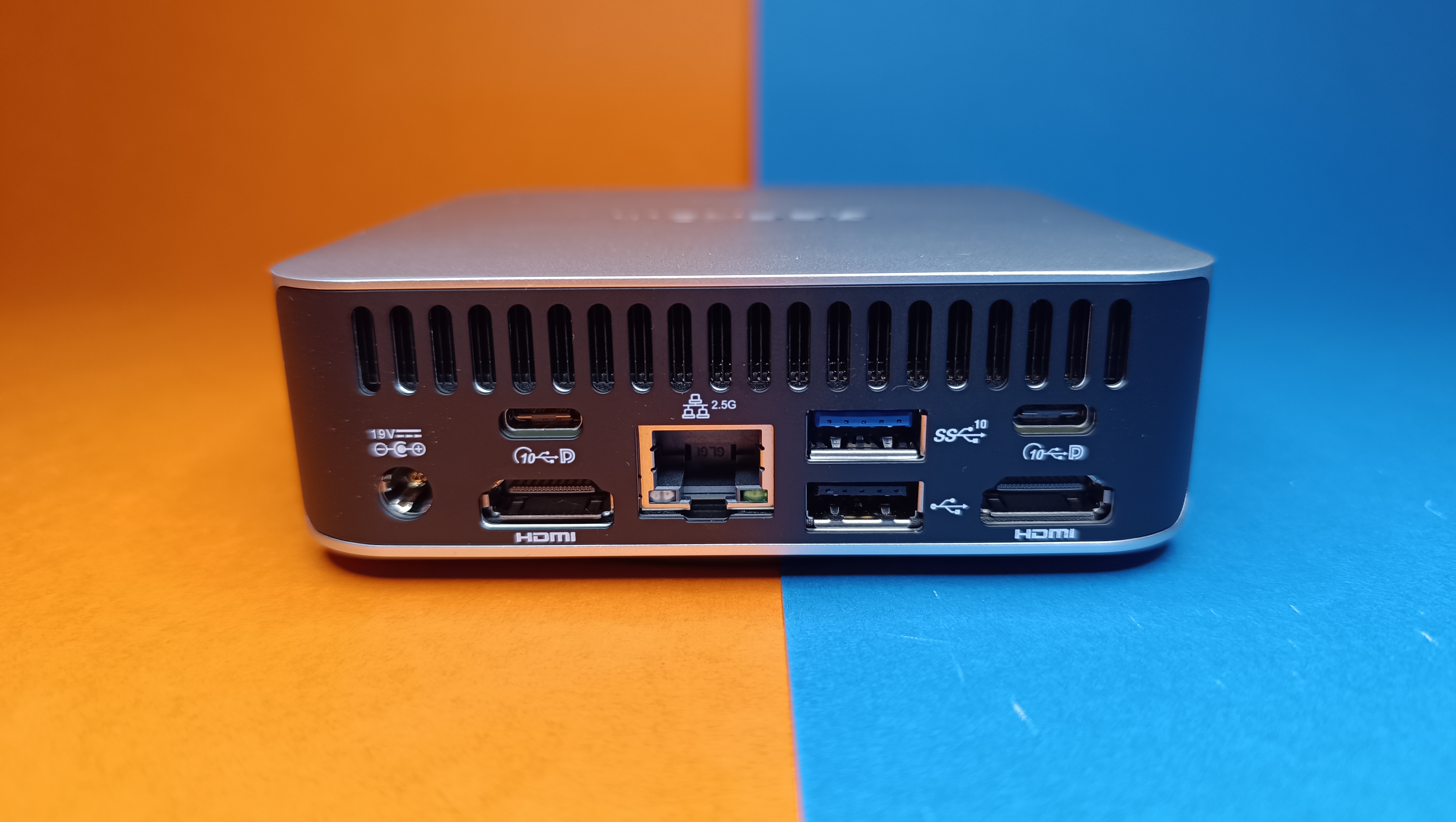 Bei den Anschlüssen ist der A5 Pro trotz seines kompakten Formfaktors gut aufgestellt. So gibt es zweimal USB-C mit 10 Gbit/s (USB 3.2 Gen 2) und Displayport Alt-Mode. Zudem können Bildschirme auch über die beiden HDMI-2.0-Anschlüsse verbunden werden. Der Ethernet-Port erlaubt den Datenaustausch mit bis zu 2,5 Gbit/s. Allerdings erfolgt die Stromversorgung wieder einmal nur über die DC-Buchse und nicht über einen der USB-C-Ports, wie es bei Laptops schon seit Langem üblich ist.
