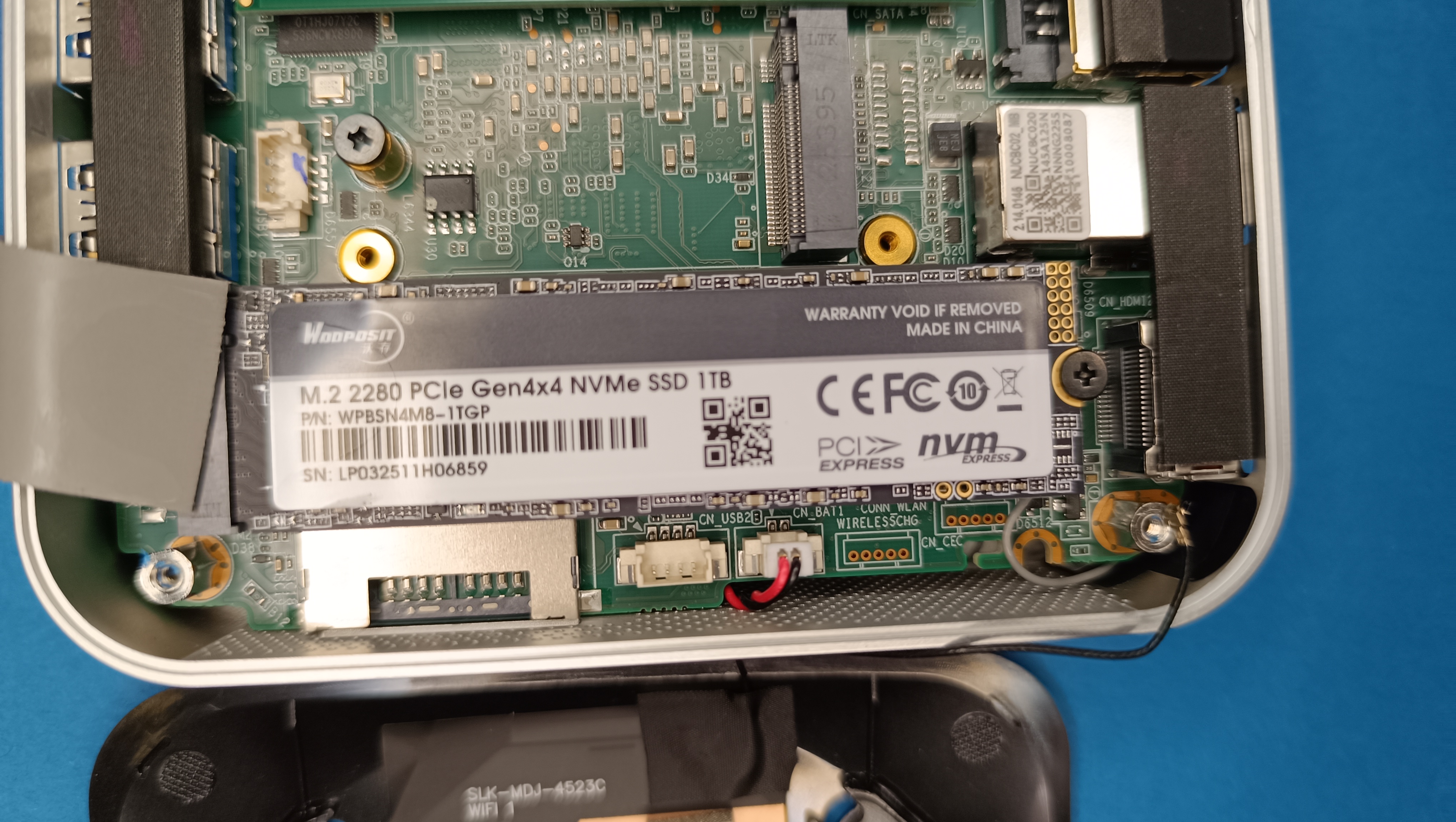 Zudem gibt es eine M.2 NVMe-SSD mit 1 TB, die über PCIe 3.0 mit vier Lanes angebunden ist. Das SSD ist ebenfalls von Wooposit und unterstützt sogar PCIe 4.0×4. So messen wir mit Crystaldiskmark 3720 MB/s im Lesen und 3414 MB/s im Schreiben. Der M.2-Steckplatz unterstützt SSDs bis 3 TB, weitere Anschlussmöglichkeiten für Speicher gibt es nicht.