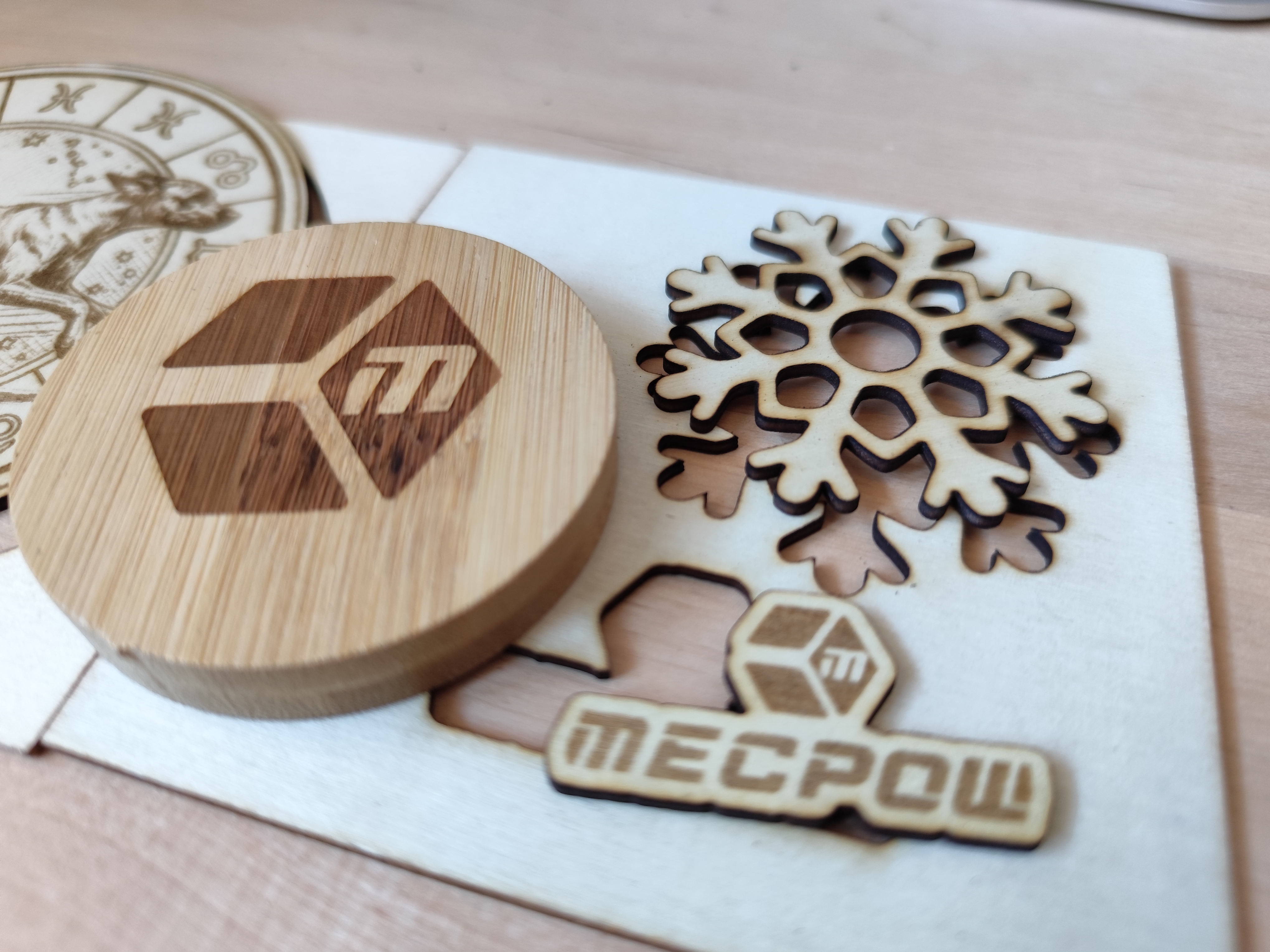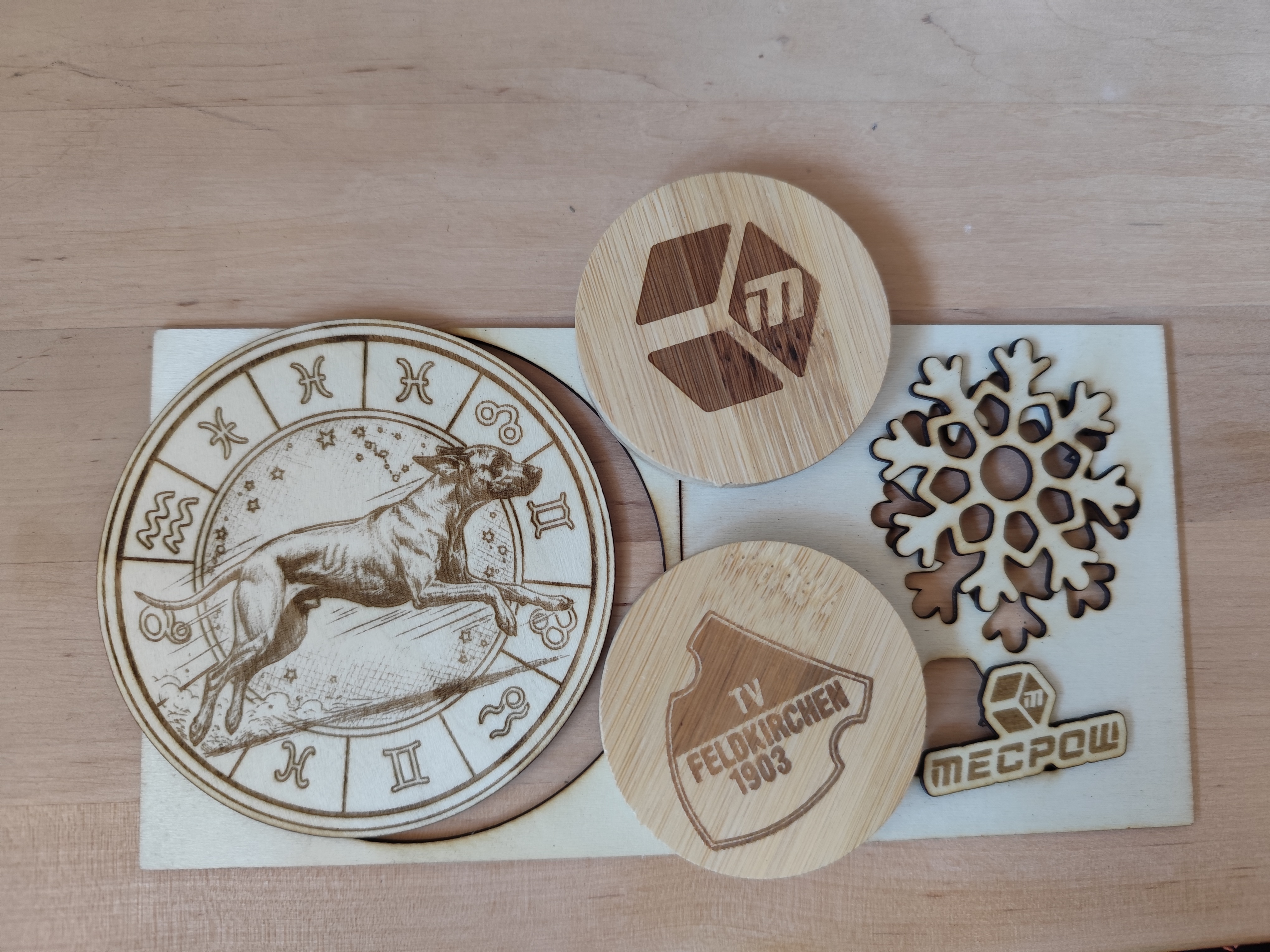 Ansonsten zeigt sich der Mecpow M1 als vielseitiger Graveur für zahlreiche Materialien. Hölzer, Jeansstoff, Leder und beschichtete Metalle stellten kein Problem dar. Mit dem 5-Watt-Laser ließen sich 2- und 3-mm-Sperrholz in nur einem Durchgang sauber schneiden. Die maximale Gravurgeschwindigkeit liegt theoretisch bei 10.000 mm/min – dann aber wäre vom Ergebnis kaum etwas zu sehen. In der Praxis graviert und schneidet der Laser deutlich langsamer. Für Flächengravuren auf Holz nutzen wir etwa 2300 mm/min bei 30 Prozent Leistung. Geschnitten wird dann mit 150 mm/min bei 90 Prozent Leistung.