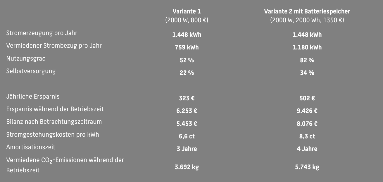 Laut Stecker-Solar-Simulator ist die Amortisationszeit beim Priwatt-BKW mit 2000 Watt und dem Speicher Avocado Orbit M genauso lange wie das Pendant ohne Speicher. Über die gesamte Laufzeit erzielt das BKW mit Speicher allerdings einen um 2623 Euro höheren Gewinn. Dabei hat der Simulator auch die Ersatzkosten für Speicher und Wechselrichter berücksichtigt.