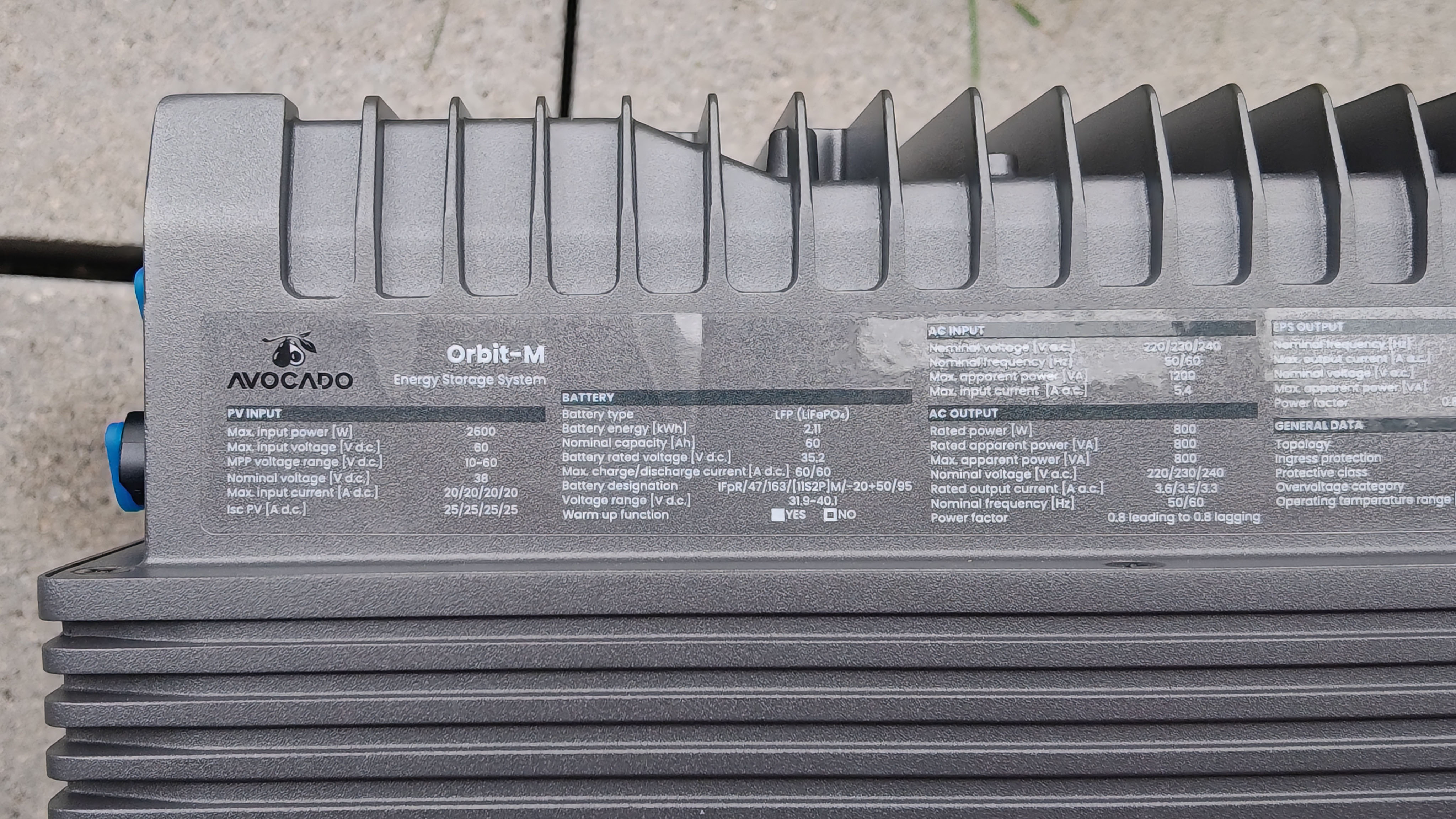 Wie der Solakon One bietet auch der Avocado Orbit M eine als Notstromsteckdose (EPS, Emergency Power Supply) bezeichnete Schuko-Steckdose. Sie bietet im Offgrid-Betrieb eine Leistung von 1200 Watt. Das ist etwa bei einem Stromausfall (siehe auch Betreiber: Längster Stromausfall der Nachkriegszeit beendet) interessant. So kann man an dieser Steckdose etwa eine Kühlgefrier-Kombination betreiben. Im Regelbetrieb, wenn der Speicher mit dem Stromnetz verbunden ist, liegt die Leistung bei 2200 Watt. Dann werden allerdings 1000 Watt aus dem Netz bezogen.