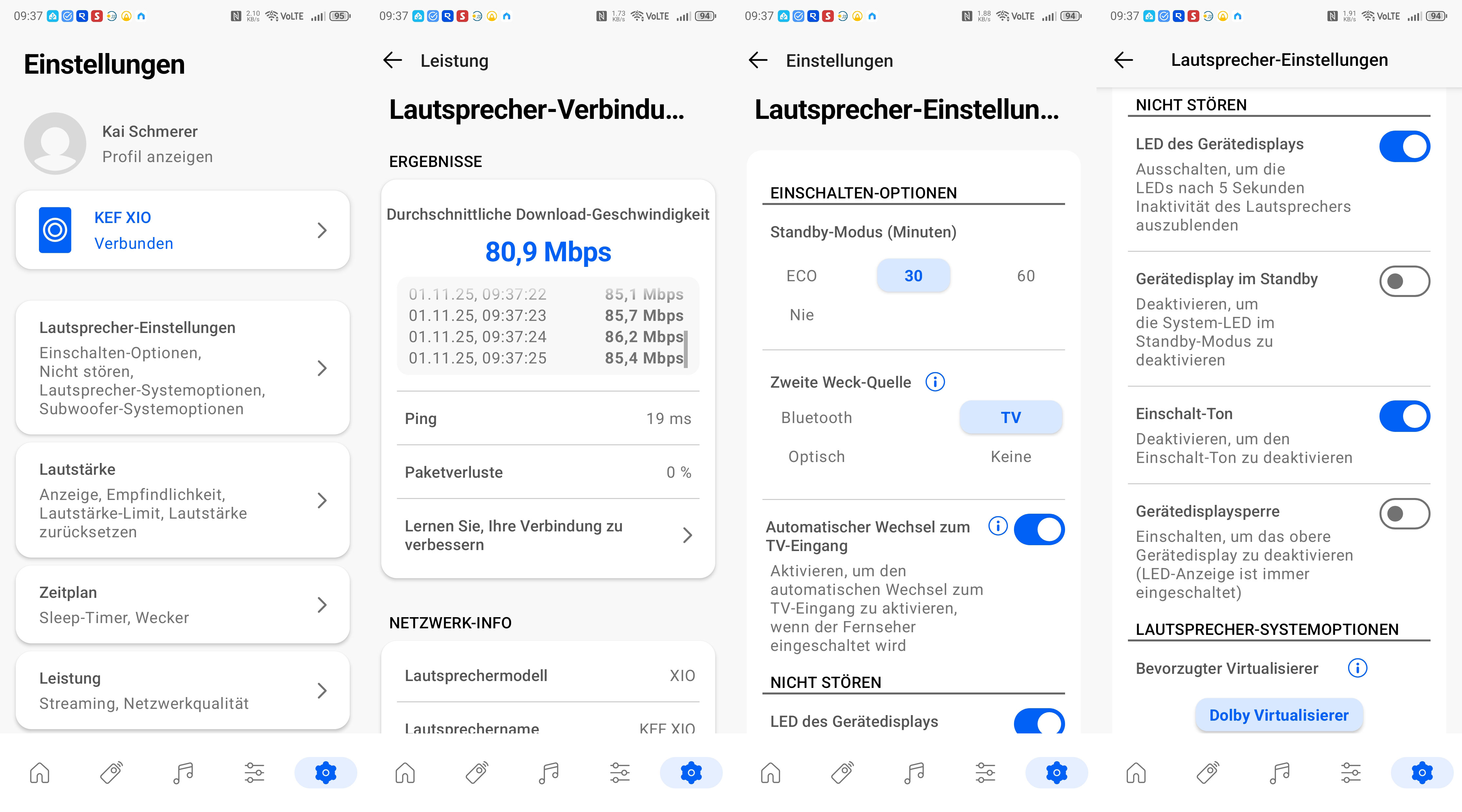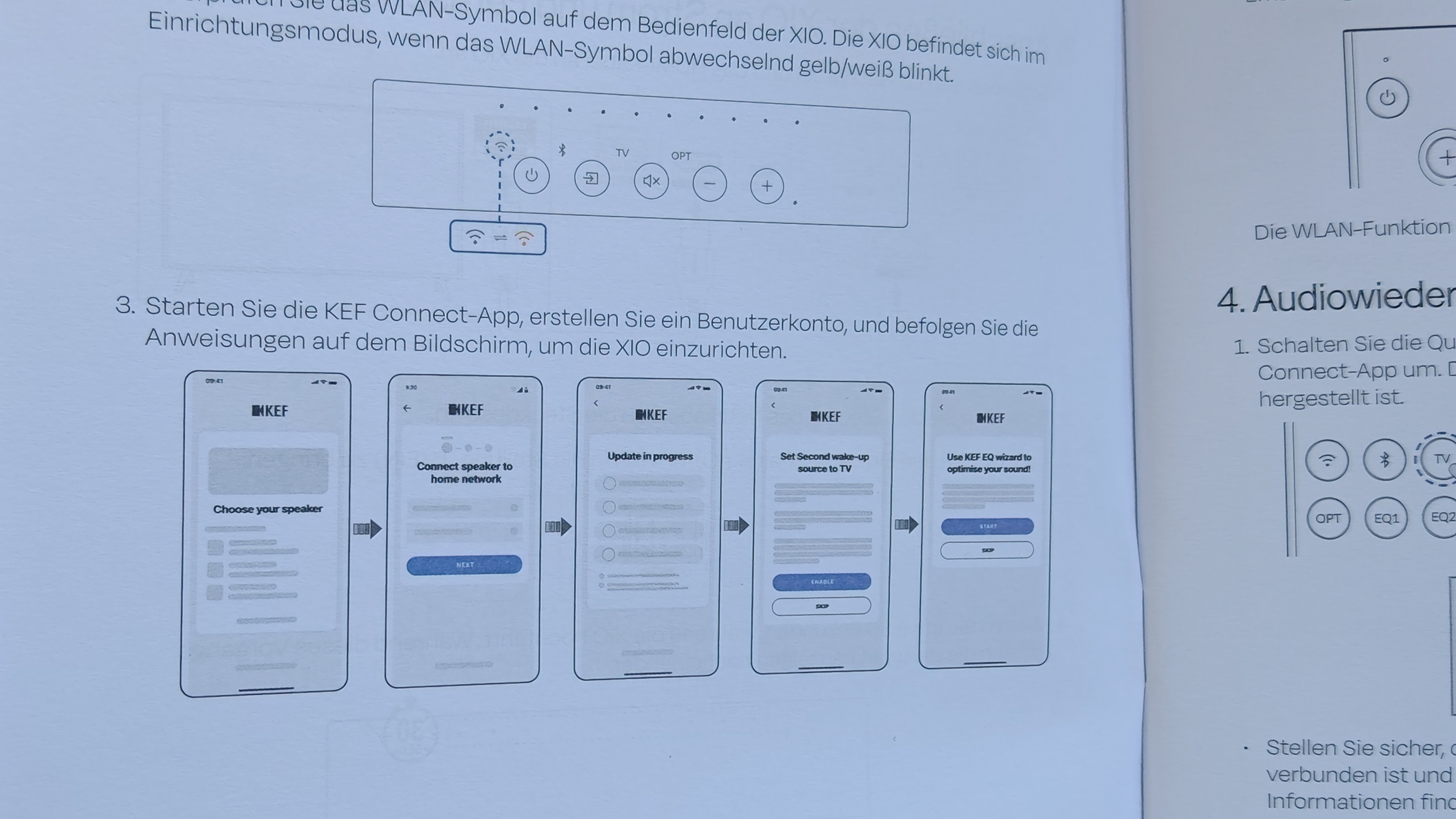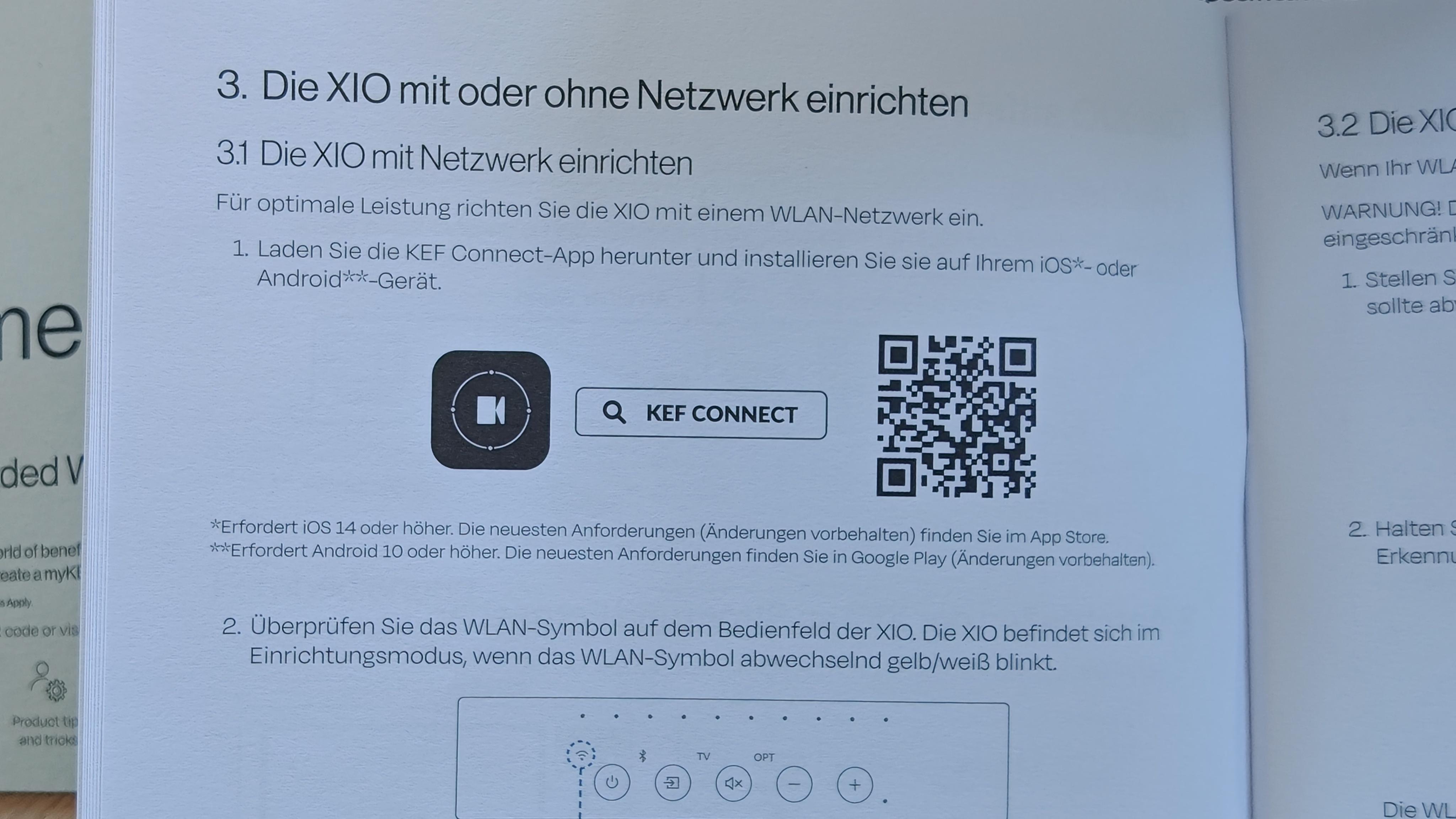 Die KEF Connect App steuert alle Einstellungen. Die Einrichtung und Verbindung sind stabil, die Logik der App ist jedoch gewöhnungsbedürftig (z. B. gibt es keine separate Ein-/Ausschalttaste). Mit der mitgelieferten Fernbedienung lässt sich die Xio ebenfalls steuern. Damit sich die Xio zusammen mit dem Fernseher automatisch einschaltet, muss man in den Lautsprecher-Einstellungen als zweite Weck-Quelle die Option TV auswählen.
