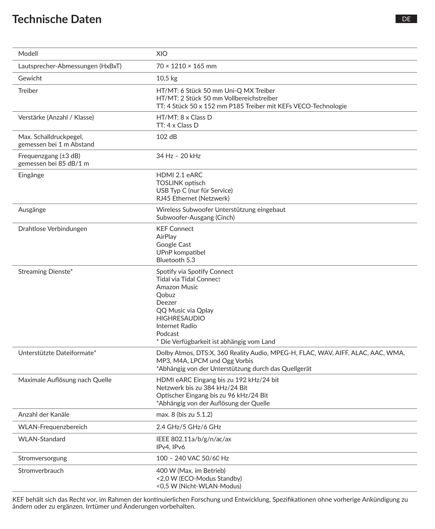 Soundbar KEF Xio: Leistungsstarkes 5.1.2-Set-up: 820 Watt Gesamtleistung, maximaler Schalldruckpegel von 102 dB, 12 Lautsprecher (6x 50 mm Uni-Q MX-Treiber, 2x 50 mm Vollbereichstreiber und 4x 50 × 152 mm P185 Treiber mit KEFs VECO-Technologie).