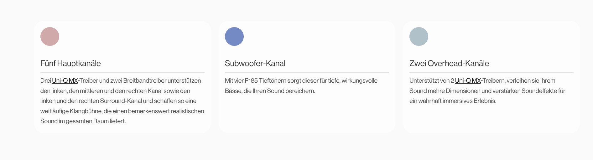 - Leistungsstarkes 5.1.2-Set-up: 820 Watt Gesamtleistung, maximaler Schalldruckpegel von 102 dB, 12 Lautsprecher (6x 50 mm Uni-Q MX-Treiber, 2x 50 mm Vollbereichstreiber und 4x 50 × 152 mm P185 Treiber, mit KEFs VECO-Technologie).