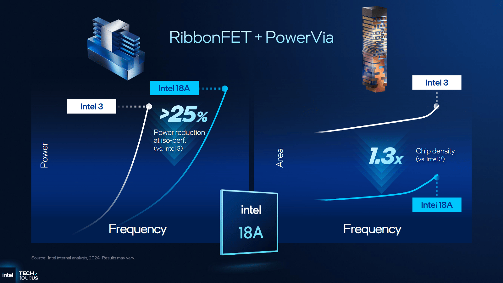 Am Ende soll Intel 18A mit den beiden neuen Technologien Vorteile sowohl bei der Leistung, dem Stromverbrauch und natürlich dem Flächenbedarf bieten.