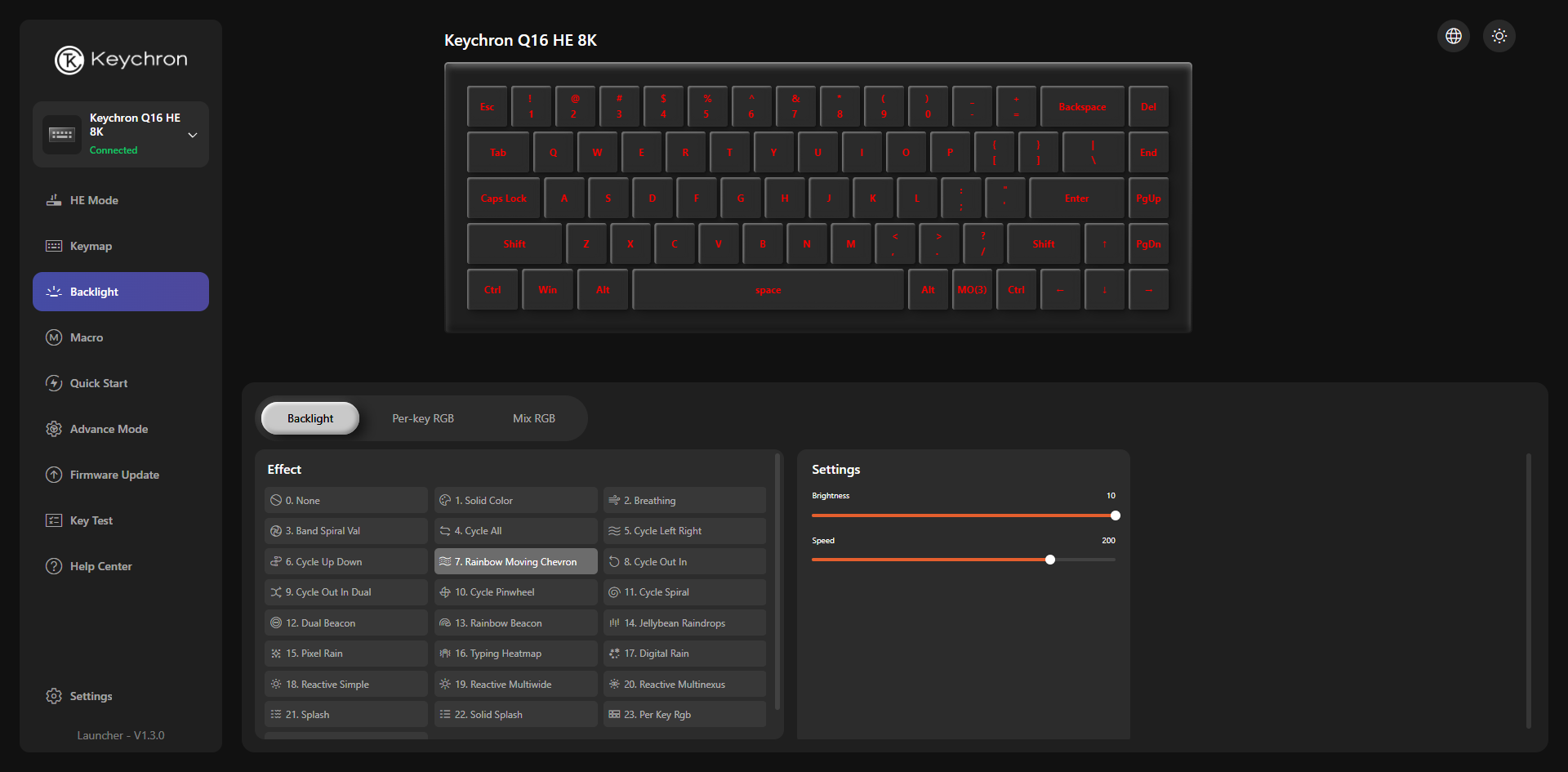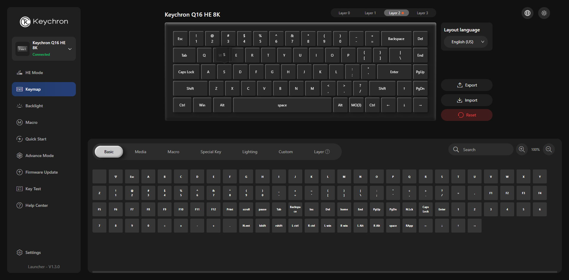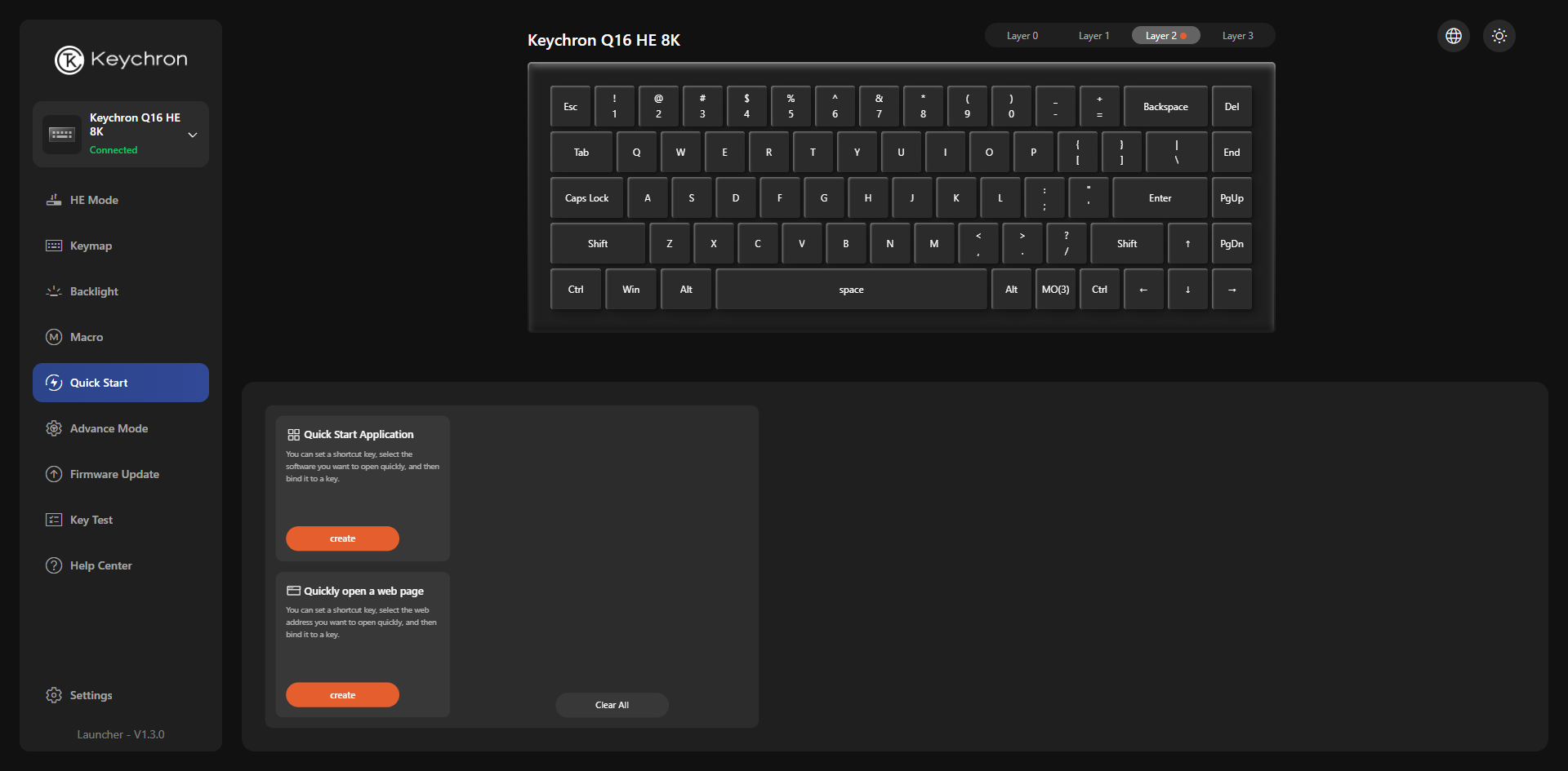 Wie für viele andere Keychron-Tastaturen steht auch für die Q16 HE 8K der Web-Launcher zur Verfügung. Er liefert eine Fülle an Einstellungsmöglichkeiten und erfordert keine Installation auf dem Computer. Das Interface ist übersichtlich aufbereitet und die Funktionen sind größtenteils erklärt.