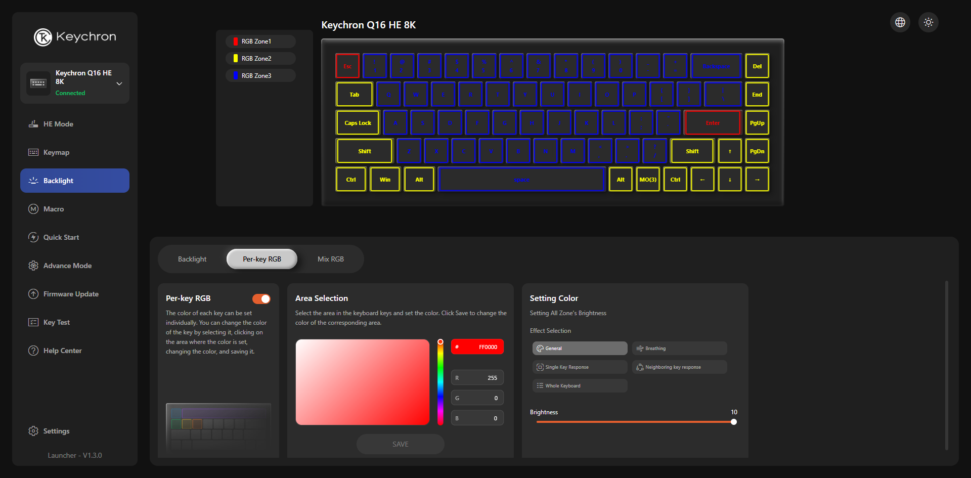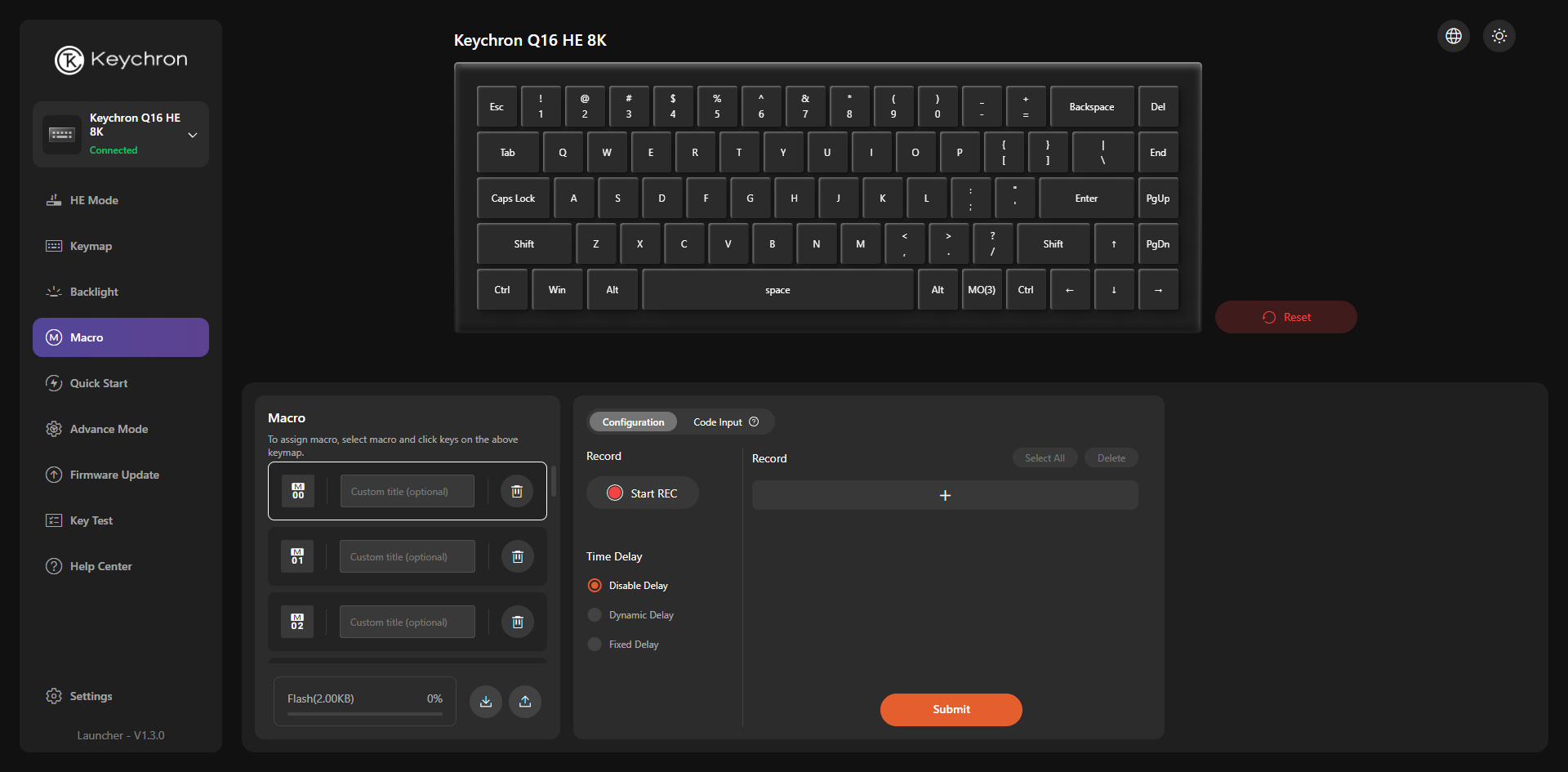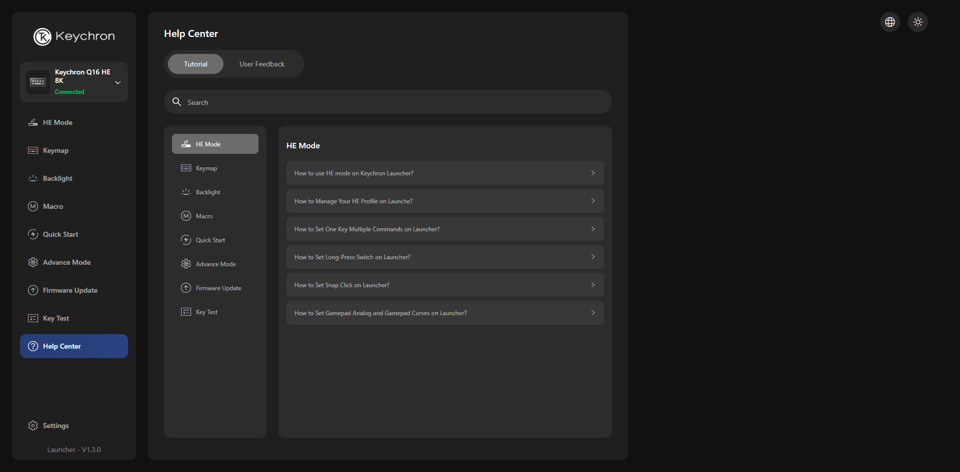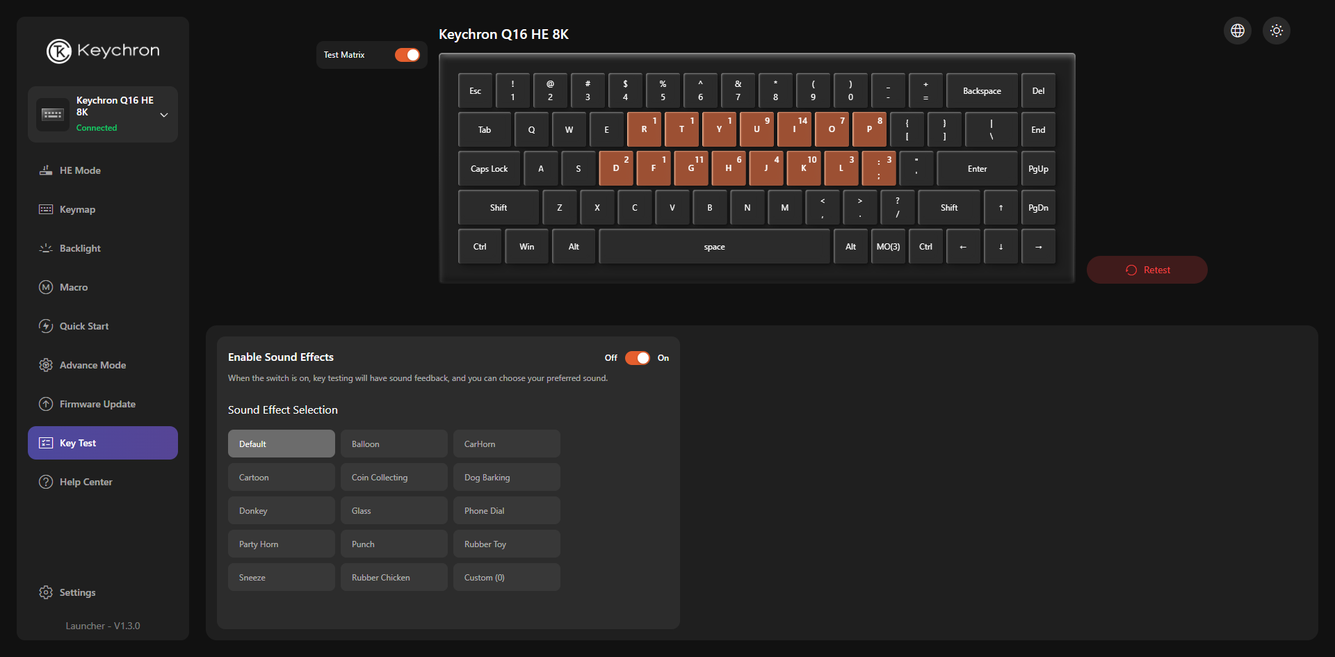 Wie für viele andere Keychron-Tastaturen steht auch für die Q16 HE 8K der Web-Launcher zur Verfügung. Er liefert eine Fülle an Einstellungsmöglichkeiten und erfordert keine Installation auf dem Computer. Das Interface ist übersichtlich aufbereitet und die Funktionen sind größtenteils erklärt.