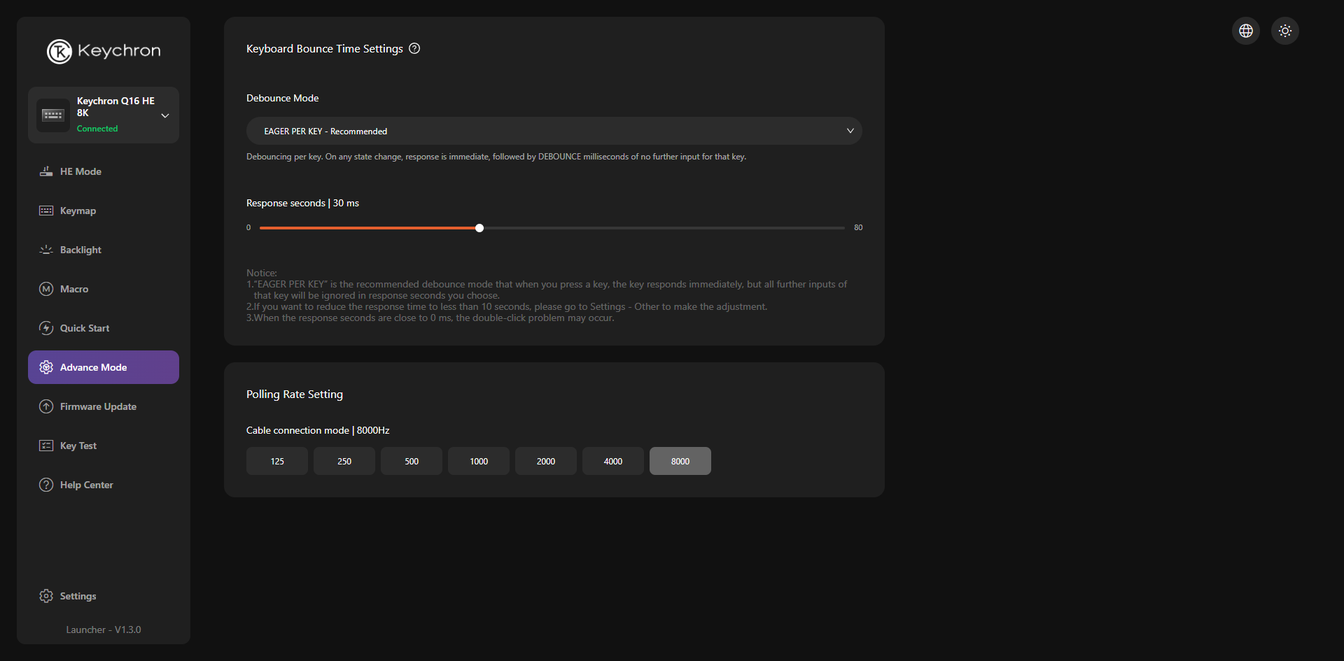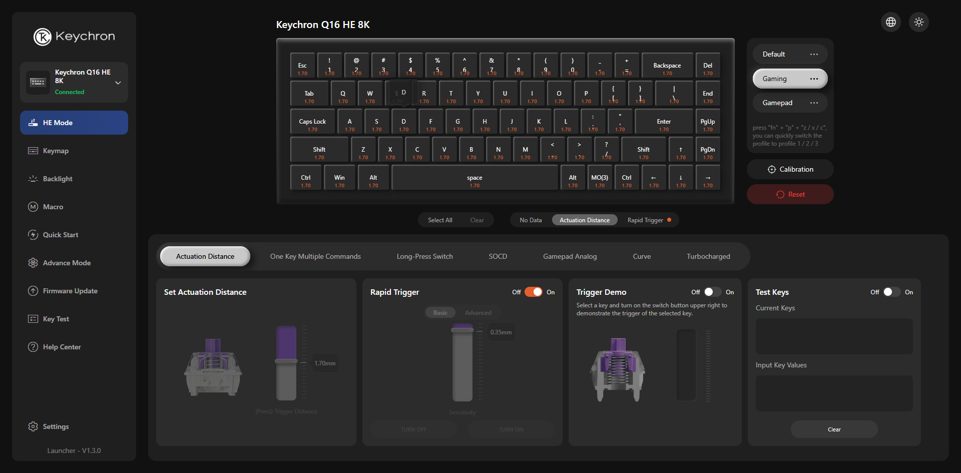 Bei den Switches handelt es sich um vorgeschmierte Keychron Ultra-Fast Lime Magnetic mit linearem Charakter. Die Startbetätigungskraft beträgt 30 gf, während es 50 gf benötigt, um den Switch komplett durchzudrücken. Die komplette Reisedistanz beträgt 3,5 mm ± 0,1. Der Betätigungspunkt lässt sich von 0,1 bis 3,35 mm frei einstellen, die Switches arbeiten zudem mit einer Sensitivität von 0,01 mm.
