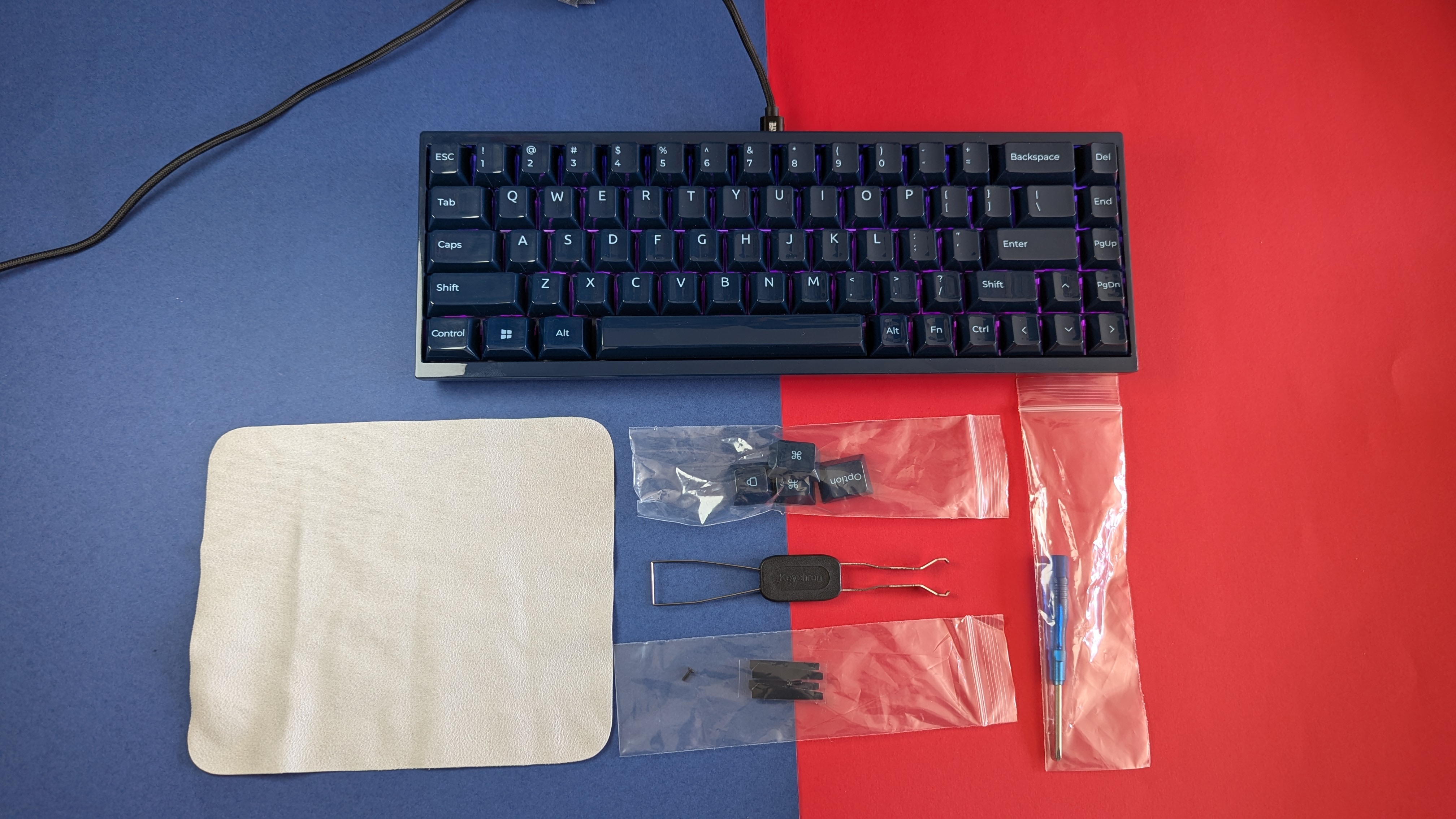 Zur Keychron Q16 HE 8K bekommt man das USB-C-zu-USB-C-Verbindungskabel inklusive USB-A-Adapter, einen Keycap-und-Switch-Puller, ein Set an Windows-Tastenkappen, einen Schraubendreher sowie Ersatzschrauben und Ersatz-Gummifüße. Ein Quick-Start-Guide und eine ausführlichere Anleitung liegen ebenfalls bei. Um den Tasten nach dem Einsatz erneuten Glanz zu verleihen, liegt zudem ein Putztuch bei.