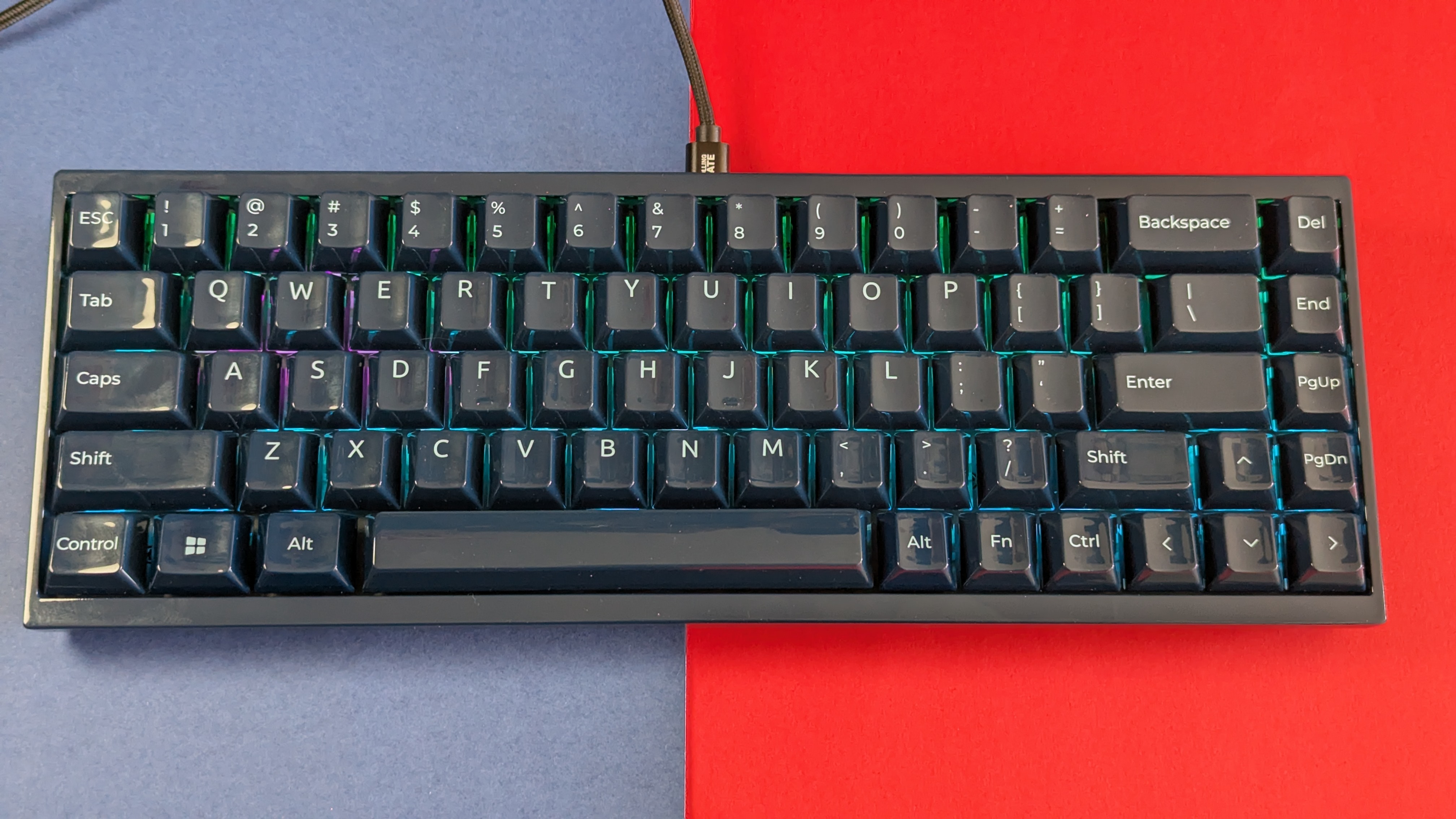 Unser Testgerät im ANSI-Format kommt in einem dunklen Blau, die deutsche Variante hingegen in leichtem Grün. Was beide jedoch gemeinsam haben, ist, dass sie vollständig aus Keramik sind. Nicht nur das Gehäuse, sondern auch die Tastenkappen der 65-Prozent-Tastatur glänzen daher prächtig auf dem Tisch. Sie wirkt unheimlich edel. Dem wuchtigen Keramikgehäuse entsprechend bringt das Keyboard trotz kompakter Maße von 315 x 39,1 x 110,8 mm etwas mehr als 1 kg auf die Waage.