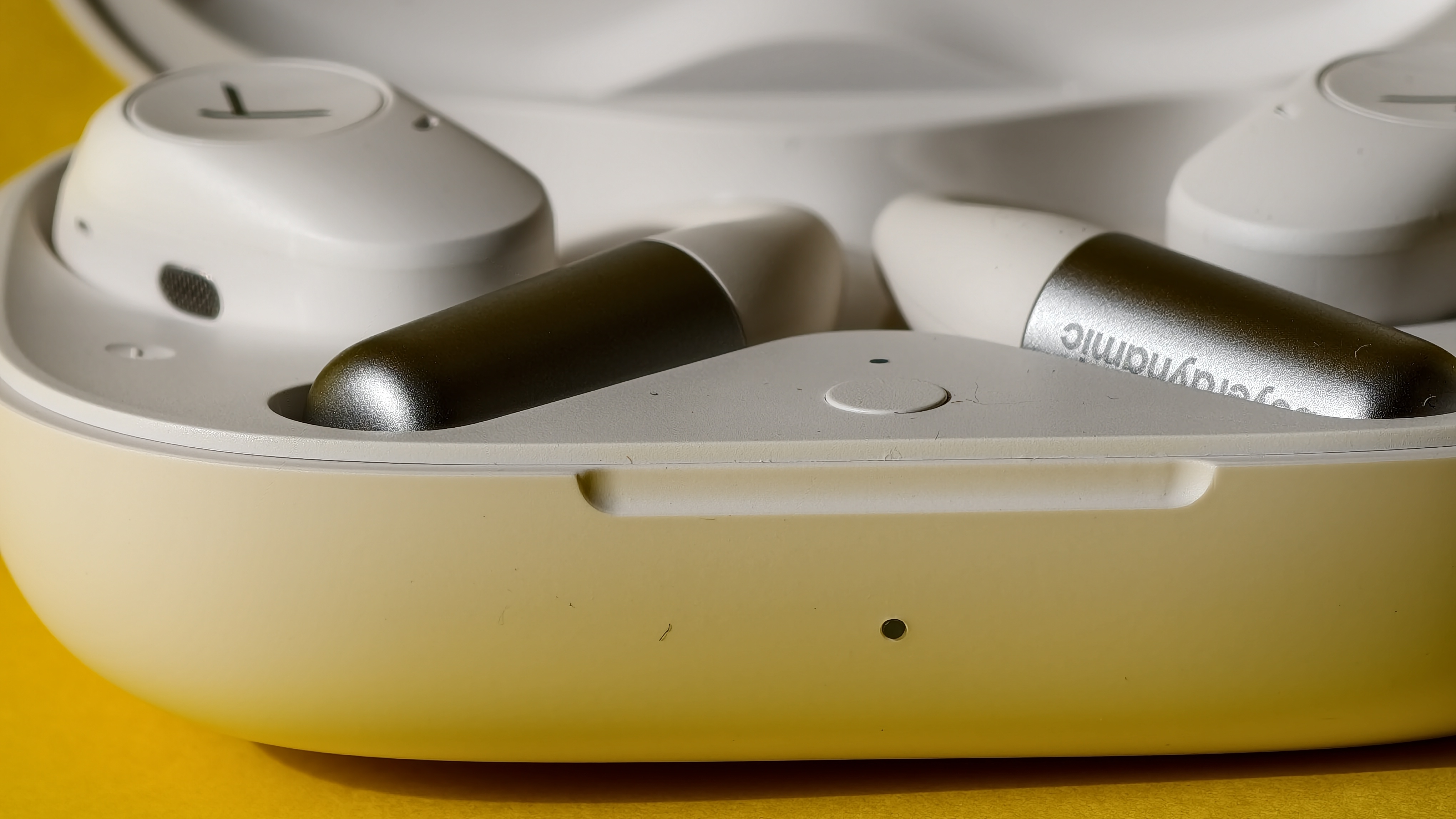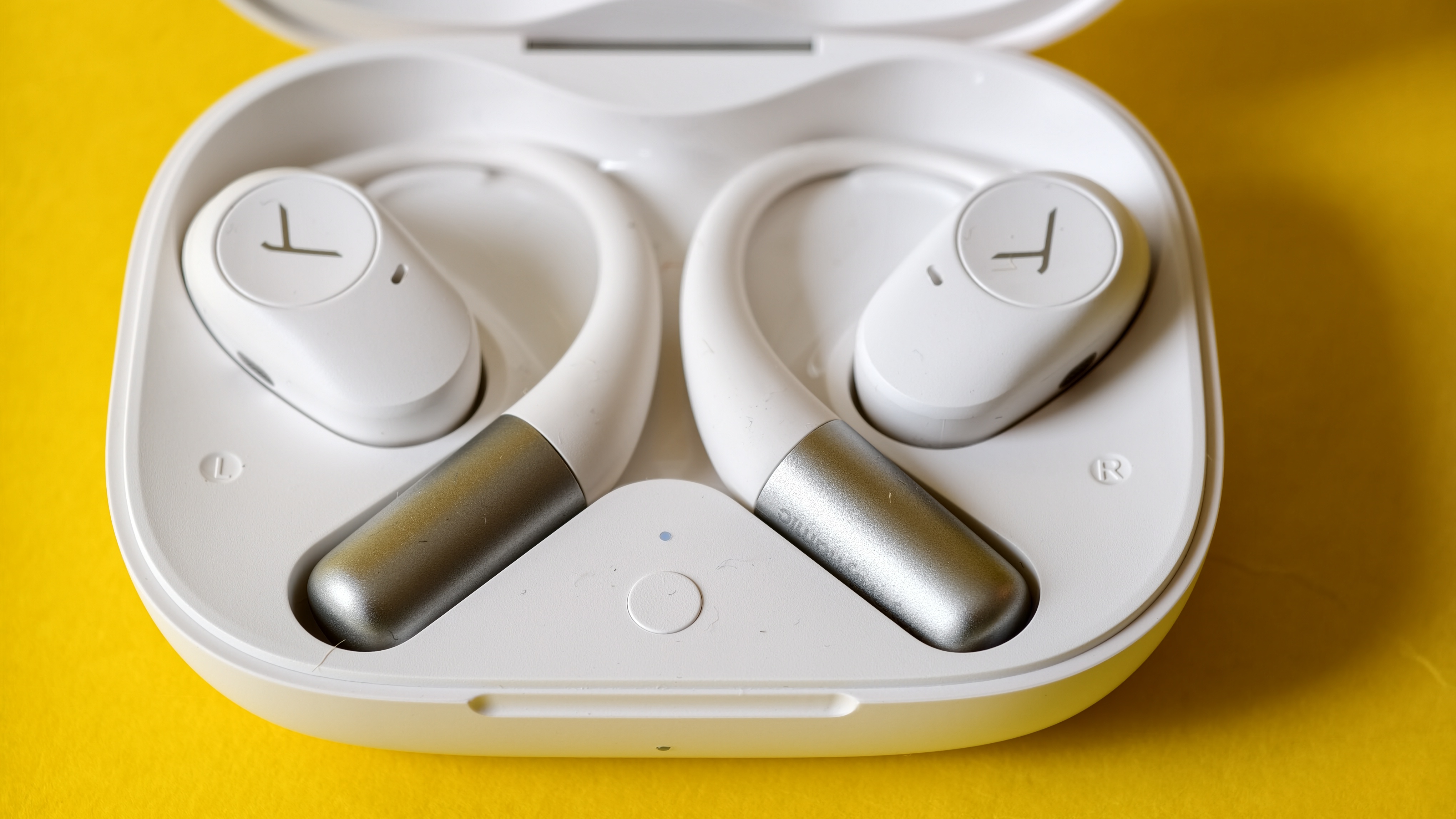 Das Objektiv, das Bilddaten auf einem 1/2,8“ Zoll großen CMOS-Sensor mit 3-Megapixel-Auflösung (2304 × 1296 Pixel) aufnimmt, sitzt in einem runden, schwarzen Gehäuse, das wiederum von einem weißen Gehäuse mit einer Aussparung für das Objektiv umgeben ist. Oberhalb des Objektivs sitzt der PIR-Sensor zur Erfassung von Bewegungen. Links und rechts davon befinden sich Mikrofon und Helligkeitssensor und darunter die LED-Lichter, die bei Dunkelheit aktiv werden und für eine farbige Nachtsicht bei Aufnahme und Livestream sorgen. Alternativ können für die Nachtsicht auch die zwei IR-LEDs verwendet werden. Dann liegt das Bild allerdings nur in Schwarzweiß vor, dafür sieht man den Lichtschein der Kamera nicht. Unterhalb von Objektiv und LED-Leuchten informiert eine LED über den Betriebszustand. Sie leuchtet etwa blau, wenn der Livestream in der App angezeigt wird oder grün, wenn der Akku vollständig geladen ist.
