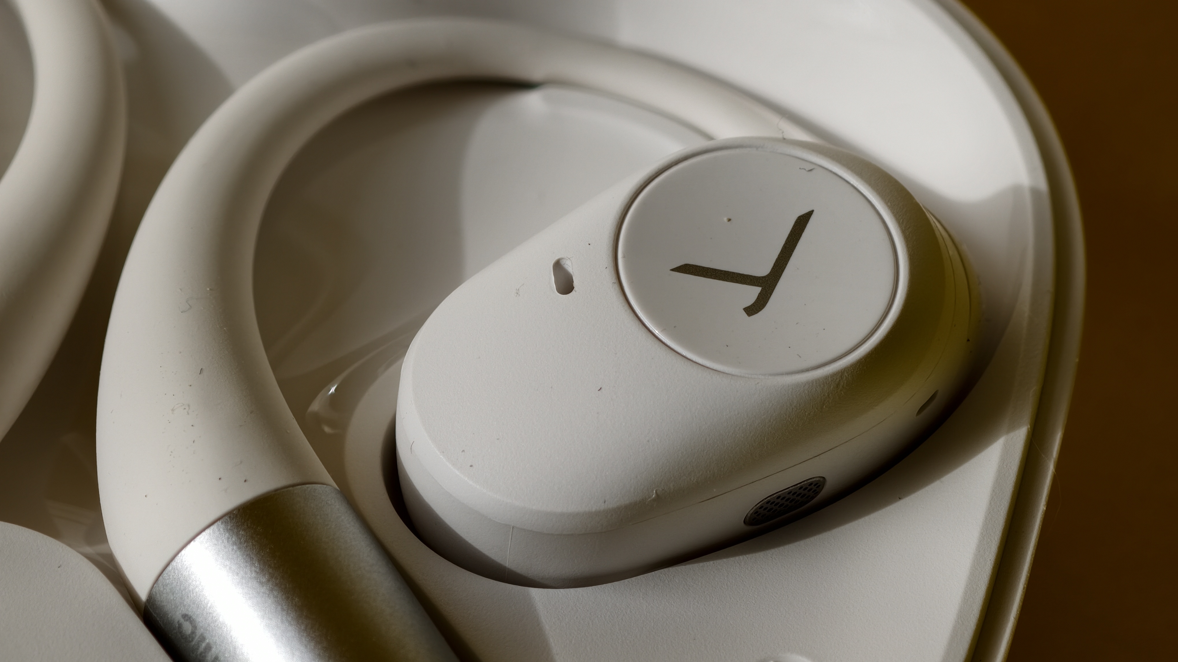 In der Halterung der Kamera befinden sich Lautsprecher, Stromversorgungsanschluss und Ein/Aus-Taste. Letztere drückt man zwei Sekunden lang, um das Gerät ein- und vier Sekunden lang, um es auszuschalten.
