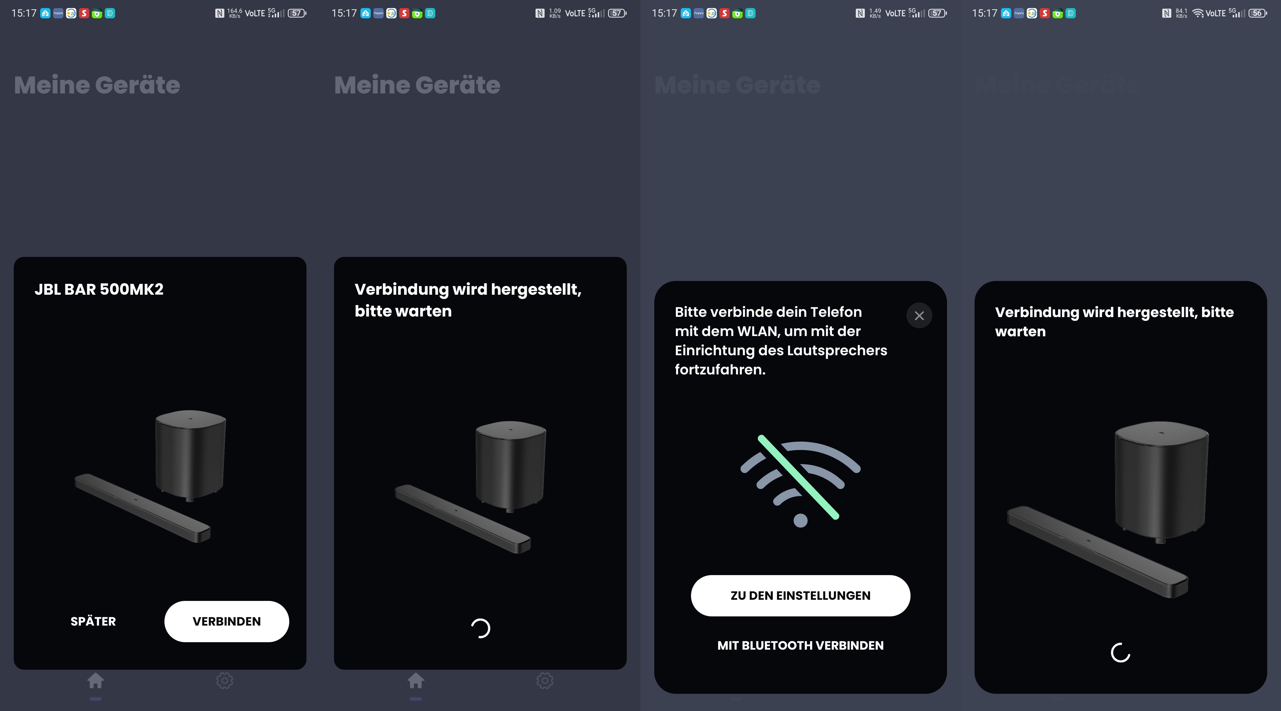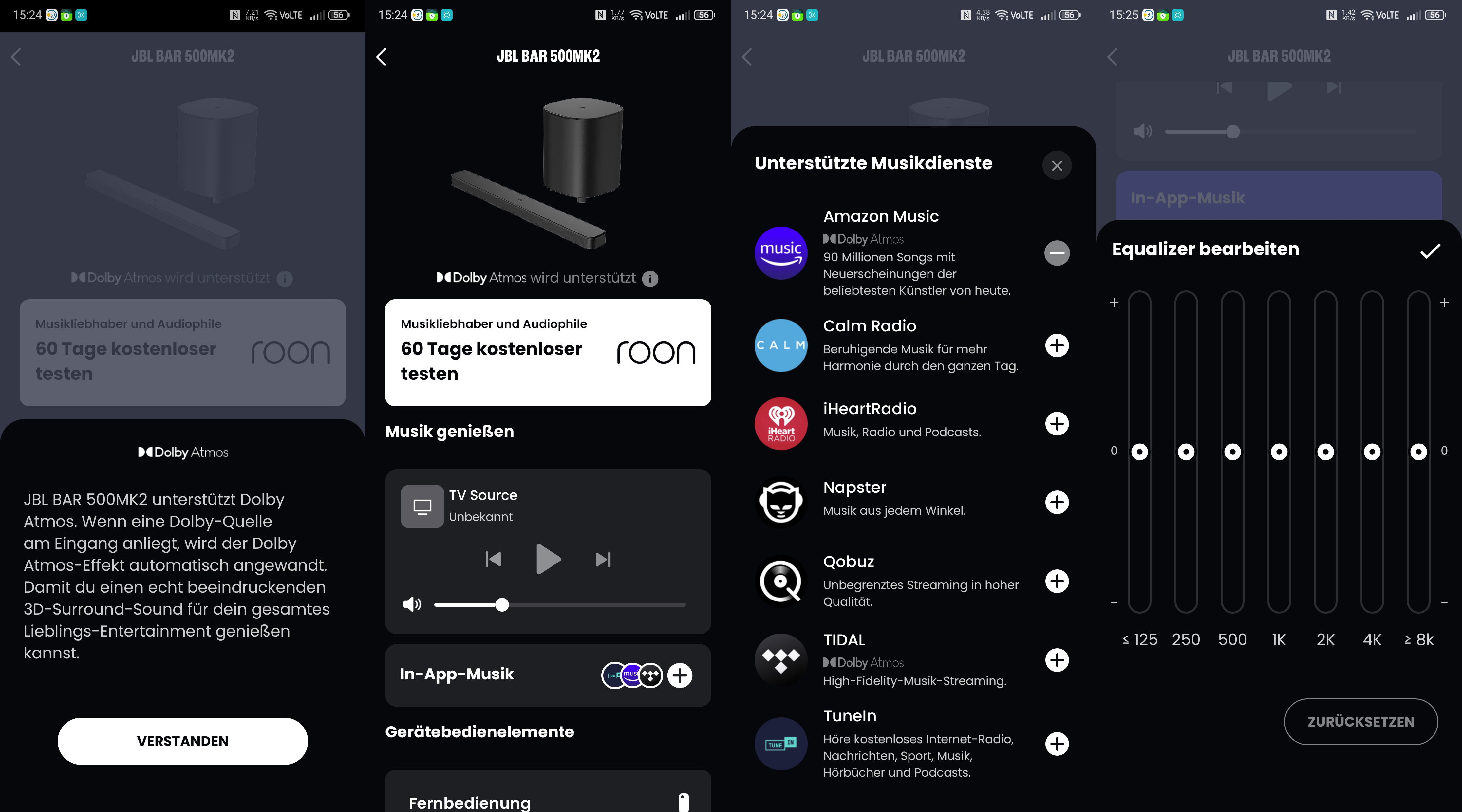 Die volle Funktionalität der JBL Bar 500MK2 ist über die App „JBL One“ zugänglich. Die App ermöglicht die Musiksteuerung, kann die Fernbedienung ersetzen und beinhaltet einen grafischen Equalizer für Klanganpassungen. Im Gegensatz zu einigen Konkurrenzmodellen sind keine voreingestellten Klangprofile vorhanden; die Einstellungen müssen manuell im Equalizer vorgenommen werden.