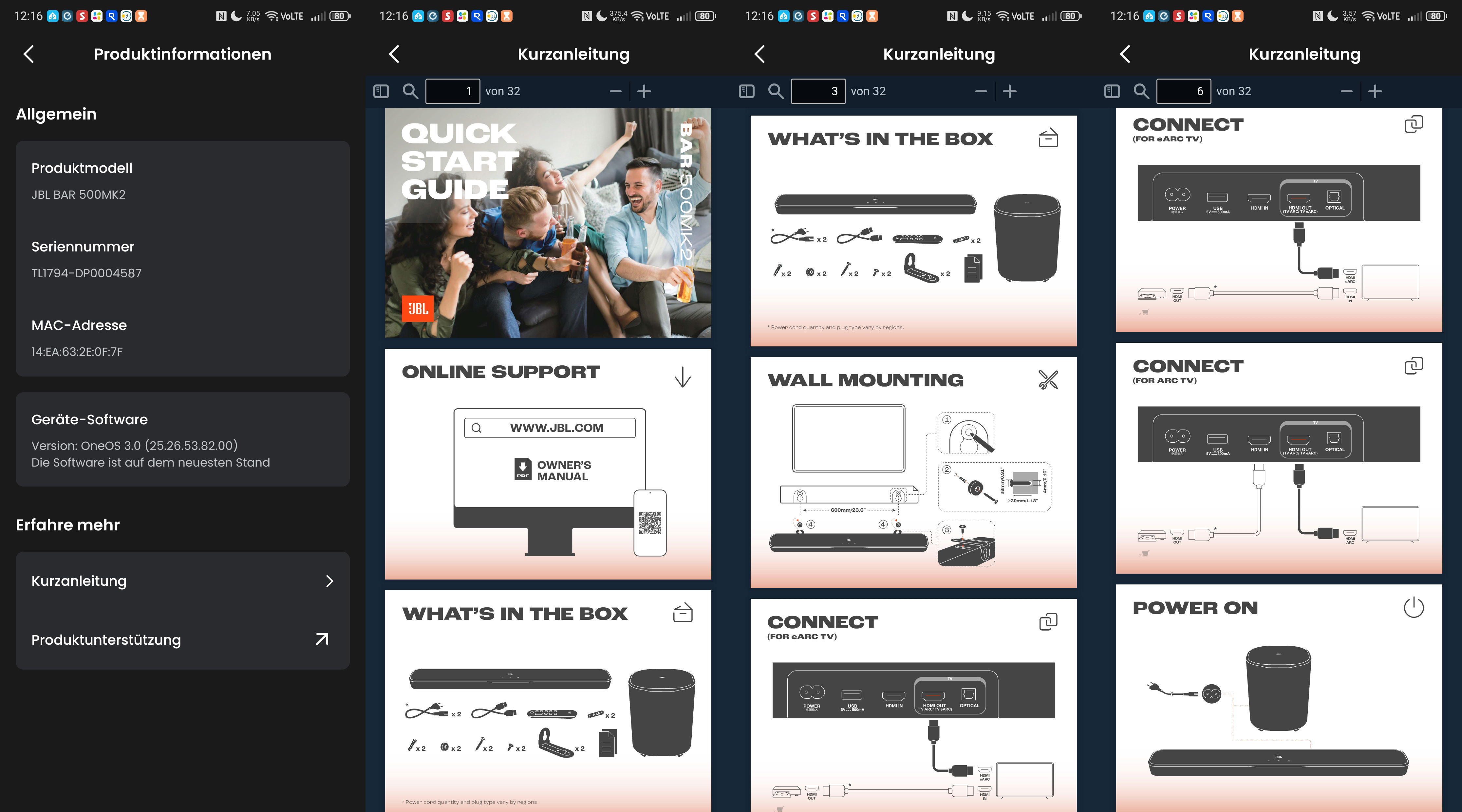 Mit der App JBL One, die keine Registrierung erfordert, wird die Bar 500MK2 konfiguriert. Sie integriert außerdem die Kurzanleitung, sodass man alle wesentlichen Informationen schnell zur Hand hat.