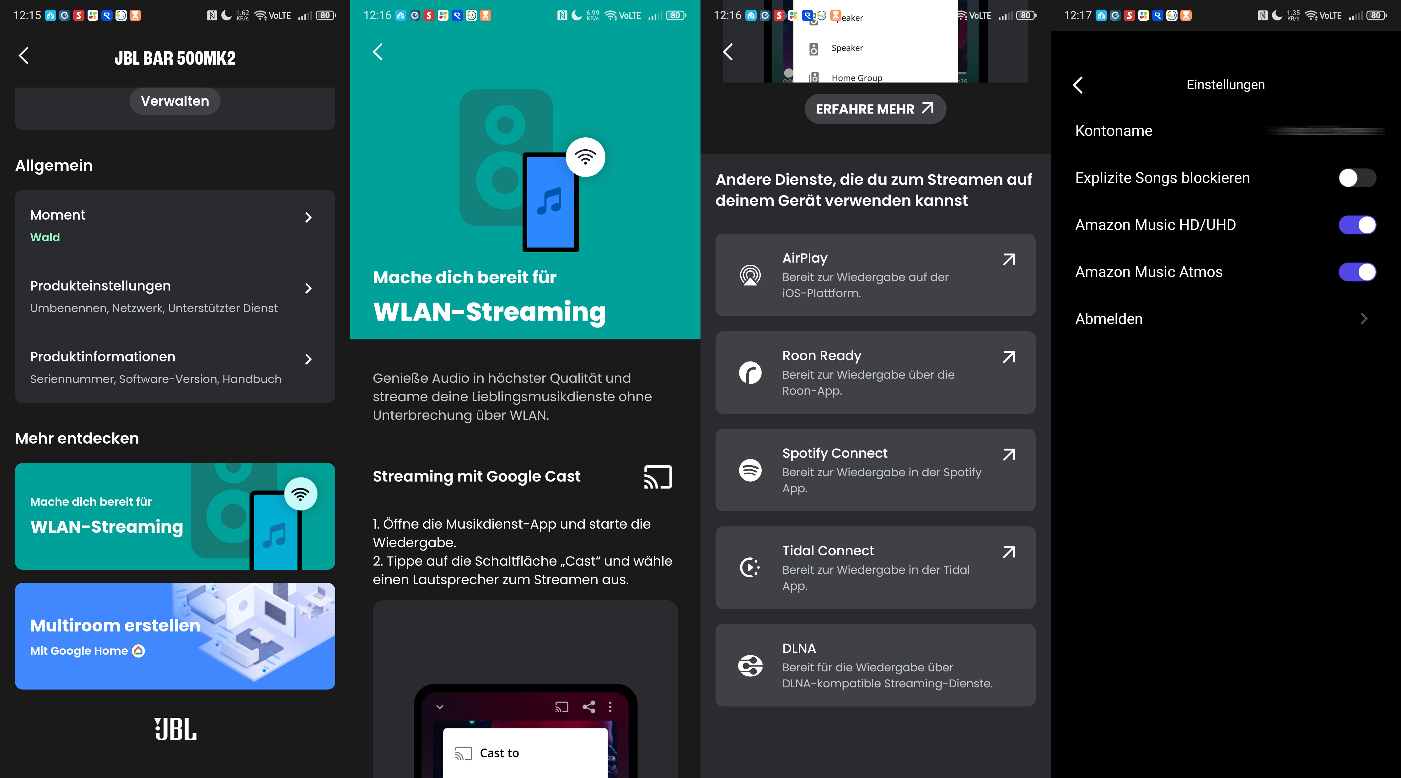 Neben dem Multiroom-Dienst Roon integriert JBL One die Streamingdienste Amazon Music, Calm Radio, iHeart Radio, Napster, Qobuz, Tidal und Tune In. Spotify können Anwender über die Option WLAN-Streaming ansteuern.
