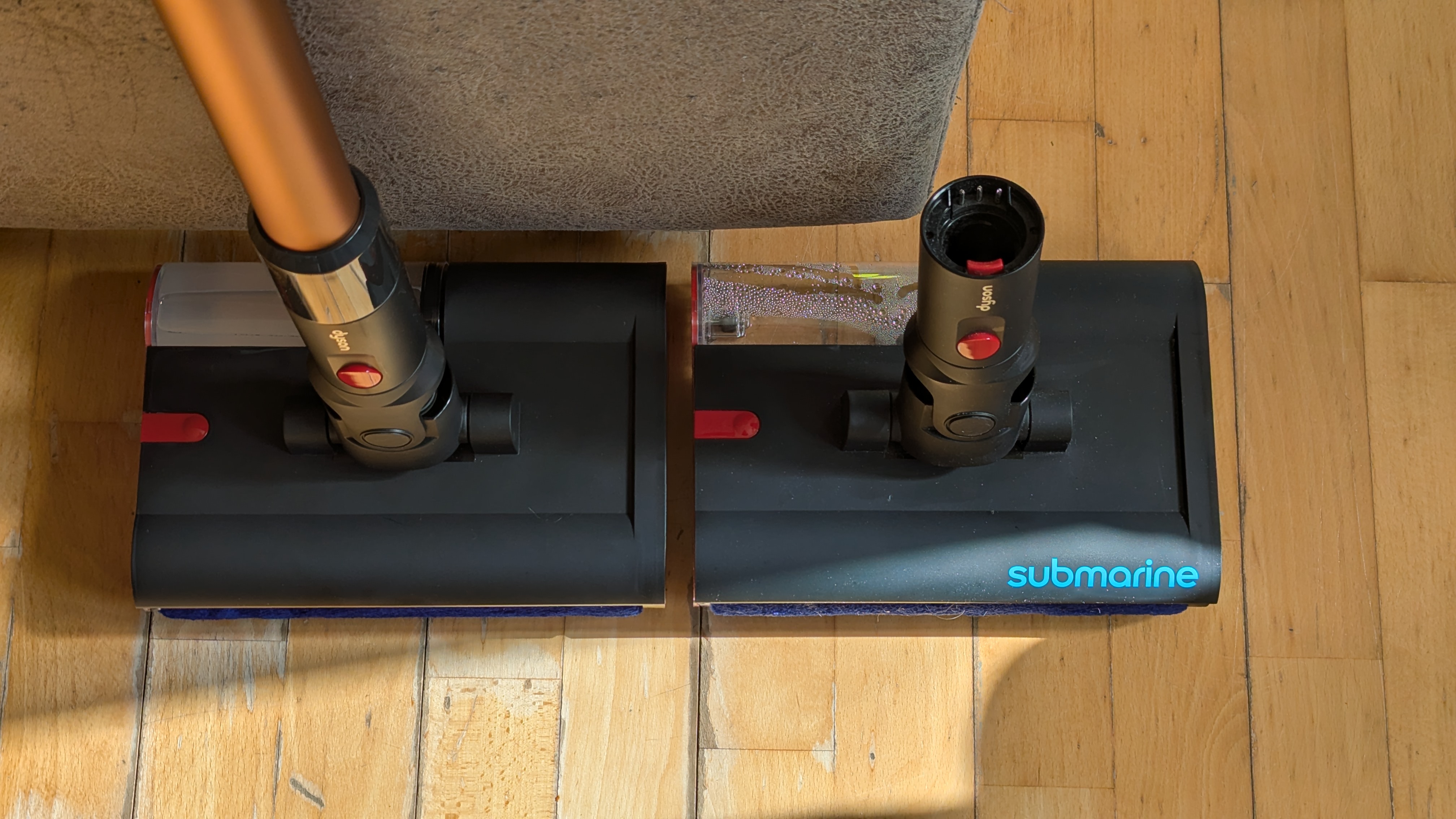 Der vergleichsweise klobige Korpus eines Wischsaugers verhindert daher häufig einfaches Wischen unter Möbeln, zumal bei den meisten Modellen der Wischkopf nicht bis 180 Grad gestreckt werden kann, sondern eher bis 140 Grad. Geht man mit dem Griff doch weiter runter, um etwa unter die Couch zu kommen, hebt sich der Wischkopf einfach ab und verliert dann seine Reinigungswirkung. Im Extremfall kann bei manchem Modell Wasser aus den Tanks auslaufen und sogar den Motor zerstören, beim normalen Wischen muss man davor aber keine Sorge haben. Mittlerweile gibt es jedoch auch diverse Modelle wie den Roborock F25 Ace oder den Mova X4 Pro, die sich komplett waagerecht auf den Boden legen und so problem- und gefahrlos unter Möbeln wischen und saugen können.