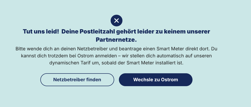 In der zweiten Wohnung derselben Eigentumswohnanlage, die von Tibber mit Strom versorgt wird, weist uns die App zwar auf ein Smart Meter hin. Doch nach der Überprüfung der Standortdaten heißt es dort: „Es sieht so aus, als ob dein Netzbetreiber noch keine Smart Meter für deine Postleitzahl anbietet. Wir empfehlen dir, dich direkt mit deinem Netzbetreiber in Verbindung zu setzen, um zu schauen, was möglich ist.“