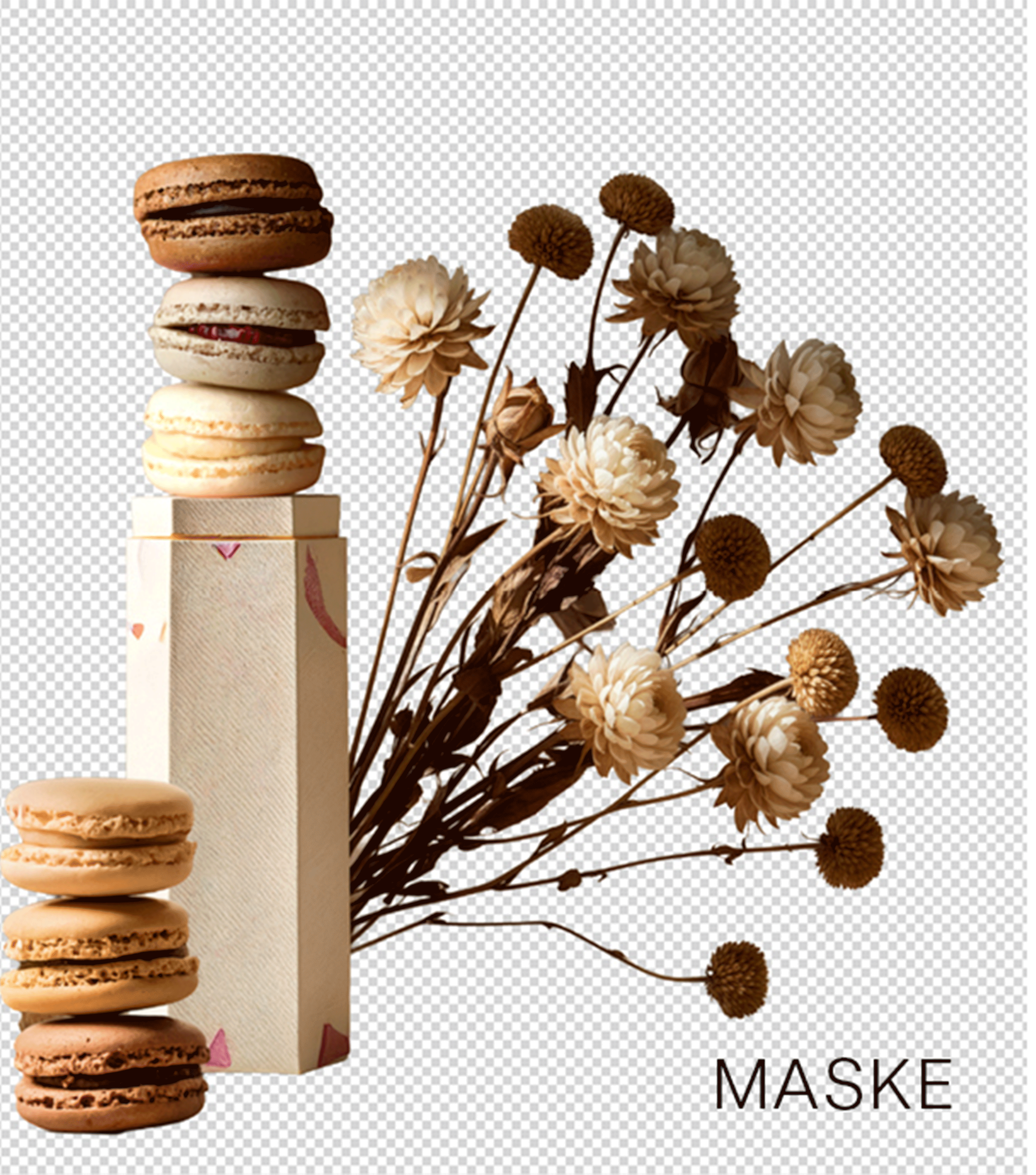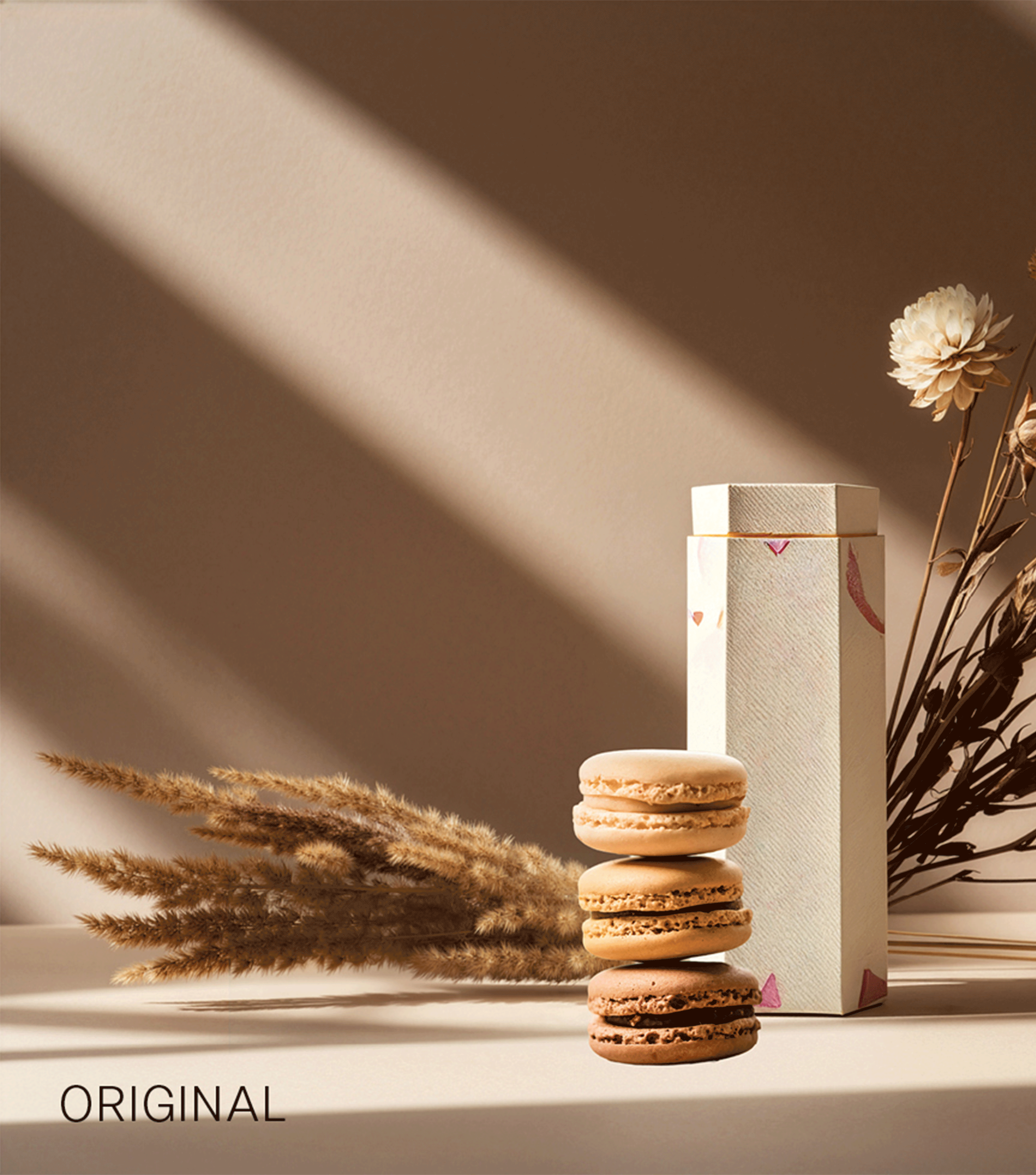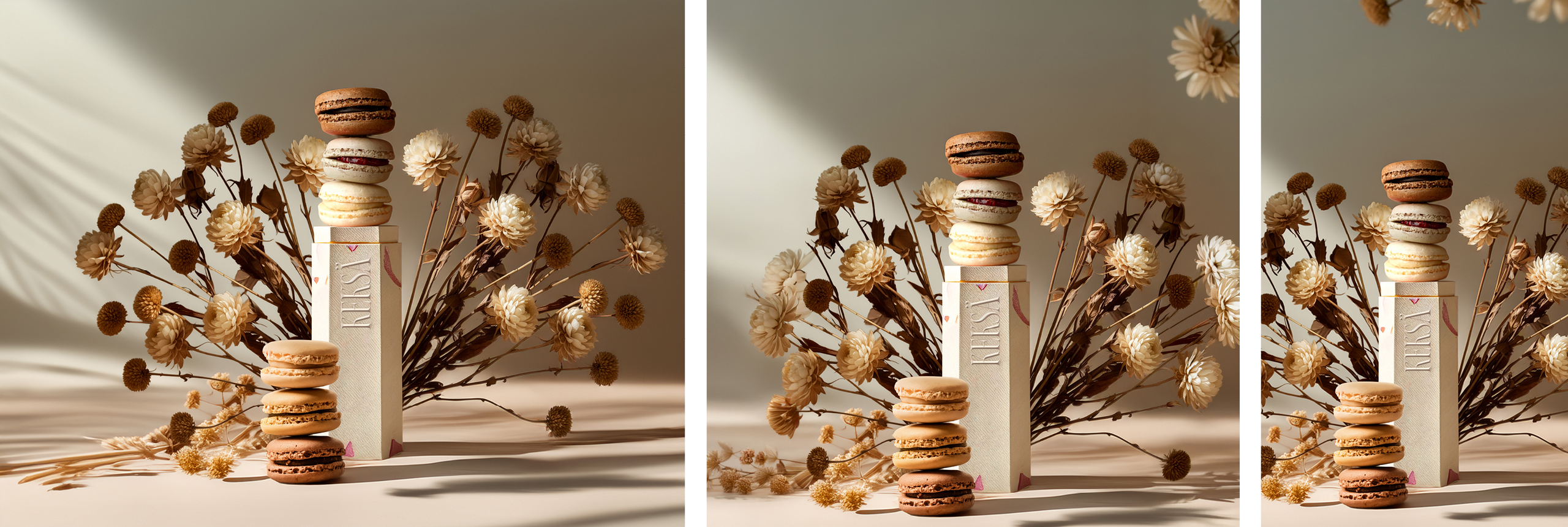 Wir testen das mit den Macarons, für die unser Visual am Ende werben soll. Dafür hatten wir zuerst getestet, die beiden Cookies im Vordergrund mittels eines Referenzbildes auszutauschen, aber das Ergebnis verzerrt zu sehr die tatsächlichen Produktbilder.