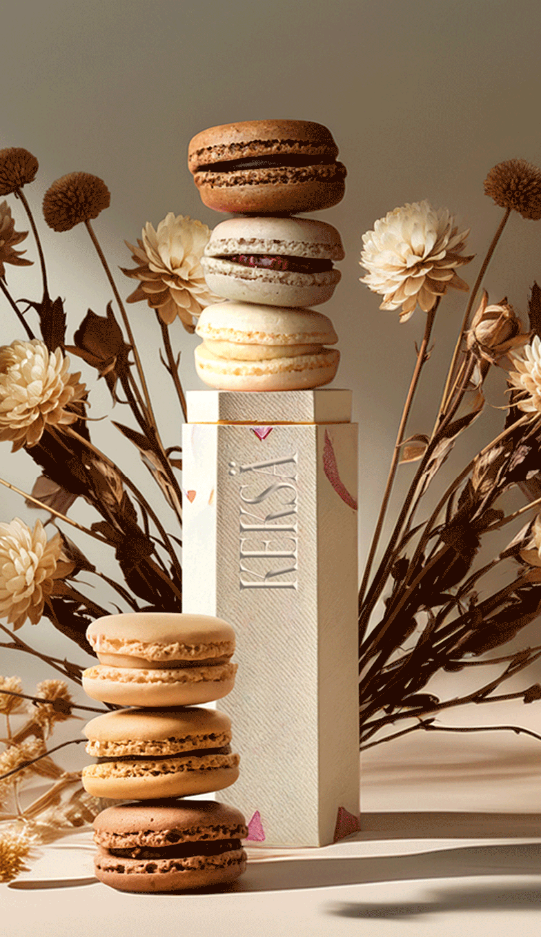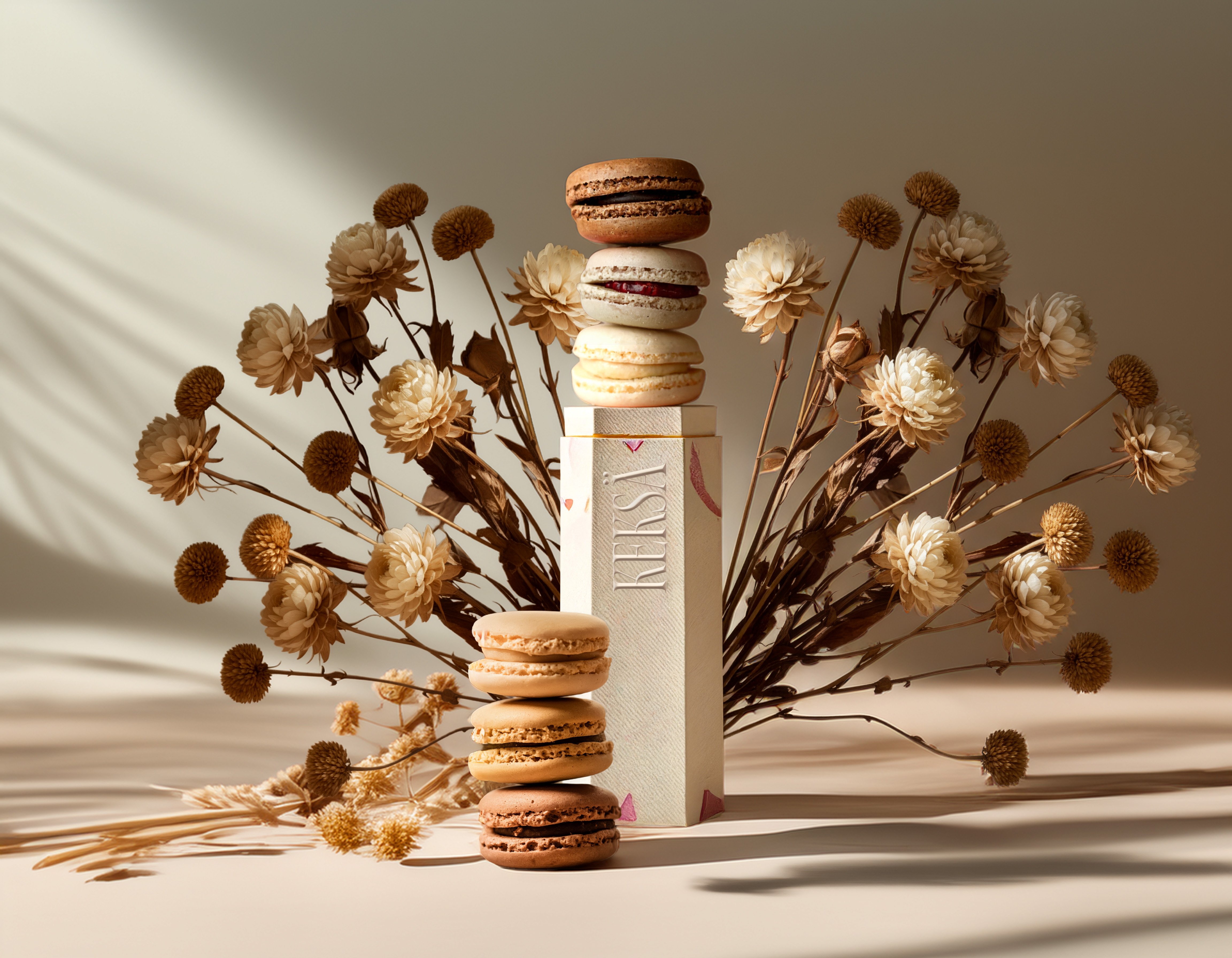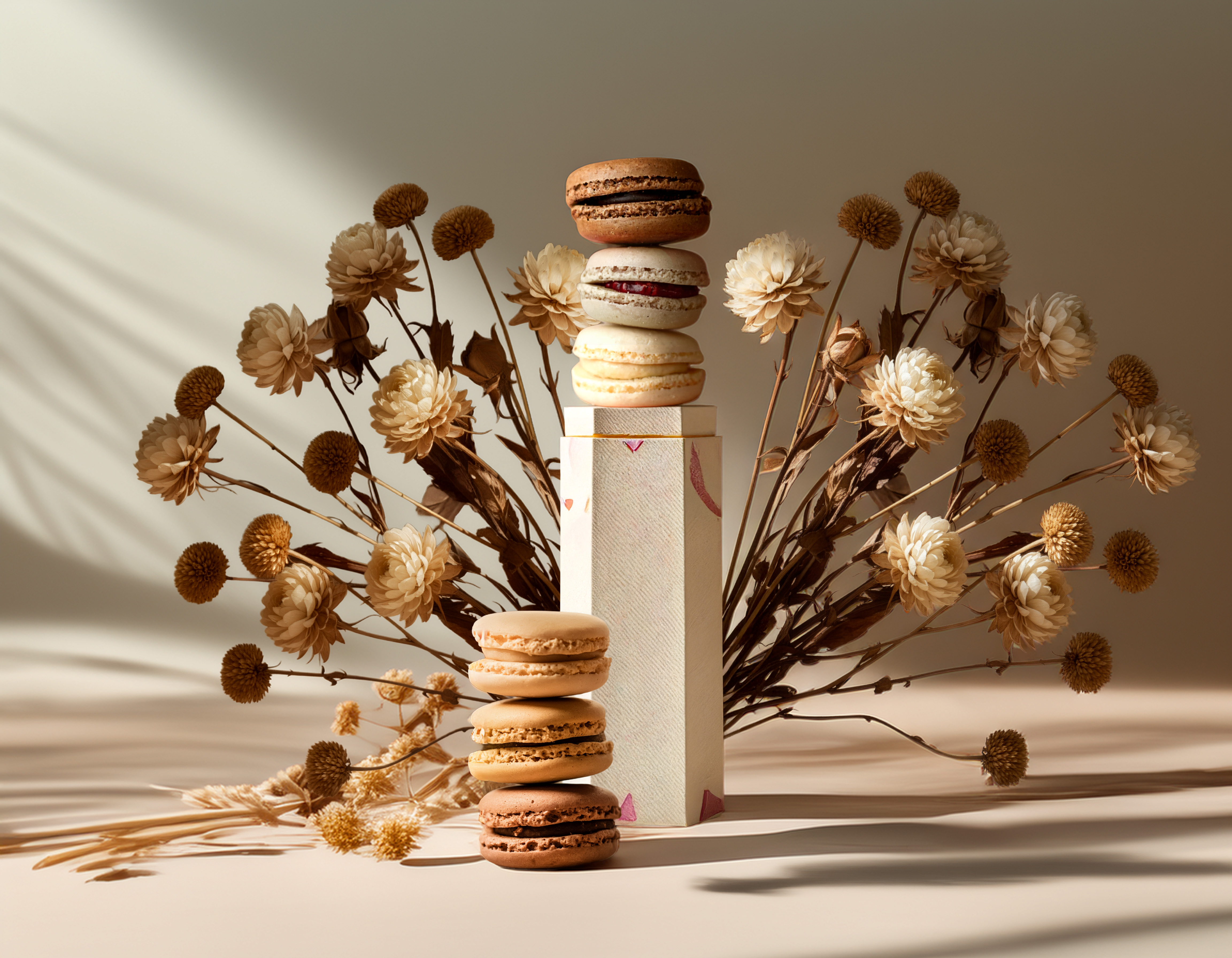 Wir testen das mit den Macarons, für die unser Visual am Ende werben soll. Dafür hatten wir zuerst getestet, die beiden Cookies im Vordergrund mittels eines Referenzbildes auszutauschen, aber das Ergebnis verzerrt zu sehr die tatsächlichen Produktbilder.