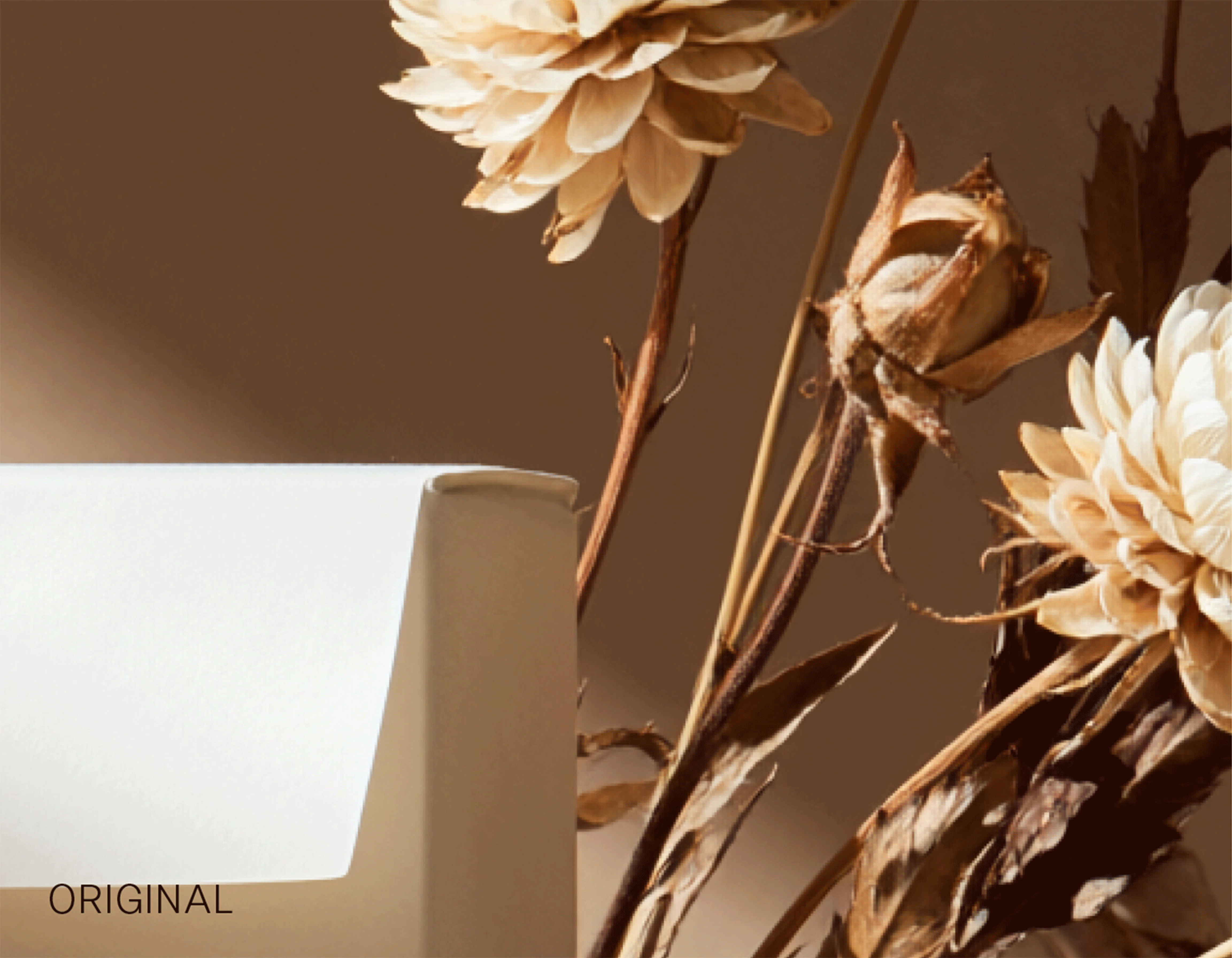 Zuletzt wollen wir noch die Trockenblumen aus dem originalen Bild auf die andere Seite des Packagings spiegeln. Dazu duplizieren wir den Bildausschnitt und fügen ihn auf einer Ebene unter unserem maskierten Packaging ein. Mit dem Harmonisieren-Button können wir dann die Lichtstimmung so anpassen, dass zwar die Symmetrie bestehen bleibt, aber sich die Blumen dennoch realistisch in die Szene einfügen.