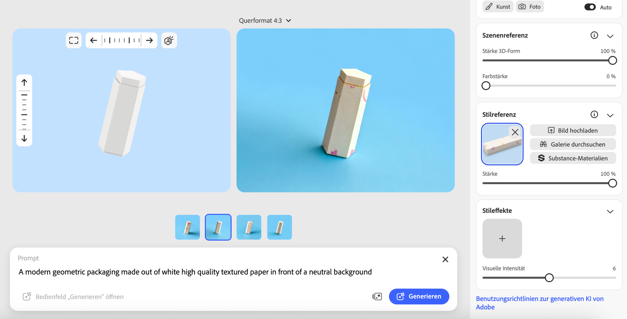 Das Packaging im Bild ist aber nur ein Platzhalter – für die Verpackung selbst modellieren wir die Form mit Project Neo (eine genaue Anleitung findet ihr hier) und nutzen eine mit Firefly generierte Materialreferenz, um so nah wie möglich an unser gewünschtes Ergebnis zu kommen. Die Kombination aus Basisbild und Packaging geht anschließend ganz einfach in Photoshop.