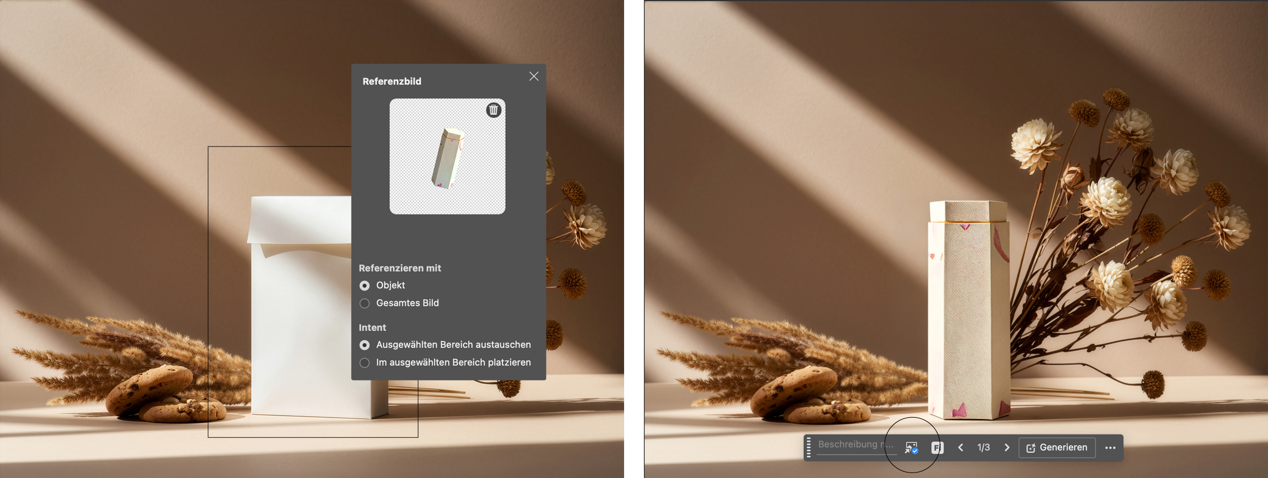 Dazu wählen wir grob das Packaging im Bild aus und klicken in der KI-Kontextleiste auf Generatives Füllen und das Bildsymbol, das nun rechts von der Texteingabe erscheint. Im Pop-up wählen wir nun unser modelliertes Packaging als Referenzbild. Hier gibt es die Option, entweder nur das gezeigte Objekt einzusetzen oder das gesamte Bild in die Komposition einzufügen.