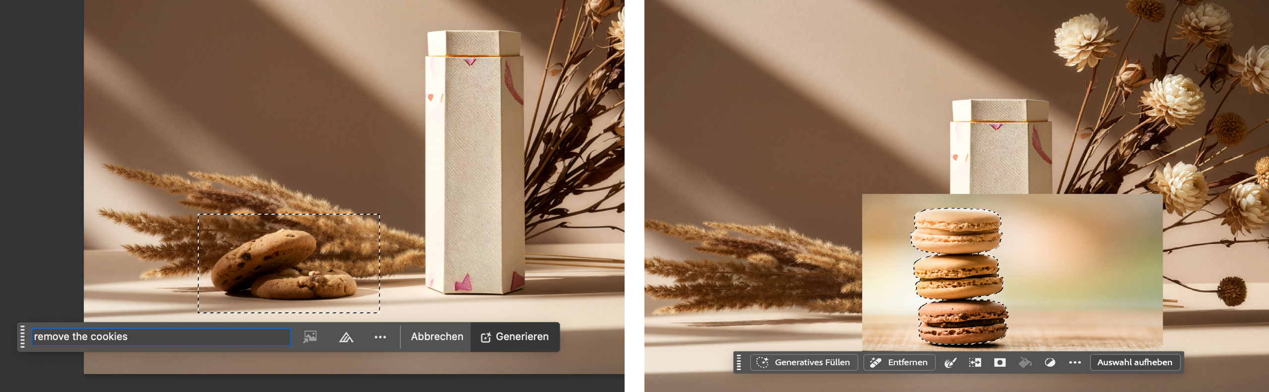 Einen zweiten kleinen Turm aus Macarons wollen wir jetzt auf der Verpackung selbst platzieren. Mit dem neutralen Hintergrund können wir hier einfach Generatives Füllen mit Bildreferenz nutzen und die Funktion »Objekt platzieren« auswählen. Dadurch verändert sich leicht die Szene (erkennbar an der Oberkante des Packagings), um für die drei neuen Macarons Platz zu schaffen.