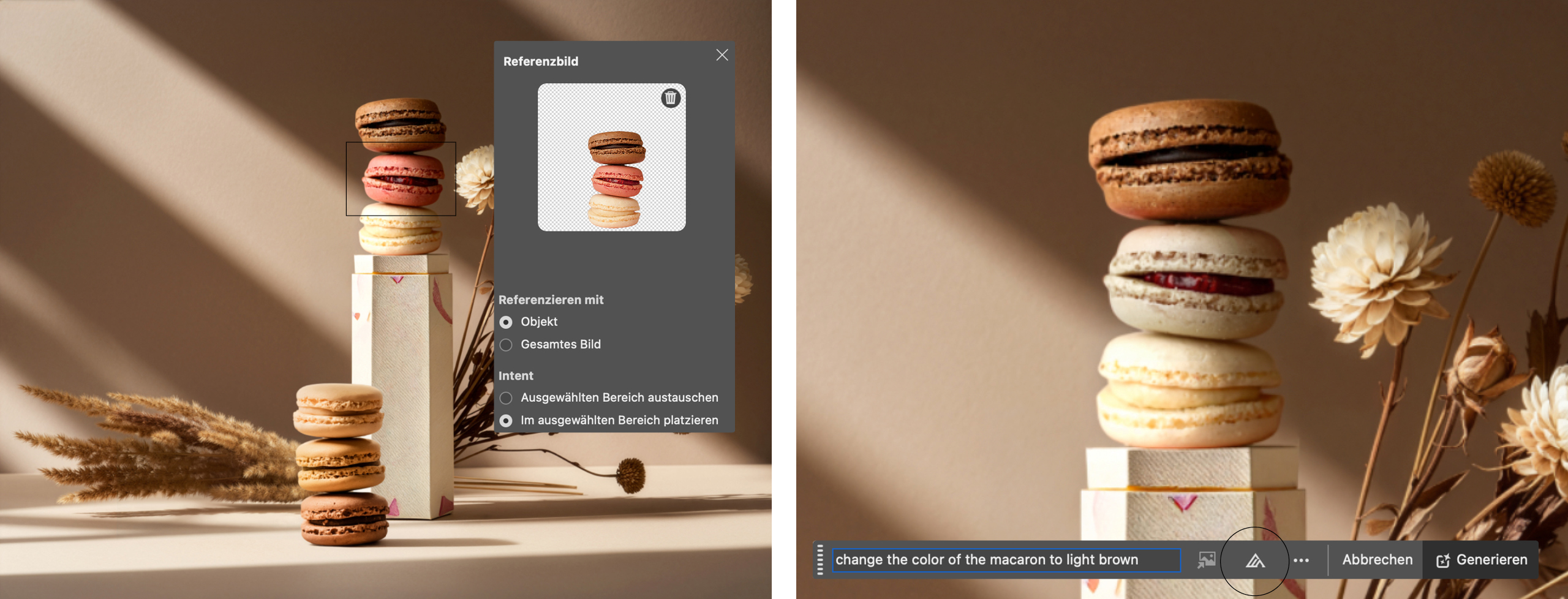 Das hier verwendete Referenzbild passt allerdings wegen des roten Macarons in der Mitte farblich nicht ganz in unsere Szene. Das lässt sich jetzt in Photoshop mit dem neu integrierten Flux Kontext Pro Model schnell ändern: mit einer groben Auswahl und einem Prompt, der sich spezifisch auf die gewünschte Farbe des Macarons bezieht.