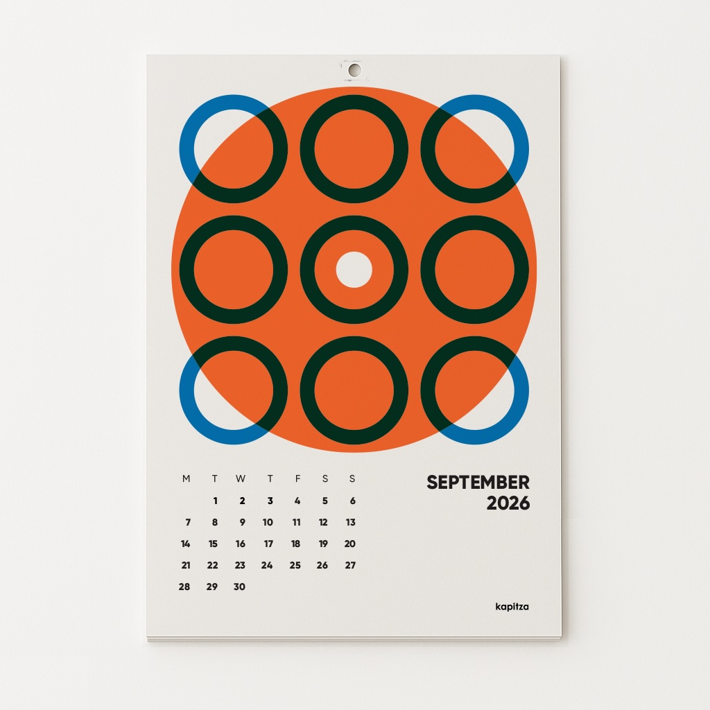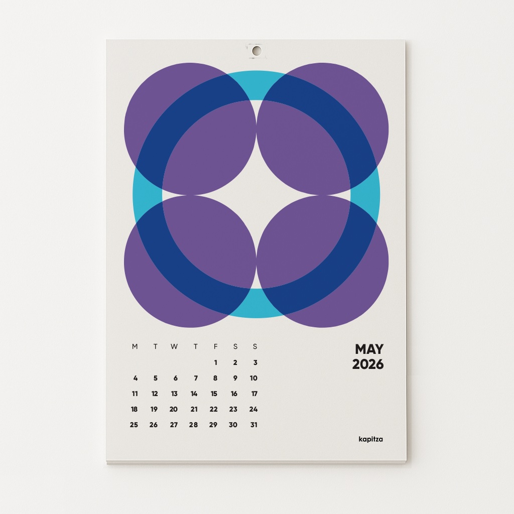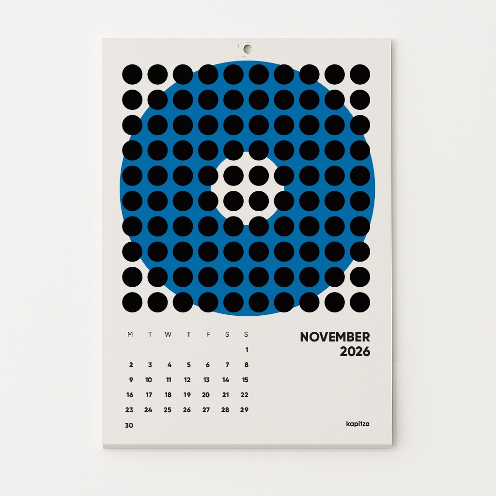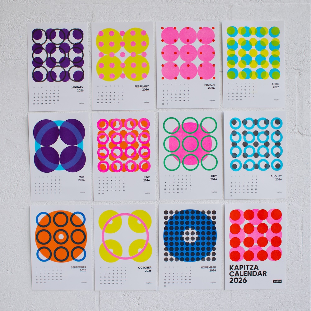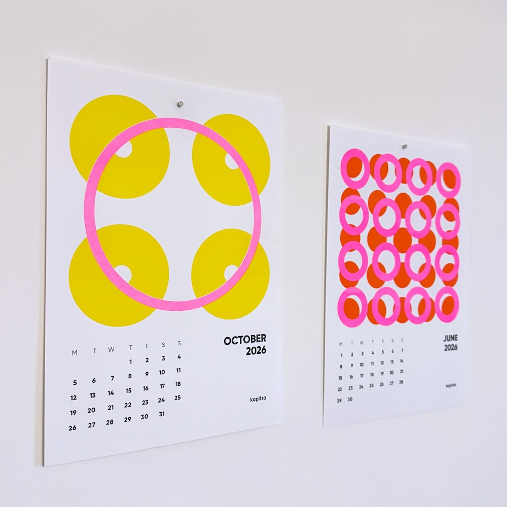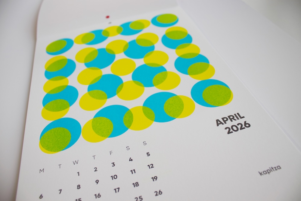 »Mit diesem Kalender haben wir eine unserer liebsten Ideen erforscht: wie sich etwas so Einfaches wie Kreise, die in einem Raster angeordnet sind, verwandeln können«, heißt es von Petra Kapitza. Und das, wenn sie verschiedenartig kombiniert werden und beim Drucken übereinandergelegt.