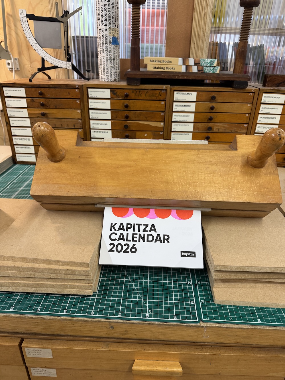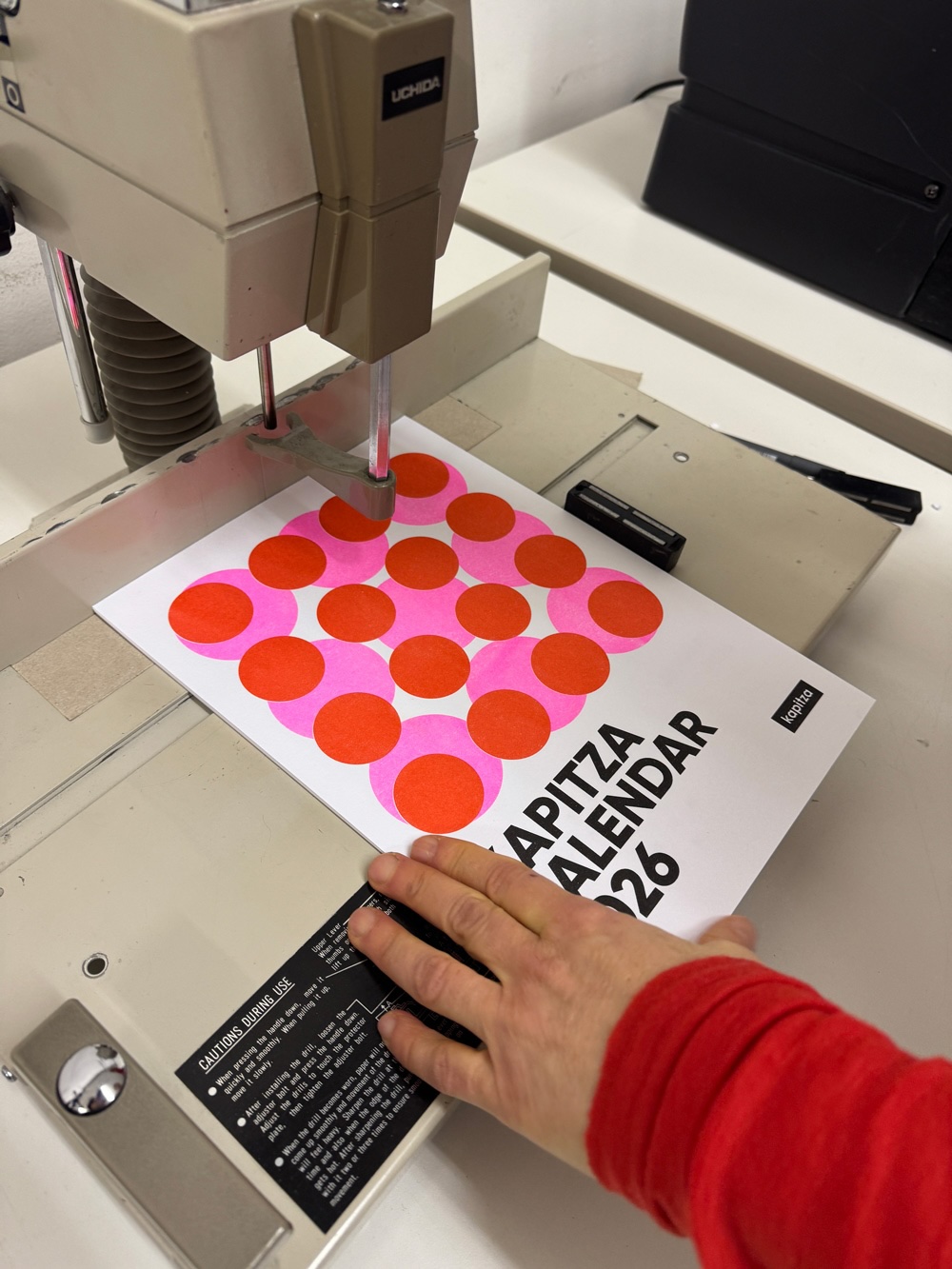 Hier ist alles von Hand gemacht. Jedes der 13 Blätter aus denen der neue Kalender von Petra und Nicole Kapitza und ihrem Kreativstudio Kapitza besteht, ist handgedruckt. Ein Einzelstück, das auf einem originalem Risographen entstand und anschließend von den beiden gebunden wurde.