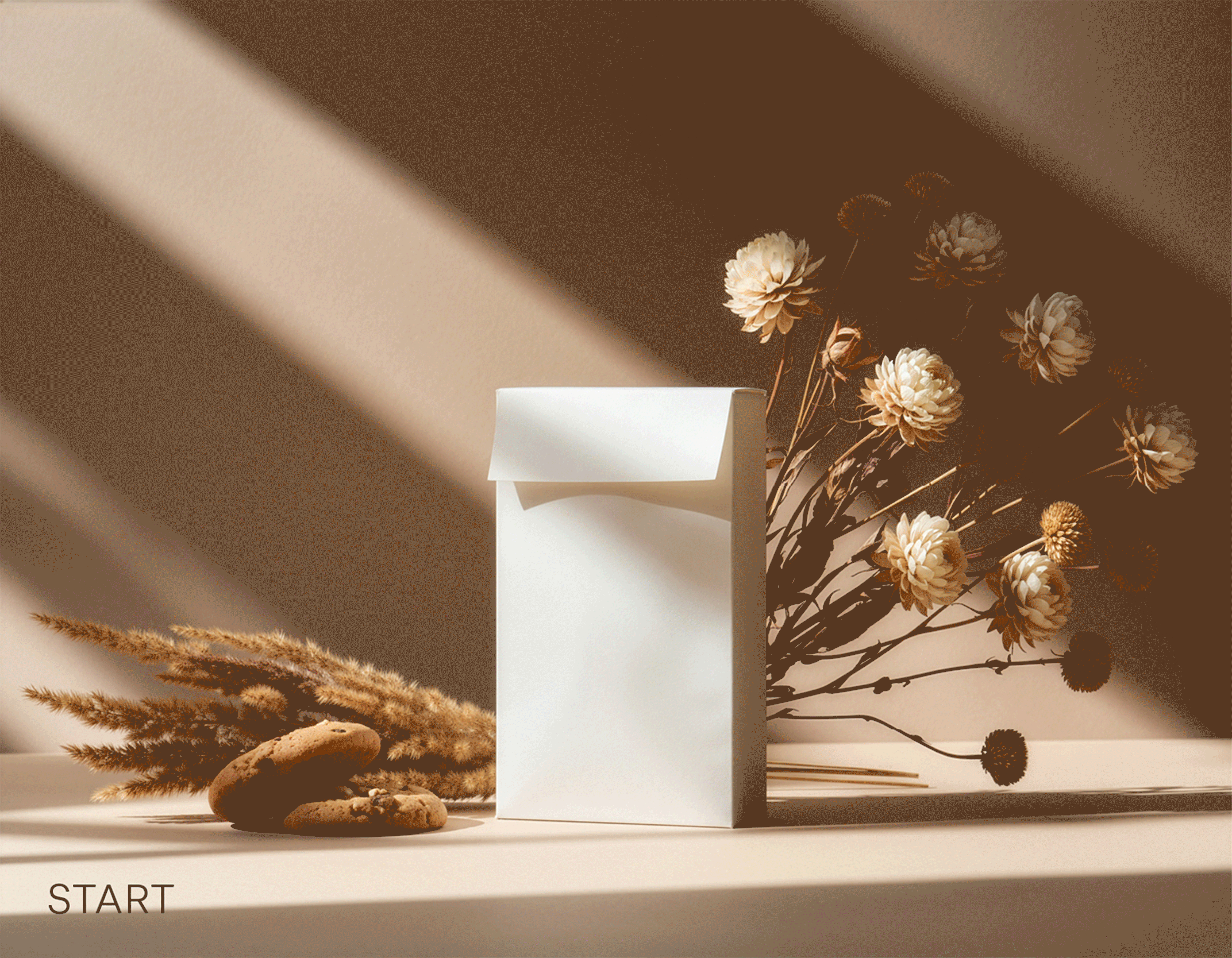 Wir haben für unser Projekt wieder auf die erprobte Kombination aus Project Neo und Firefly Web gesetzt. Mit Firefly generieren wir zunächst unsere Szene als Basis: ein Product-Shot für eine Keksmarke, inszeniert mit warmen Farben und Trockenblumen.