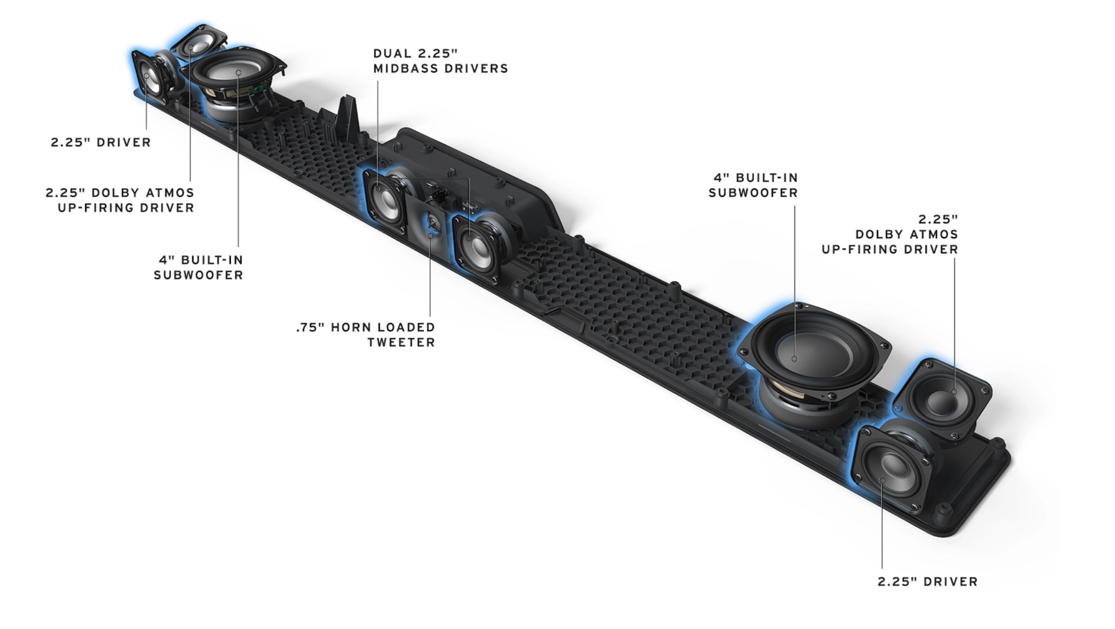 Für kabellose Verbindungsaufnahme gibt es nur Bluetooth. WLAN, Air Play, Chromecast, Spotify Connect und Multiroom-Funktionen sind nicht Teil der Ausstattung. Gleiches gilt für Sprachsteuerung, eine entsprechende Funktion ist ebenfalls nicht integriert. Zu den nutzbaren Tonformaten gehören Dolby Atmos, Dolby Digital, DTS Digital Surround und Dolby Digital Plus. DTS:X wird hingegen nicht unterstützt. 9 Treiber baut Klipsch in den Klangriegel mit einer Gesamtleistung von 185 Watt ein: 2 × Tieftöner mit je 4 Zoll, 2 × Höhenlautsprecher mit je 2,25 Zoll, 2 Lautsprecher für die Kanäle links und rechts mit je 2,25 Zoll und ein Center, bestehend aus 2 × 2,25 Zoll für Mitten und einem Hochtöner mit 0,75 Zoll. Mit diesem Set-up soll die Flexus Core 200 einen Frequenzbereich von 43 Hz bis 20 kHz spielen.