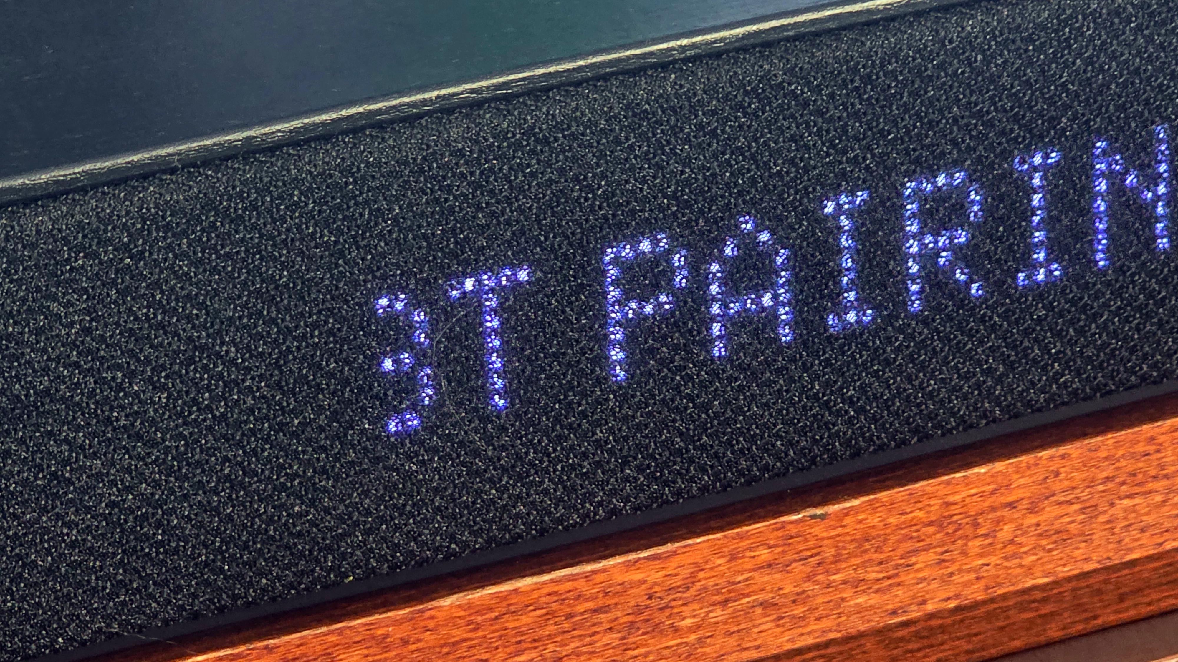 Die Klipsch-Soundbar ist knapp 112 cm breit, 7,8 cm hoch und fast 13 cm tief. Mit 8,5 kg ist sie für eine Einzel-Soundbar recht schwer und wirkt stabil. Das deutet auf ordentliche Bassreserven hin. Das Format passt gut zu großen Fernsehern, kann aber bei kleinen TVs das Bild unten leicht verdecken. Die Optik ist zurückhaltend und vor allem auf Funktion ausgelegt. Das kantige Design wirkt eigenständig. Oben sitzen seitliche Metallgitter, in der Mitte eine Abdeckung in dunkler Holzoptik. Vorn und an den Seiten nutzt Klipsch Stoff. Das Metalllogo ragt vorne rechts sichtbar in die Front – außergewöhnlich.