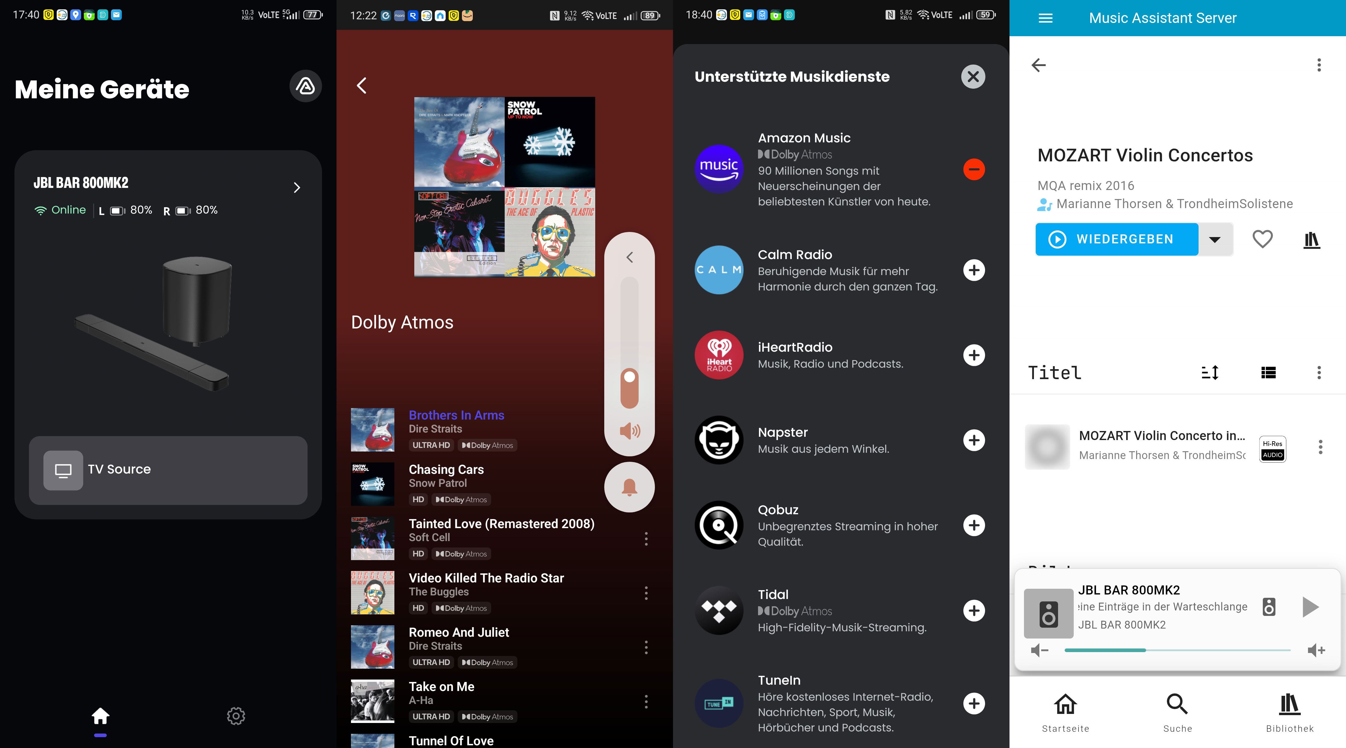 Die App JBL One bietet nicht nur detaillierte Informationen zur Aufstellung und Abstimmung der Soundbar, sondern integriert auch zahlreiche Streamingdienste. Mit dabei ist etwa Amazon Music, Calm Radio, iHeart Radio, Napster, Qobuz, Tidal und TuneIn. Darüber unterstützt sie Air Play, Google Cast, Roon Ready und Spotify Connect. Das ist aber bislang nicht alles. Die JBL Bar 800MK2 kann unter Home Assistant auch als Ausgabegerät für einen Medienserver genutzt werden. Einen direkten Zugriff auf einen im heimischen Netzwerk befindlichen Medienserver bietet die JBL Bar 800MK2 hingegen nicht.