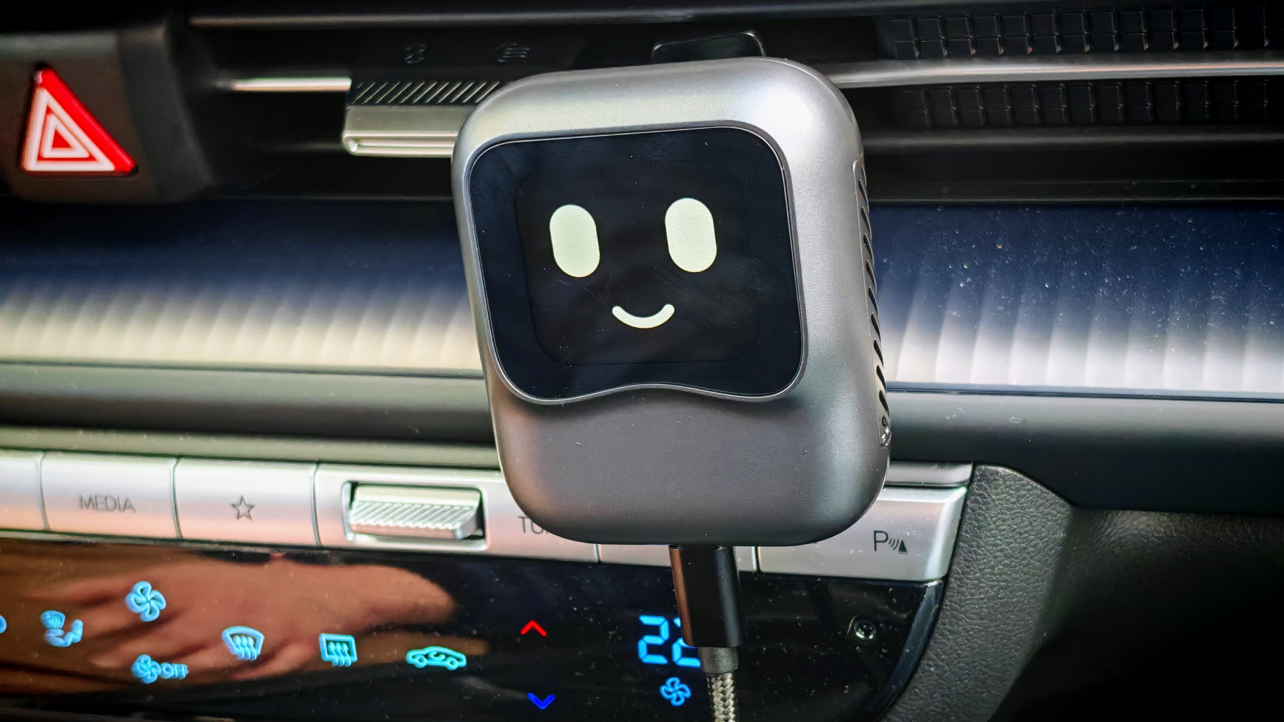Optisch hebt sich die Ottocast Nano Ai (auf der Schachtel steht hingegen der Name Ottoaibox Nano) deutlich von der Konkurrenz ab. Statt eines flachen Adapters oder halbmondförmigen Kunststoffplättchens erinnert das Modell von Ottocast an einen kleinen Bildschirm. Auf dem Display erscheint ein Emoji-Gesicht, sobald das Gerät aktiviert ist.