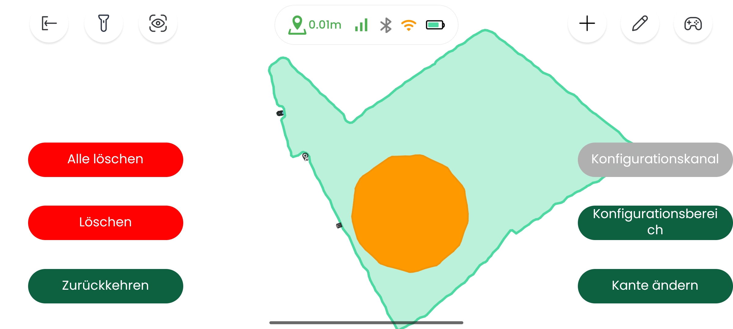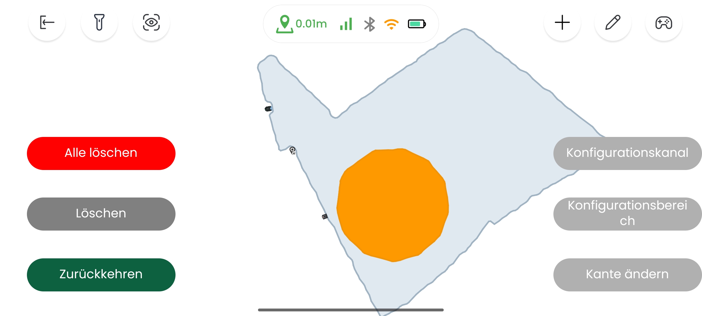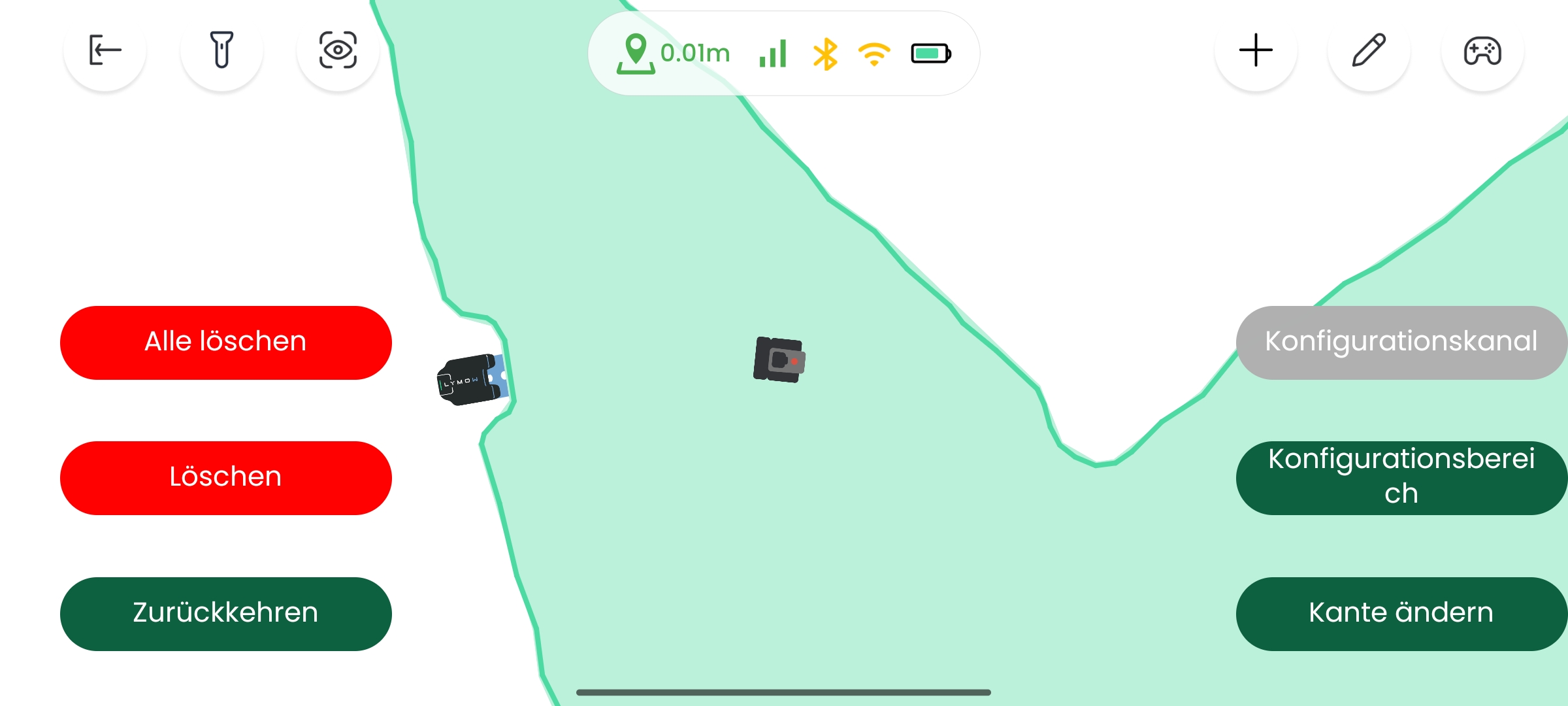Stattdessen wird der Lymow One für das Erstellen der Mähbereiche wie ein RC-Auto entlang der Ränder gesteuert. Die Steuerung erfolgt im Querformat und wie bei Mammotion mit zwei virtuellen Steuerelementen. Sie ist angenehm direkt, ohne zu sensibel zu sein. Der Mäher merkt sich so die Rasengrenzen und erstellt daraus die Karte. Für No-Go-Zonen wie Beete oder einen Teich geht es genauso weiter, außerdem verlangt der Lymow One wie die Konkurrenz Verbindungskorridore, sofern mehr als eine Rasenfläche angelegt ist. Anders als bei Wettbewerbern mussten wir dem Mäher beim ersten Anlernen auch die Position der Ladestation mitteilen, obwohl wir ihn daraus gestartet haben. Der Grund ist wie oben angedeutet, dass er grundsätzlich auch ohne auskommt.