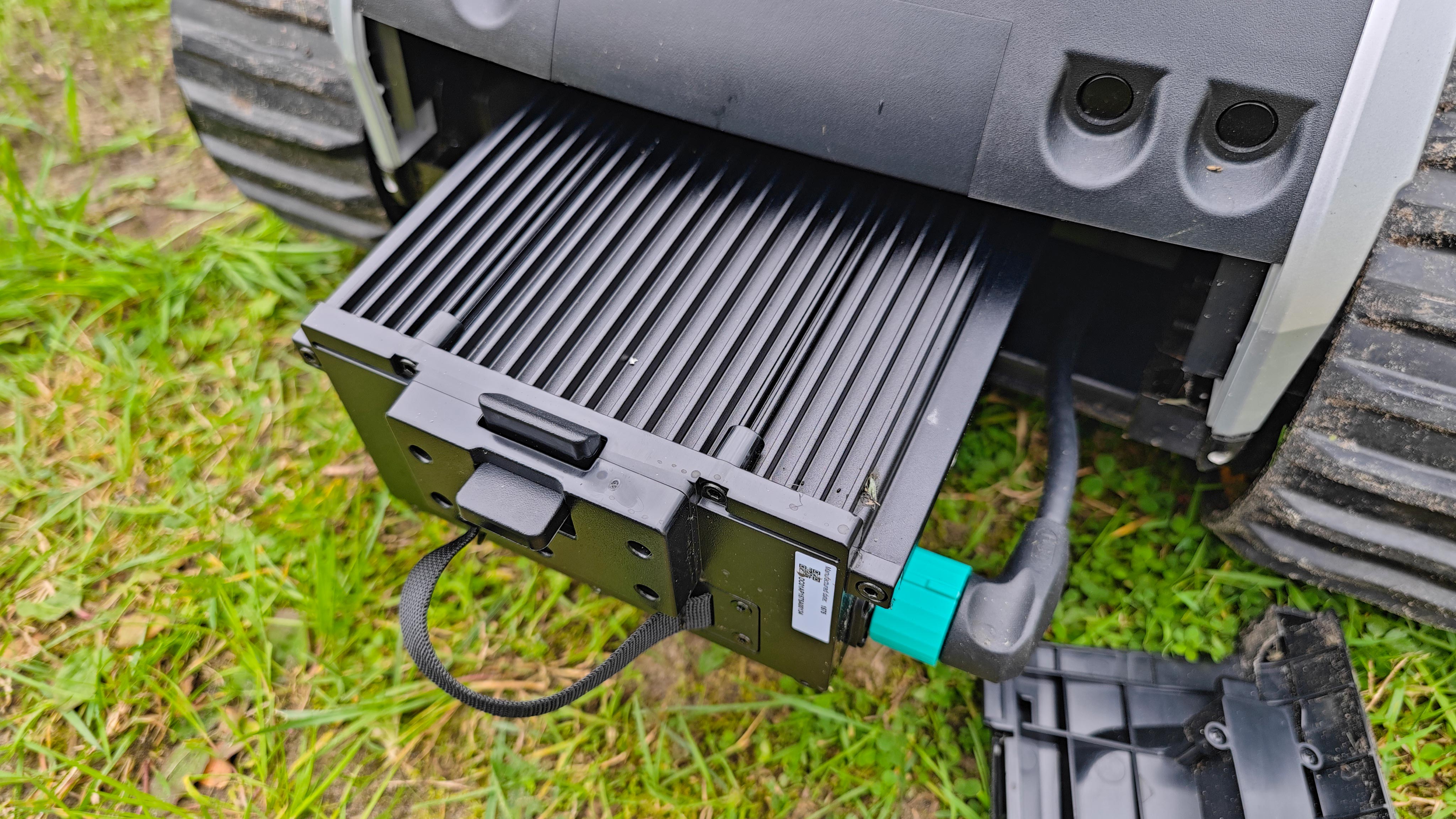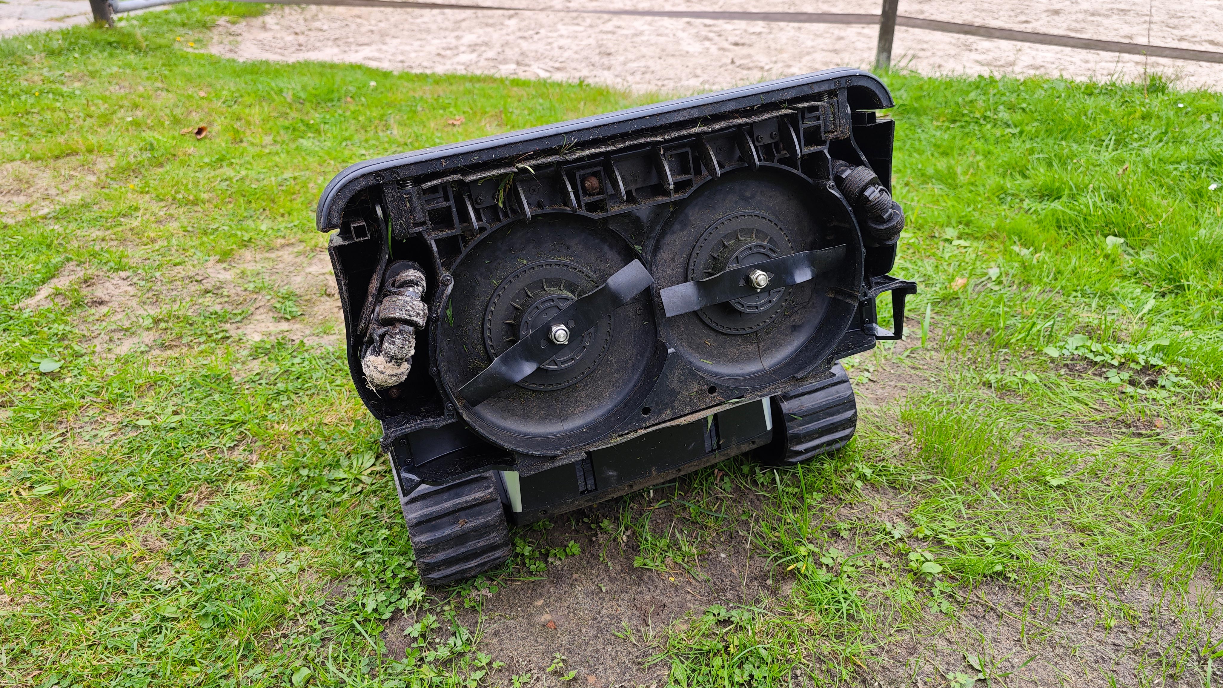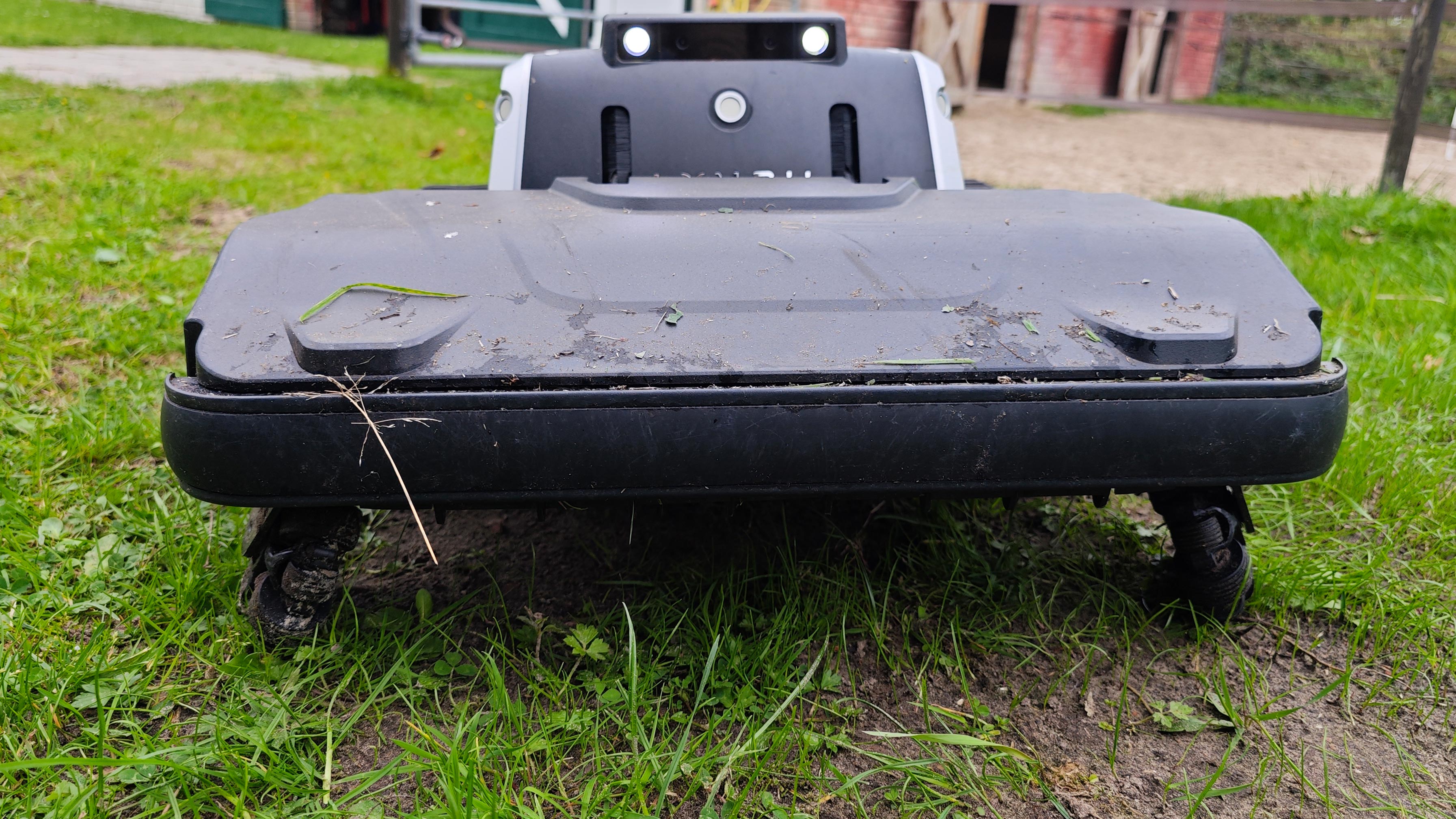 Der Mäher ist groß und vor allem schwer: 78 × 56 × 32 cm sind eine Ansage und 35,2 kg erst recht. Angst um das eigene Grün ist da wohl nachvollziehbar, denn das ist richtig viel für einen Mähroboter. Vierrad-angetriebene Modelle wie ein Mammotion Luba 2 (Testbericht), der ebenfalls gut klettern kann und für große Flächen ausgelegt ist, wiegen gerade mal die Hälfte. Allerdings gibt es Entwarnung, zumindest in der Theorie: Das Gewicht verteilt sich wegen der breiten Auflagefläche der Raupenketten auf mehr Fläche, der Bodendruck pro Quadratzentimeter ist deutlich niedriger als bei einem gleich schweren Radmodell. Zudem hilft die Extra-Traktion auf weichem Untergrund und am Hang. Die offizielle Angabe zur Steigfähigkeit liegt entsprechend bei satten 100 Prozent, das entspricht 45 Grad Steigung. Der zuvor genannte Luba 2 kommt „nur“ auf 80 Prozent.