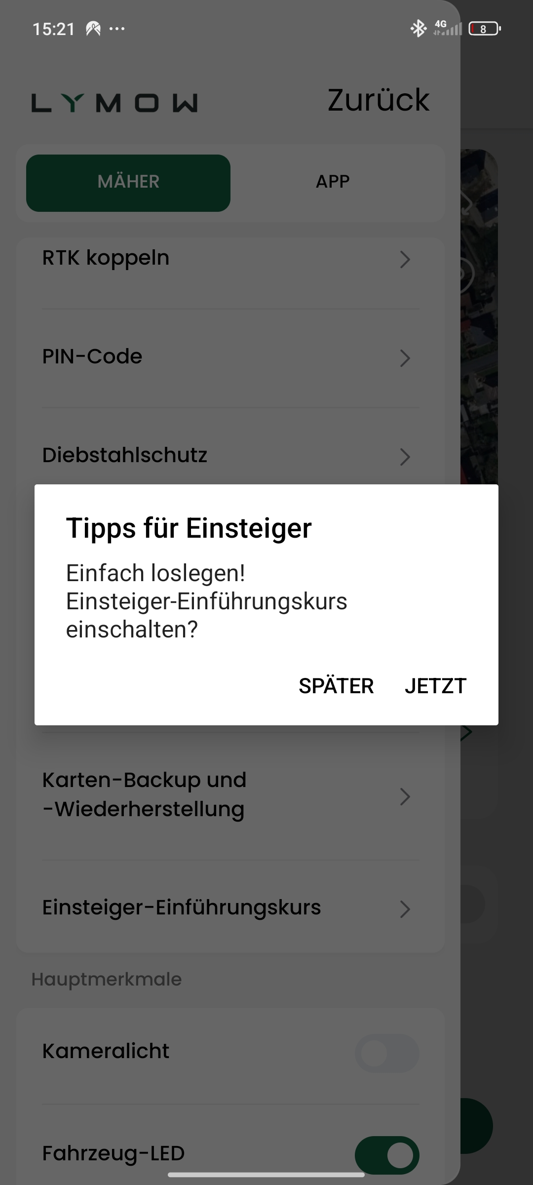 Die Einrichtung des Lymow One beginnt mit der Positionierung der RTK-Antenne. Wie immer ist dafür freie Sicht zum Himmel wichtig, Abstand zu Gebäuden, großen Pflanzen oder Bäumen ist essenziell. Danach wird die Ladestation platziert, der Roboter aktiviert sowie die Lymow-App heruntergeladen. Als erster Schritt in der App wird der Roboter angelernt, was mit wenigen Klicks problemlos funktioniert. Dann folgt die Kartierung. Aktuell klappt das ausschließlich manuell, eine automatische Erkennung von Rasenflächen gibt es bisher nicht. Schlimm ist das nicht, da das bislang bei keinem Mähroboter ordentlich klappt – zumindest an den Randbereichen.