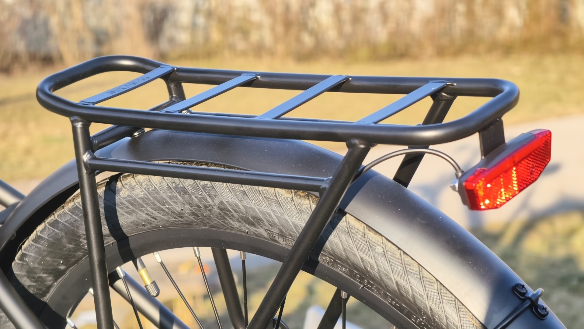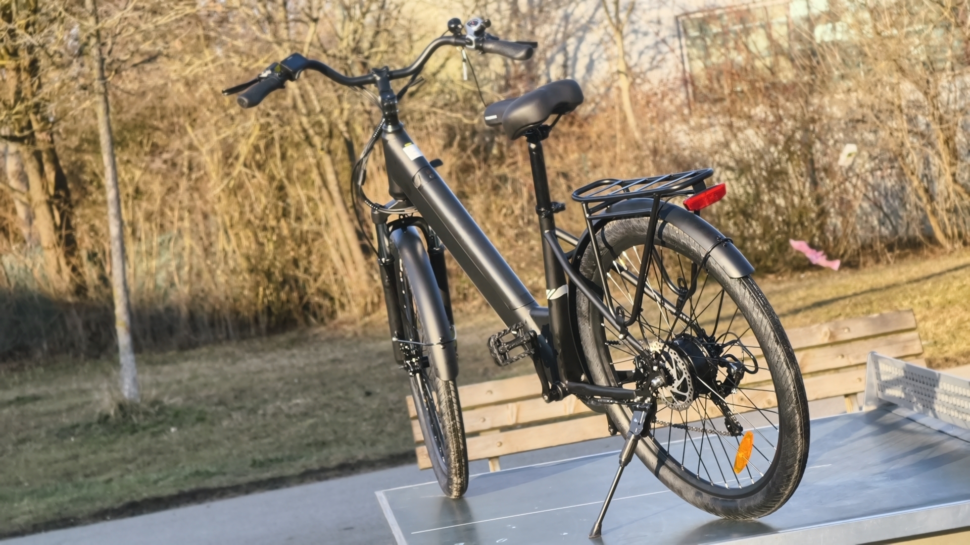 Der Stahlrahmen beherbergt einen integrierten, aber entnehmbaren Akku. Die aufrechte Sitzposition wird unterstützt durch den höhenverstellbaren Vorbau und den gebogenen Lenker. Ein stabiler Gepäckträger gehört zur Serienausstattung. Die 27,5-Zoll-Räder mit 2,1-Zoll-Reifen bieten gute Rolleigenschaften. Für sehr große Fahrer wirken die Räder allerdings etwas klein.