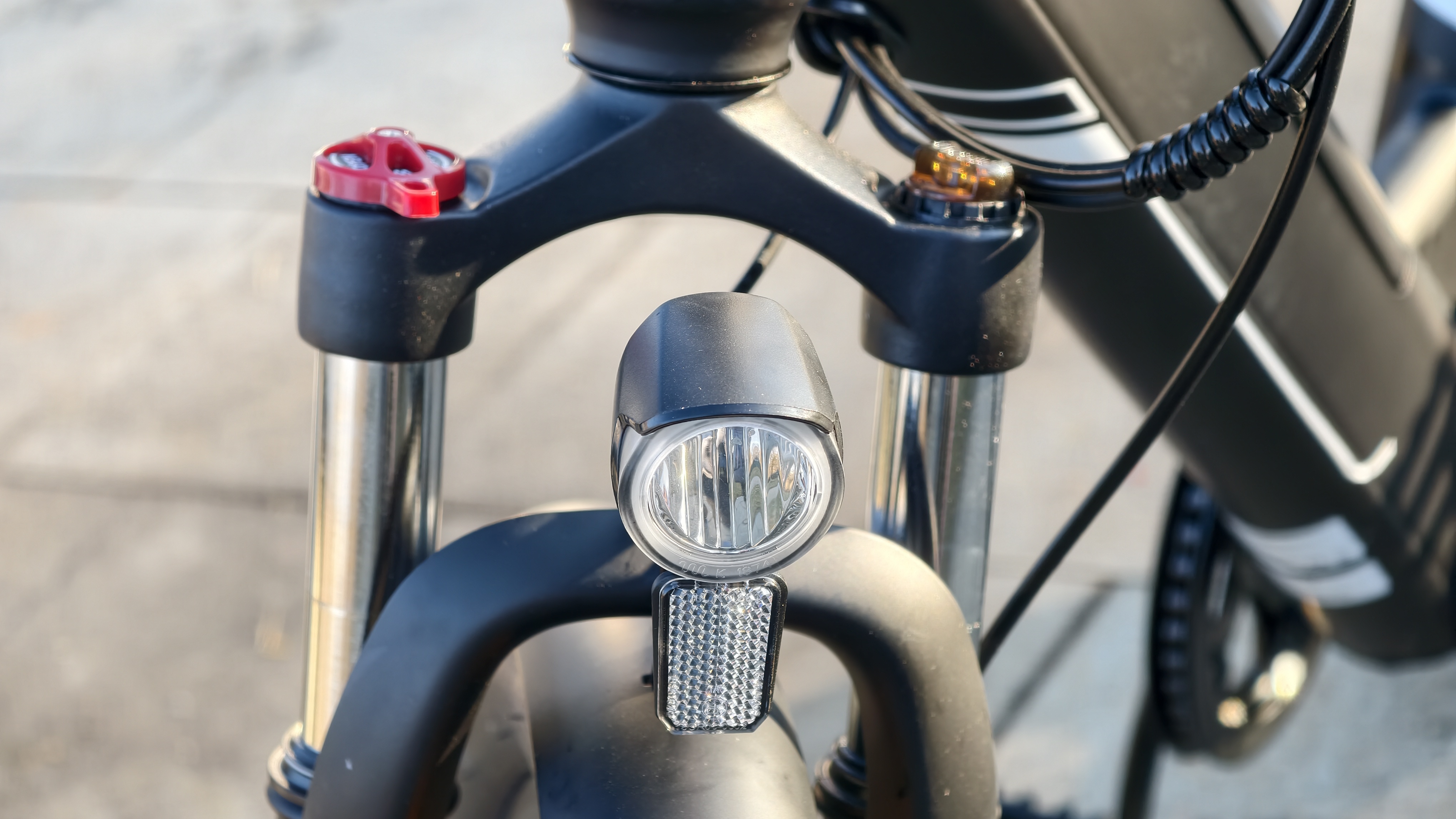 Die StVZO-konforme Beleuchtung vorn und hinten gehört zur Serienausstattung. Zum Gesehenwerden reicht sie aus. Die Helligkeit des Frontlichts ist allerdings zu schwach, um bei Dunkelheit die Straße gut auszuleuchten. Wer viel bei Nacht fährt, sollte nachrüsten. Das Rücklicht kommt ohne Bremslichtfunktion – hier bieten Modelle wie das Engwe L20 3.0 Pro (Testbericht) mehr Sicherheit.