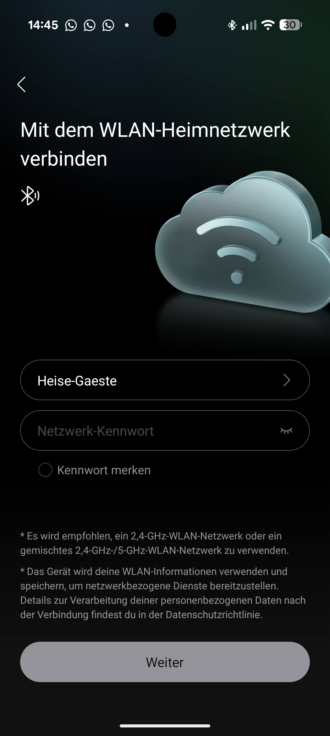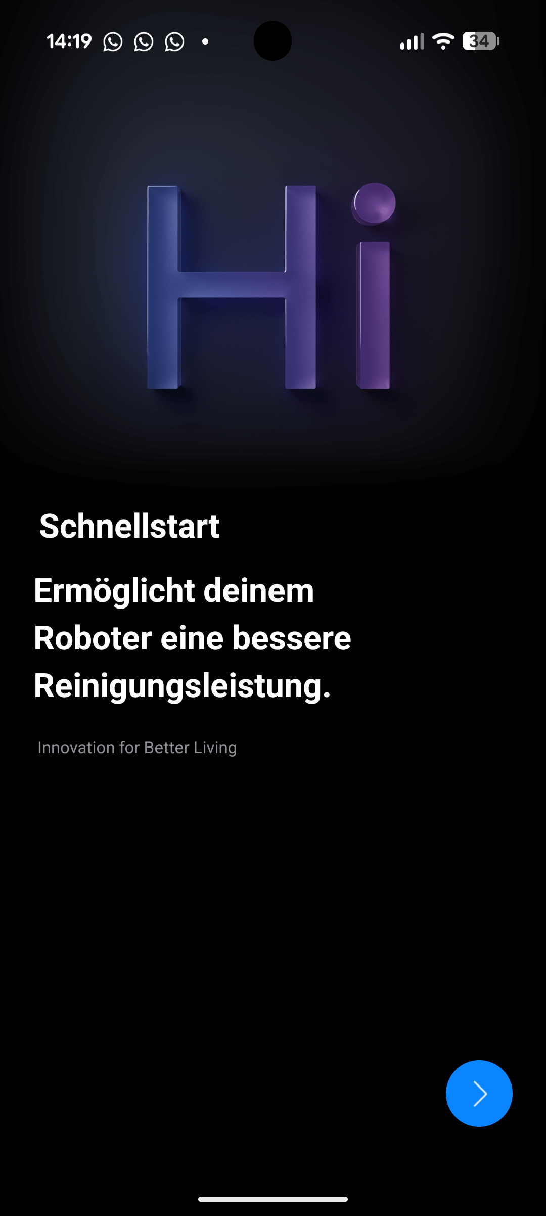 Die Einrichtung folgt dem üblichen Schema für Saugroboter. Zunächst meldet man sich in der Roborock-App an und scannt den QR-Code am Roboter. Danach gewährt man der App die benötigten Berechtigungen für Standort und Umgebungssuche und versetzt den Roboter durch gleichzeitiges Drücken der Home- und Power-Taste in den Pairing-Modus. Anschließend richtet man das WLAN ein – unterstützt wird ausschließlich das 2,4-GHz-Band.